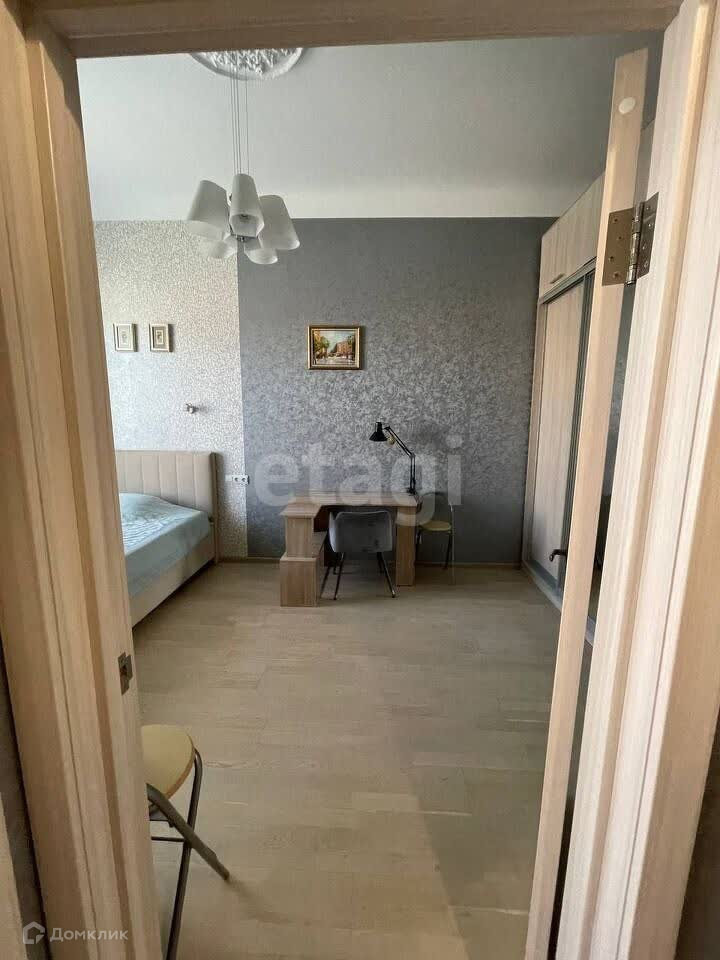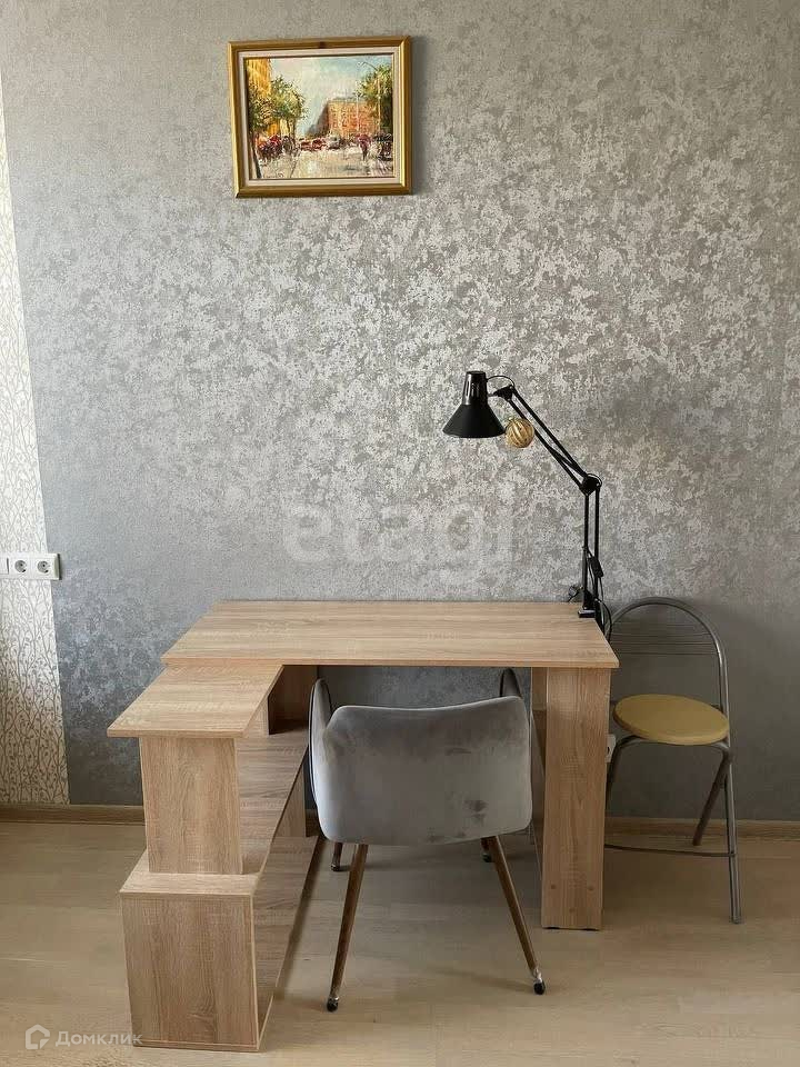 В комнате имеется большой шкаф--купе, двуспальная кровать, стеллаж и стол с лампой для работы за ноутбуком и с документами.