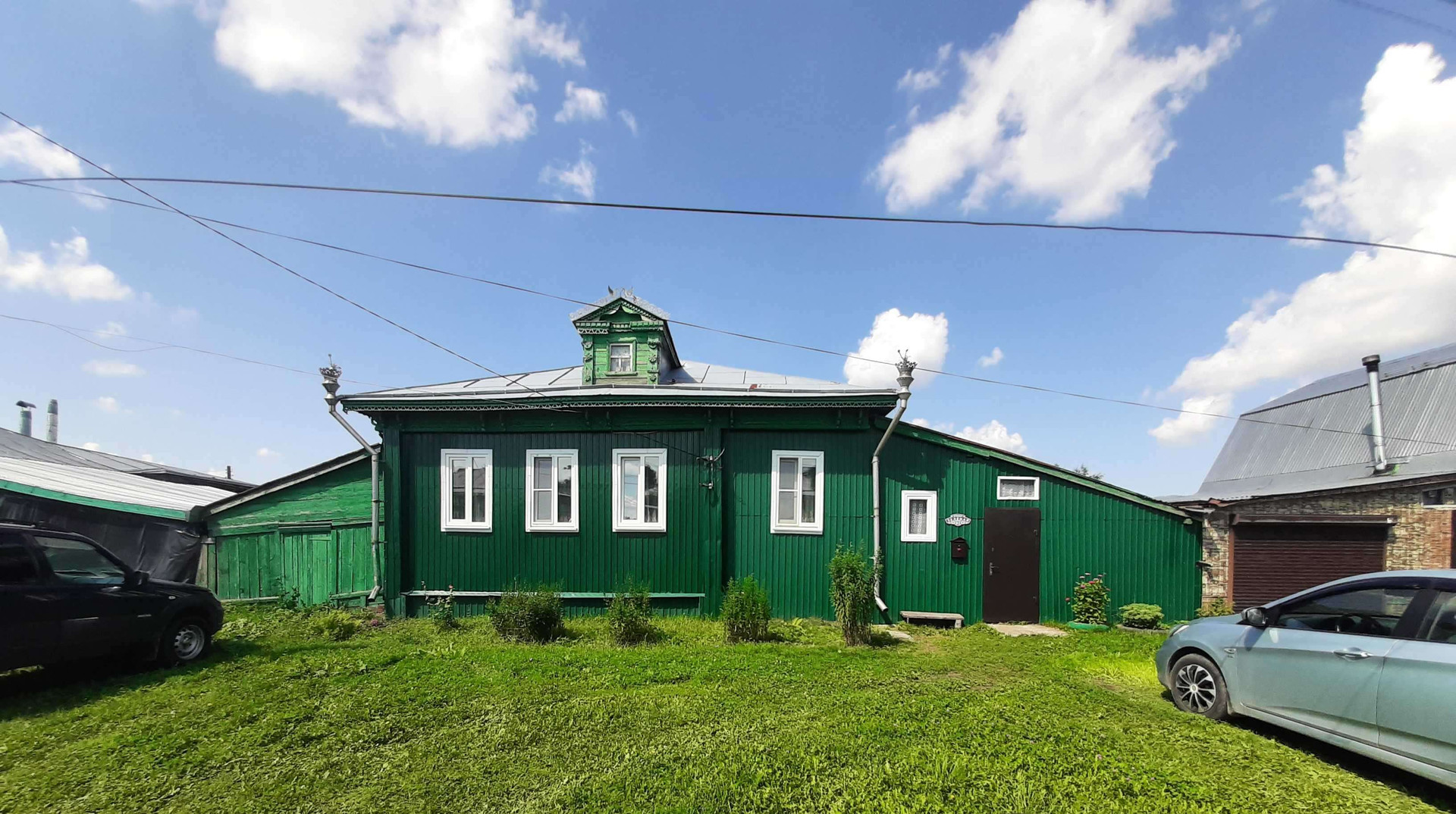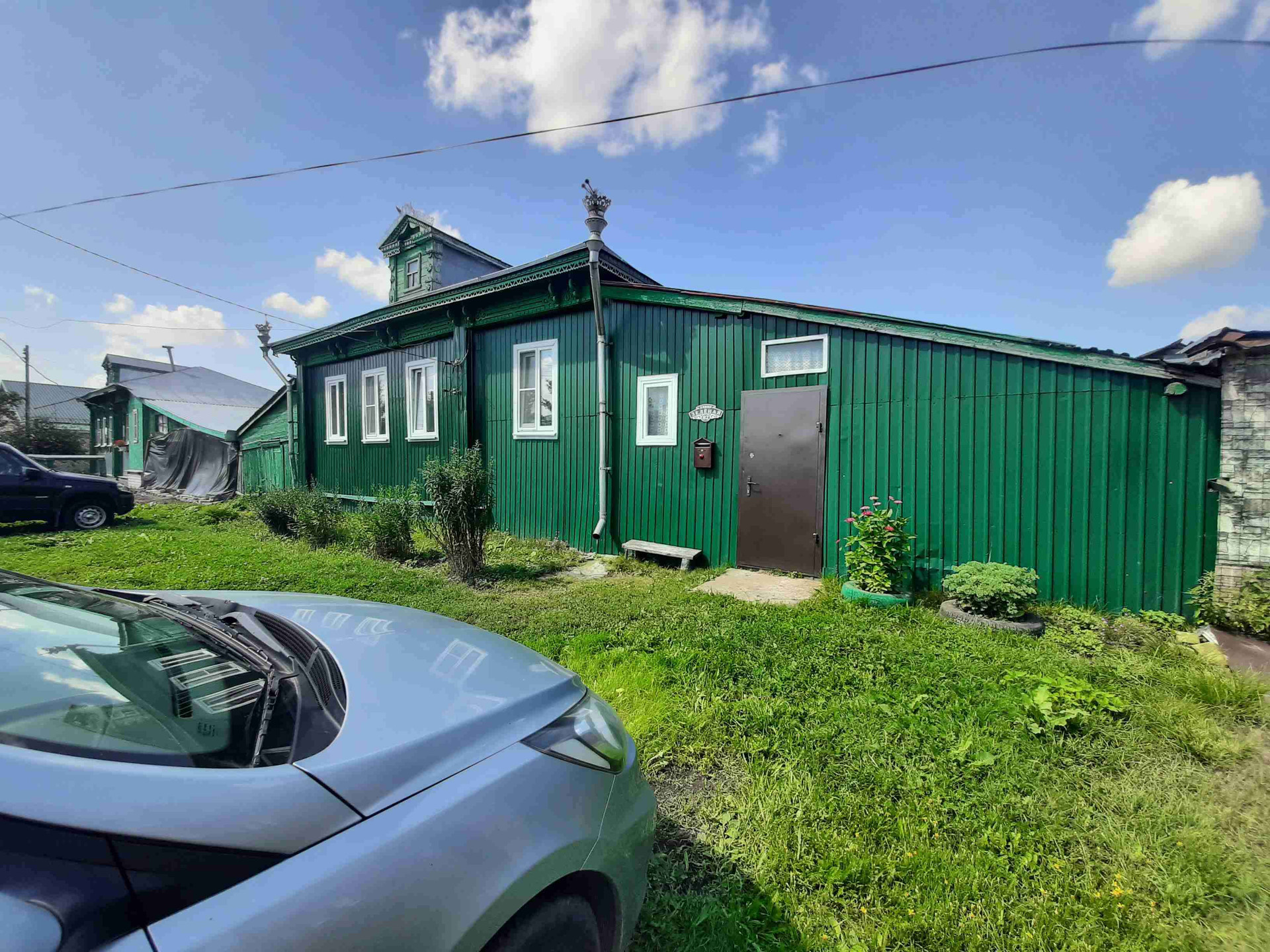 Перед домом большая зелёная лужайка и удобный подъезд в любую погоду.