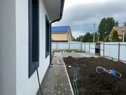 Участок 6 соток, правильной формы, огорожен профлистом, вокруг дома отмостка, тротуарные дорожки и парковка для автомобиля в плитке, подъездная дорога асфальтирована.