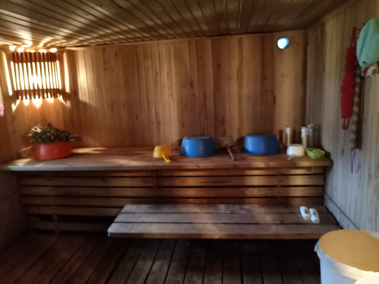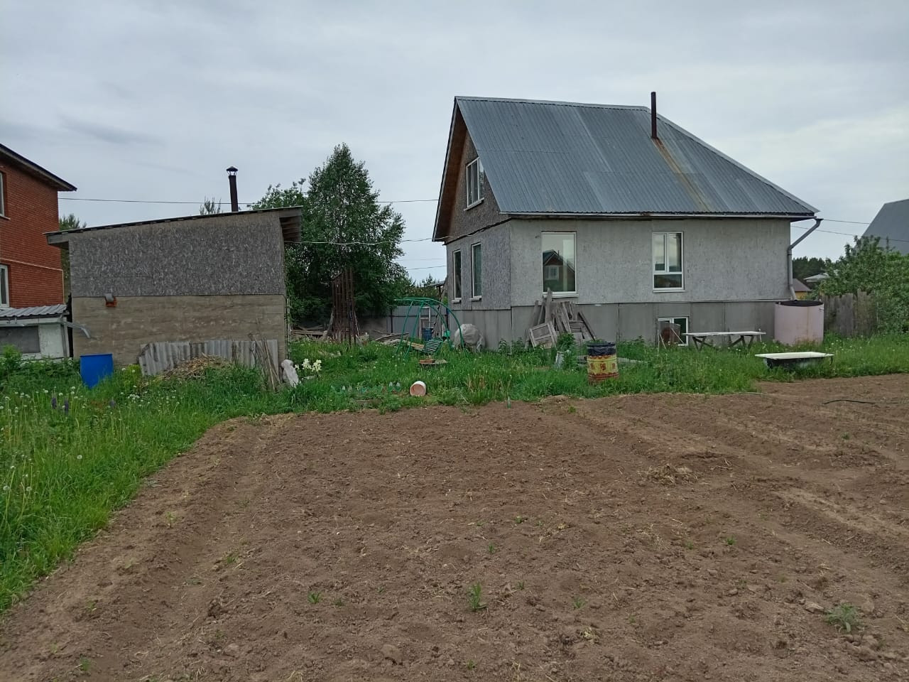 Во дворе есть блочная банька, теплица из поликарбоната 3*8, место для отдыха