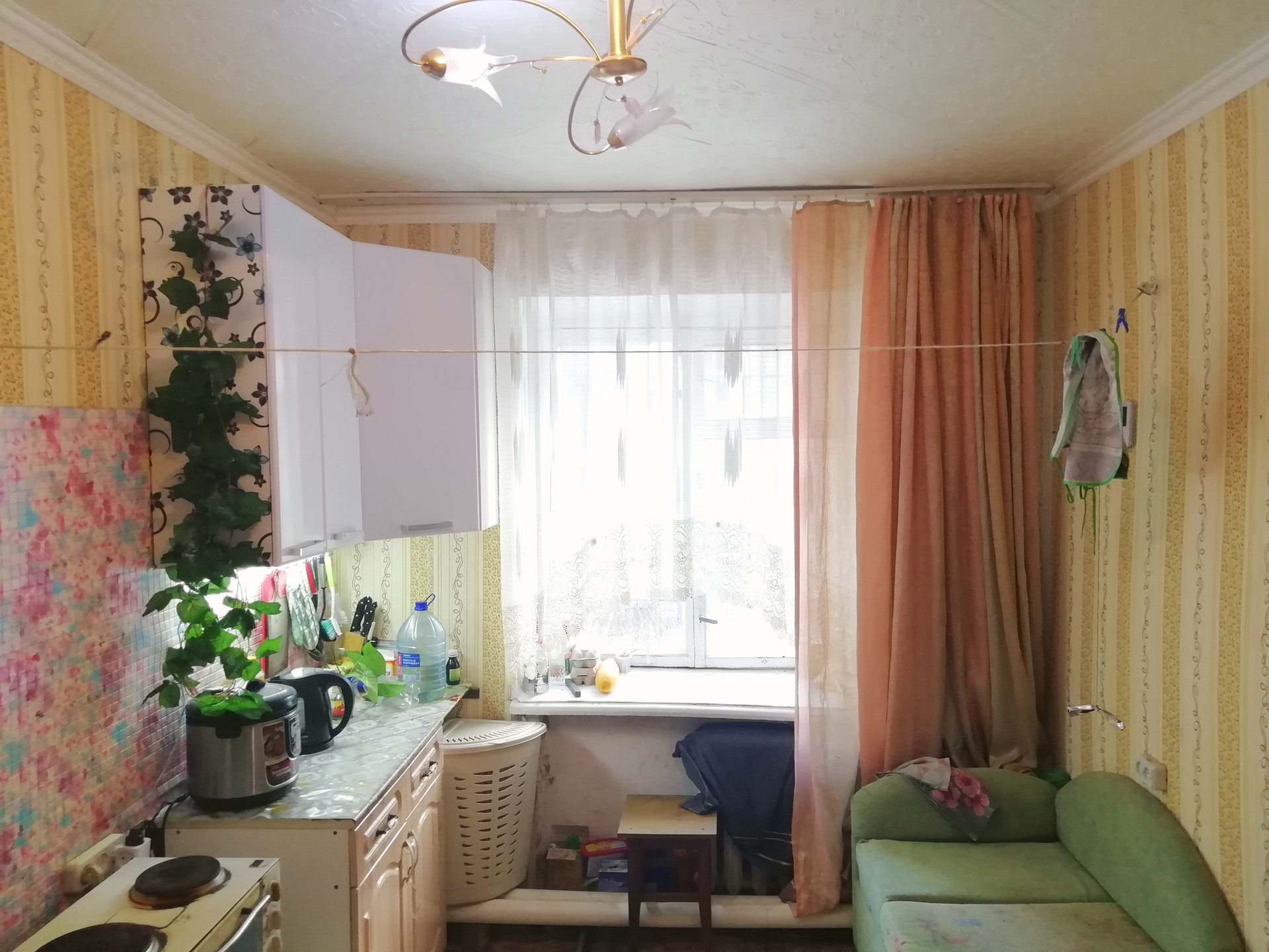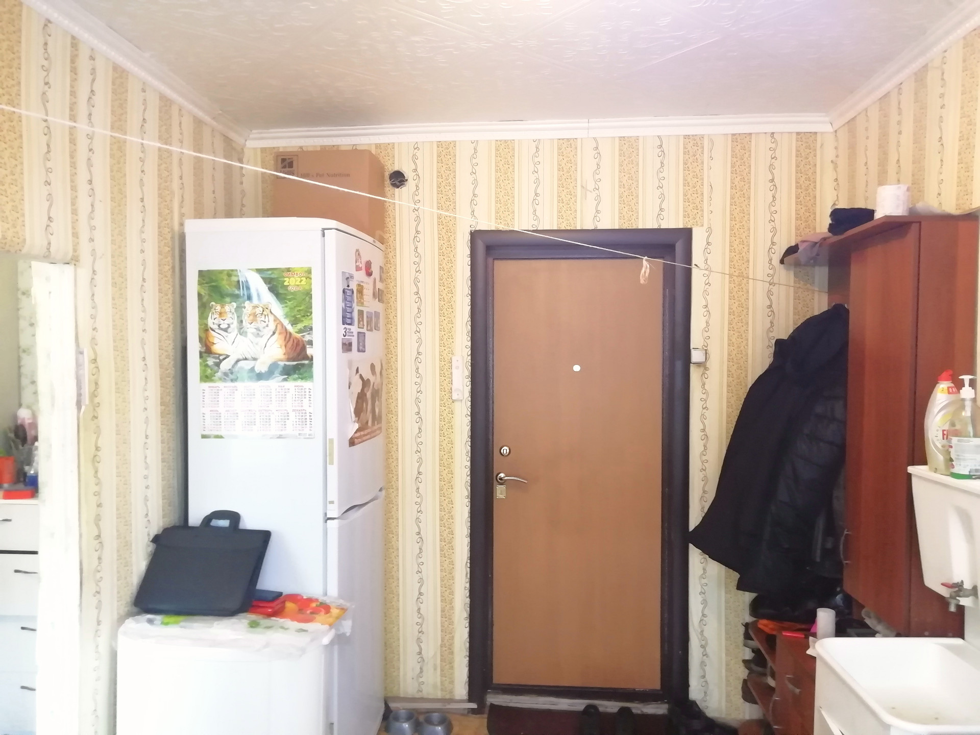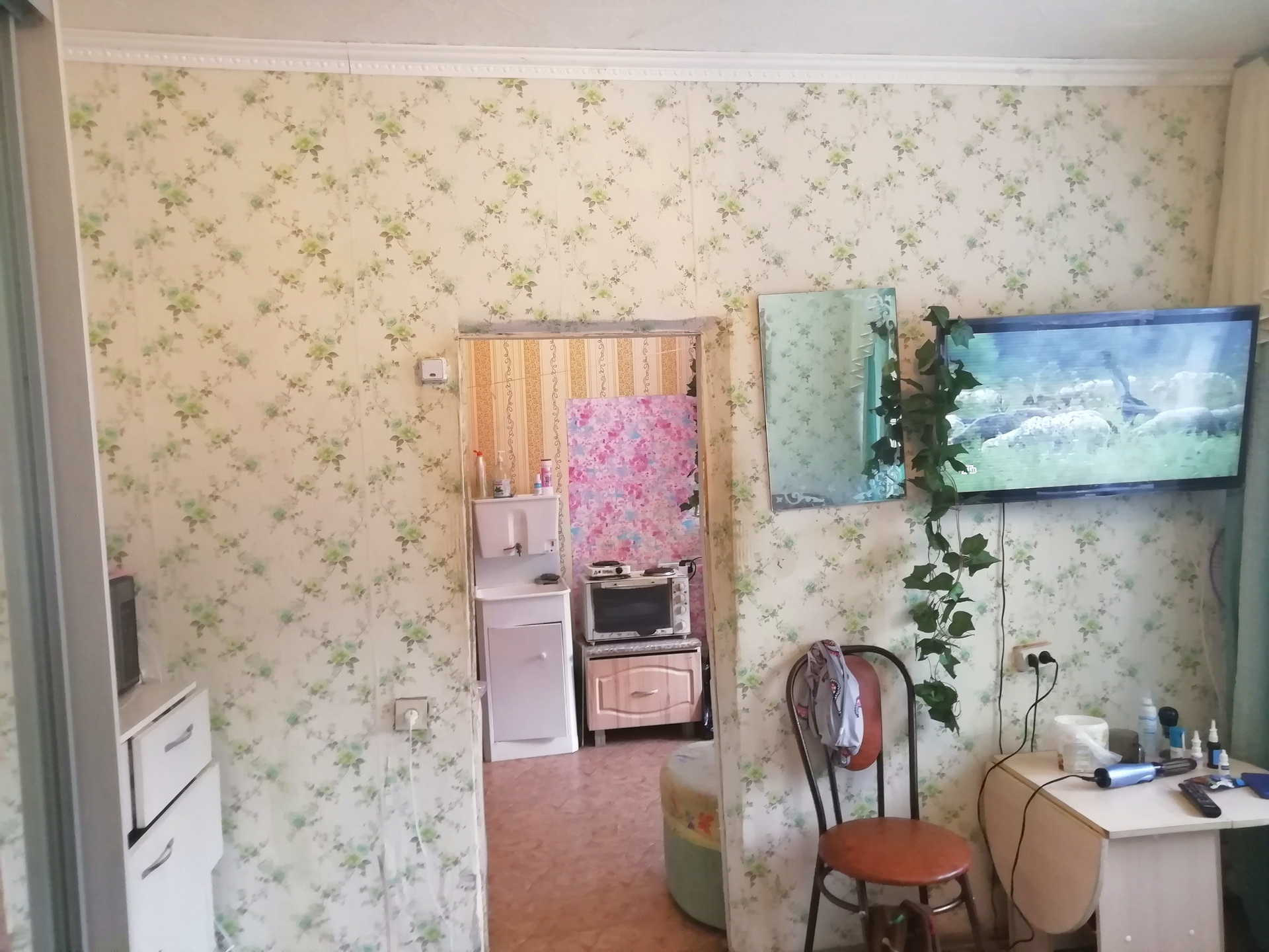 Качественная железная входная дверь. Есть зонирование:одна часть под кухню, другая комната отдыха. На потолке плитка(потолочная), на полу линолеум.