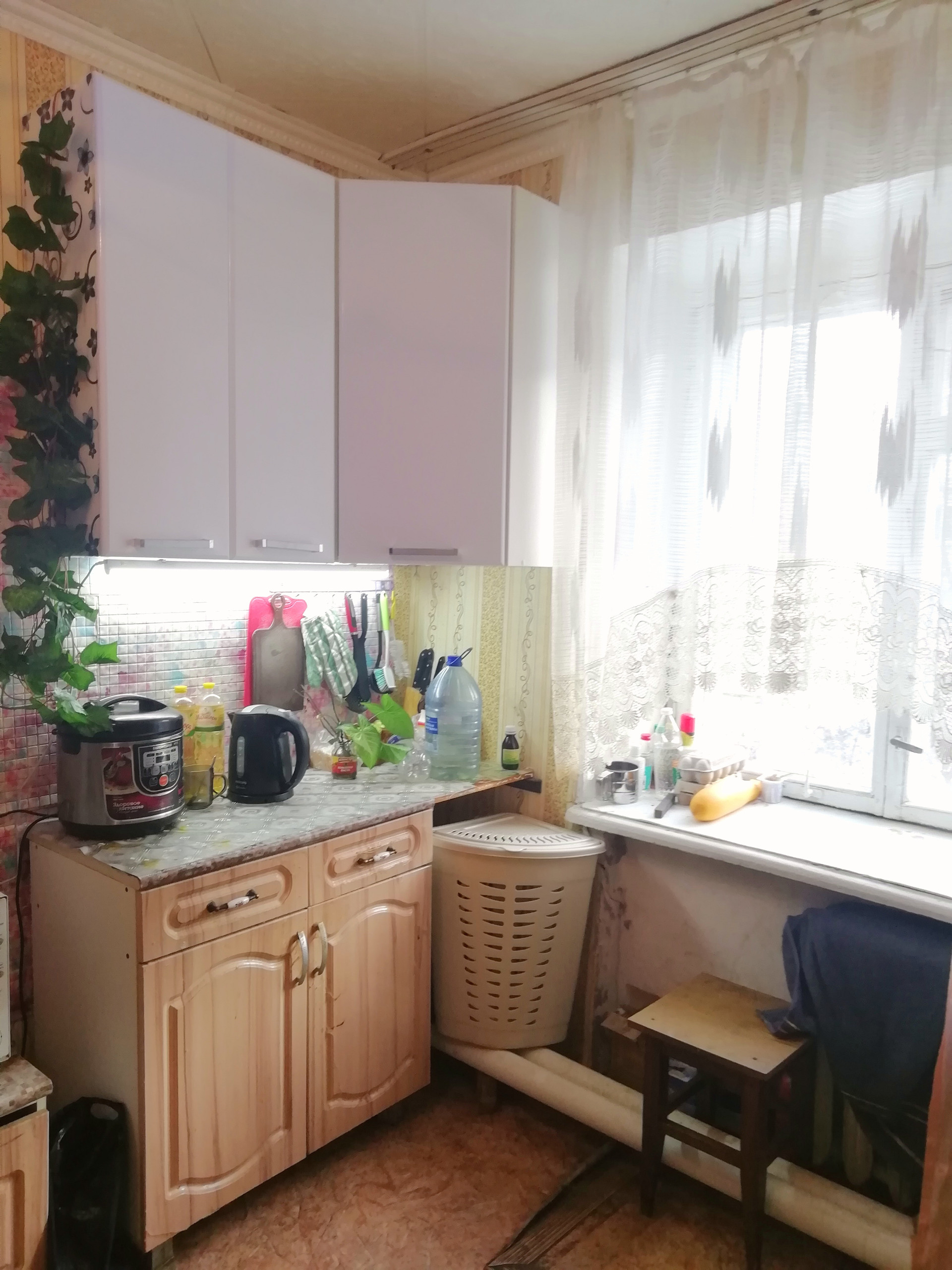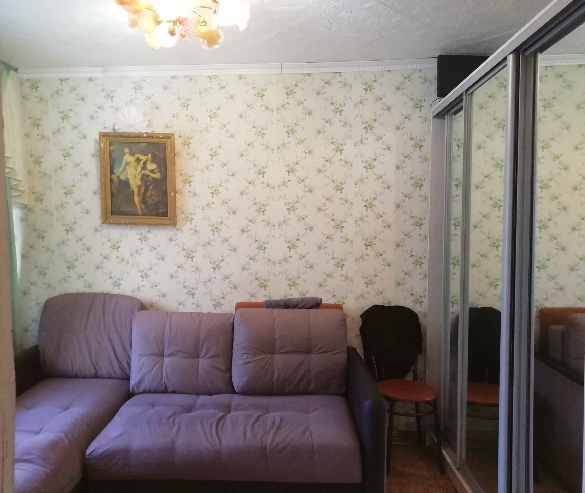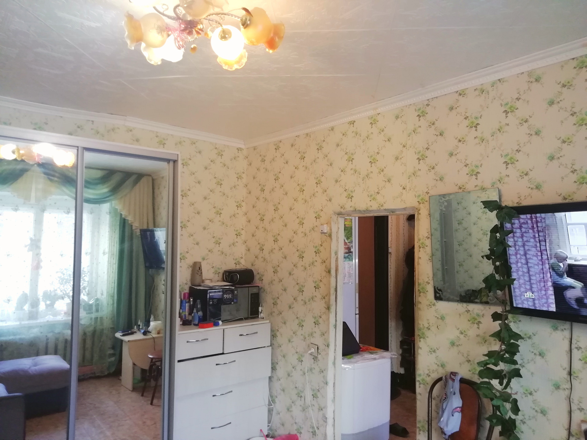 Качественная железная входная дверь. Есть зонирование:одна часть под кухню, другая комната отдыха. На потолке плитка(потолочная), на полу линолеум.