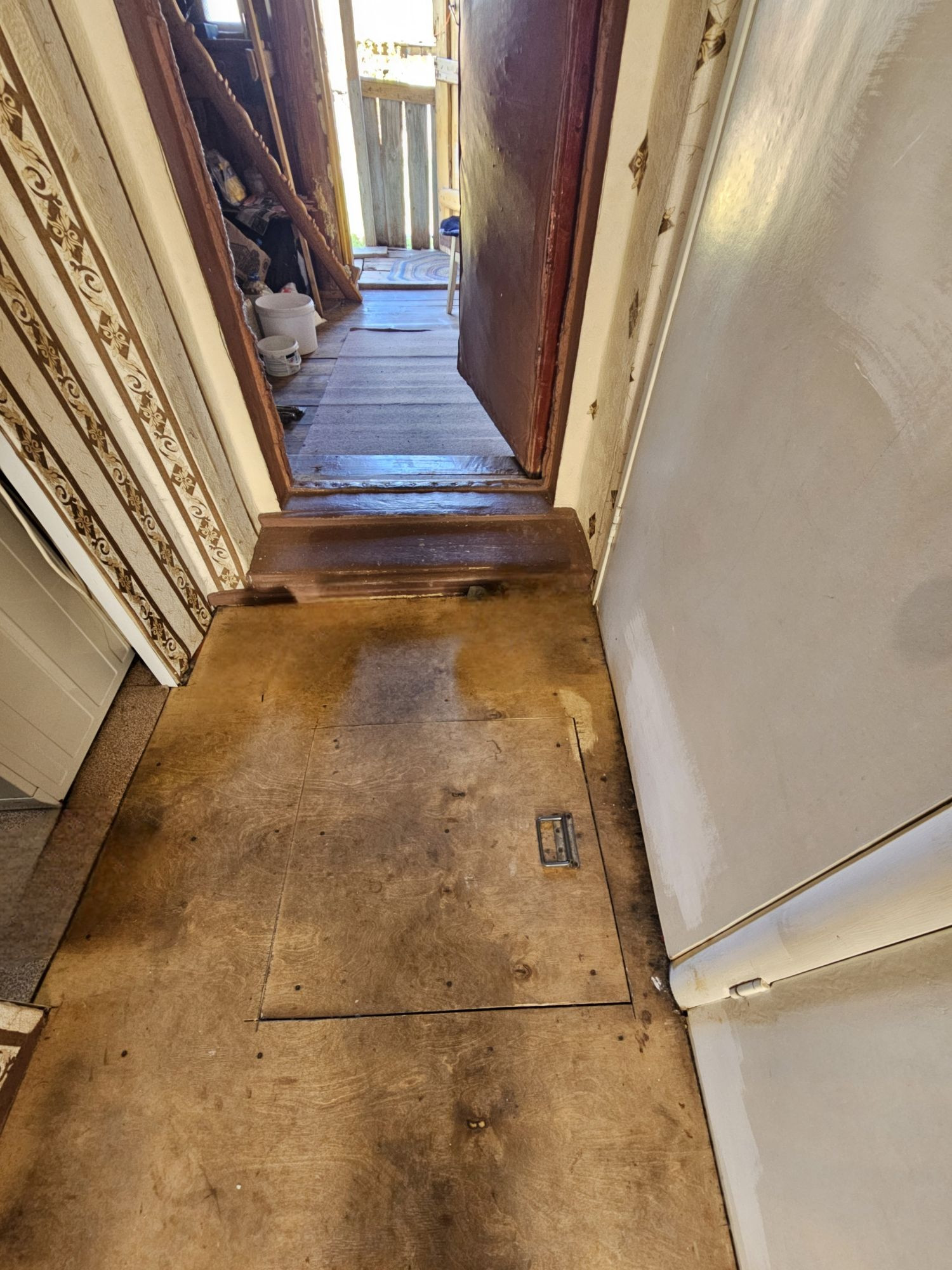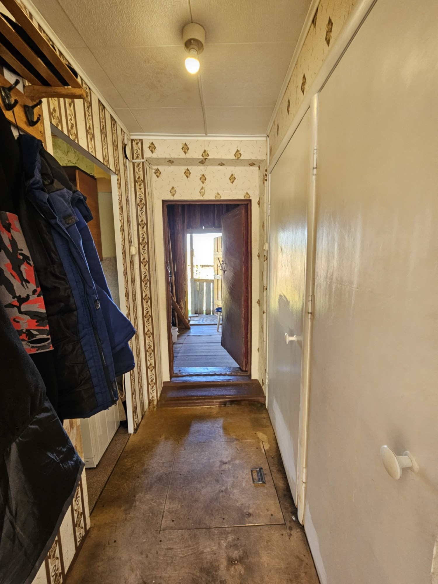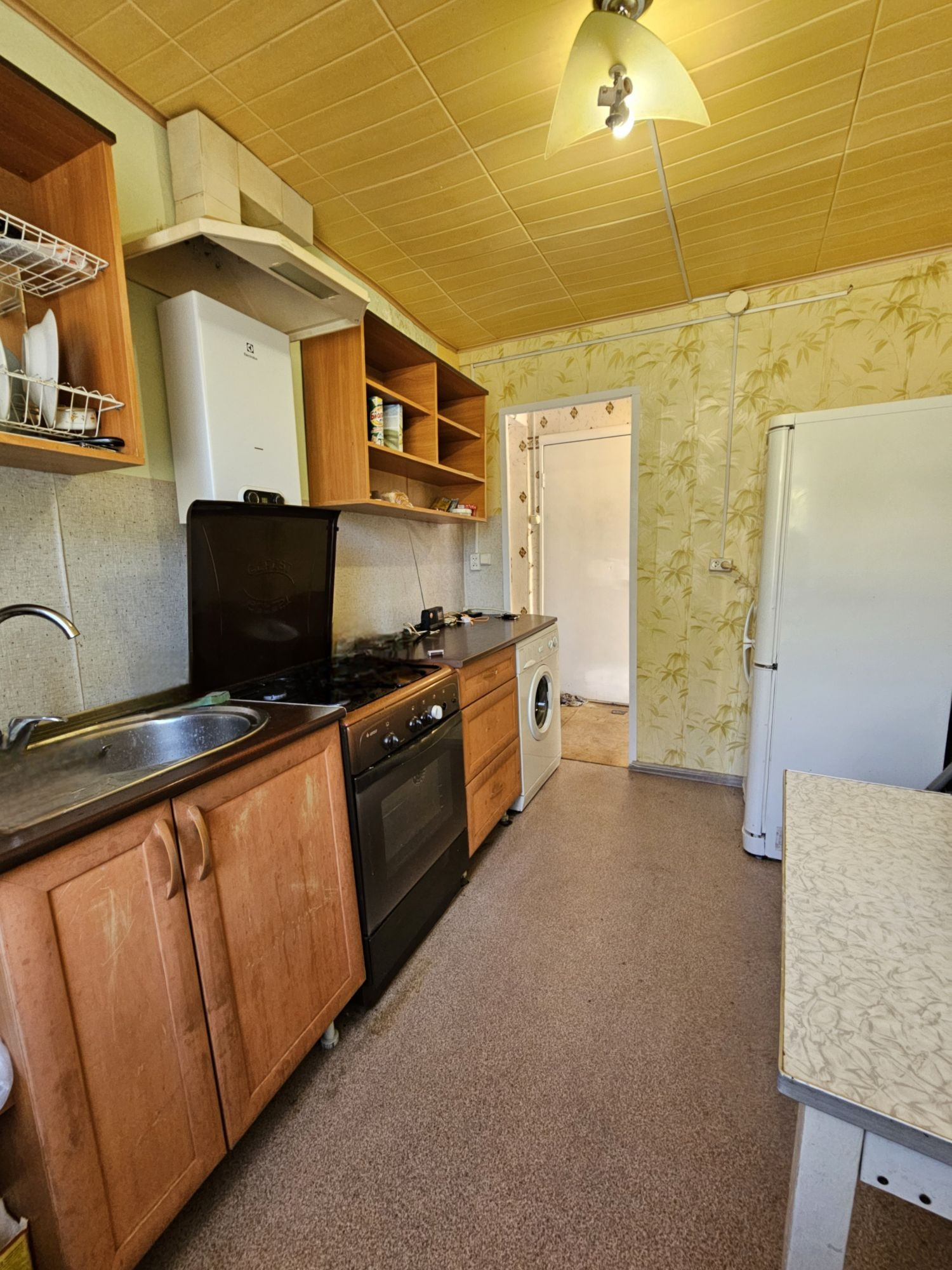 Квартира в хорошем состоянии. Из удобств проведено: холодная вода, горячая вода, электричество, газ, канализация (путем вывоза заказной машиной из колодца). Остаётся кухонный гарнитур. В квартире имеется подполье (выход из коридора). Перед входом в квартиру имеется тамбур состоящий из свободного размещения вещей, огороженной части и всё это под замком. Вход в квартиру отдельный от всех. В дворовой части много свободного места, можно разместить кладовку или баню. Из двора есть выход на участок 2 сотки, закрепленного за этой квартирой.