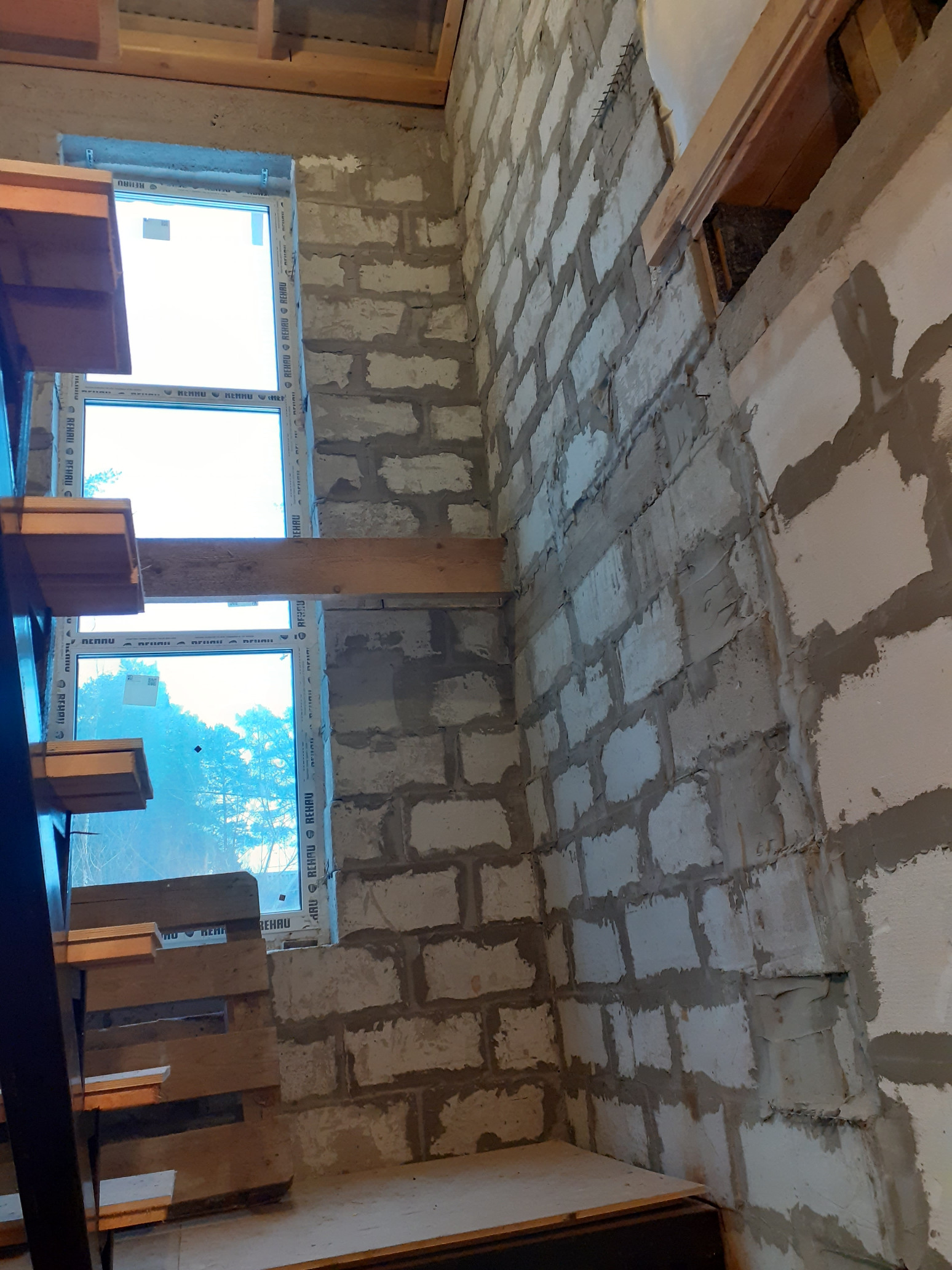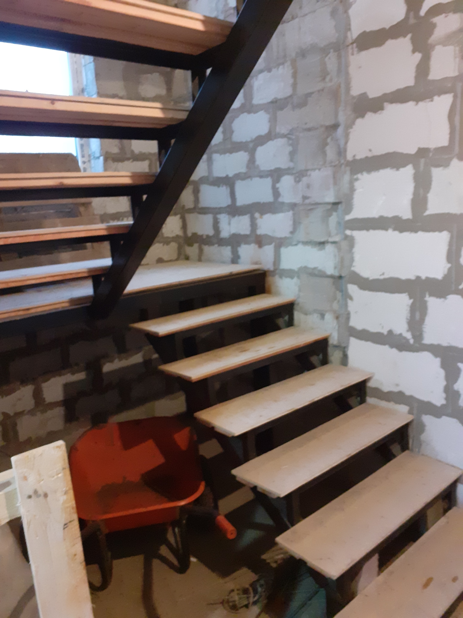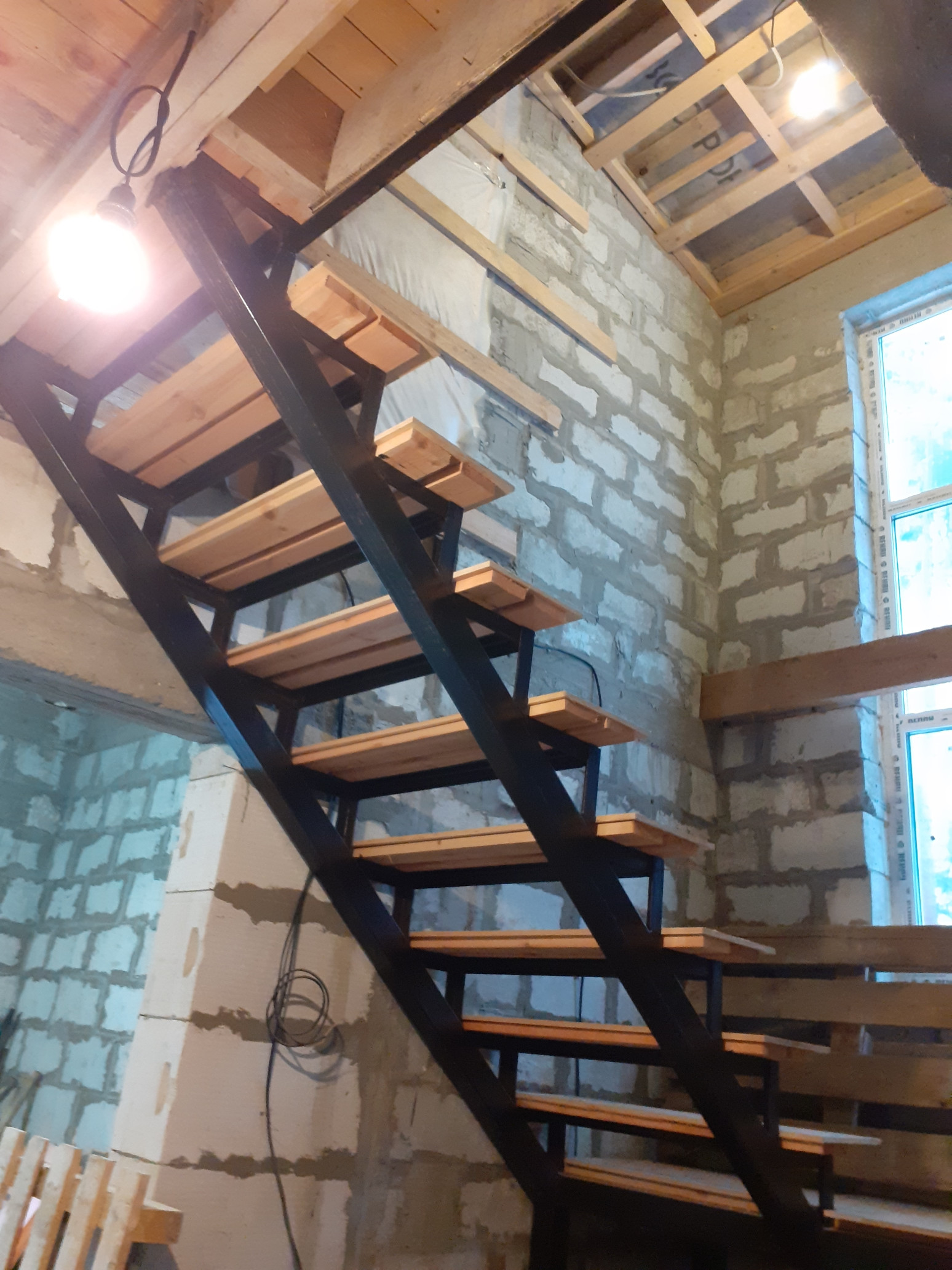 Железная лестница на 2 этаж проходит в красивом эркерном выступе с окнами.