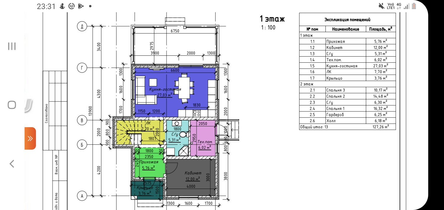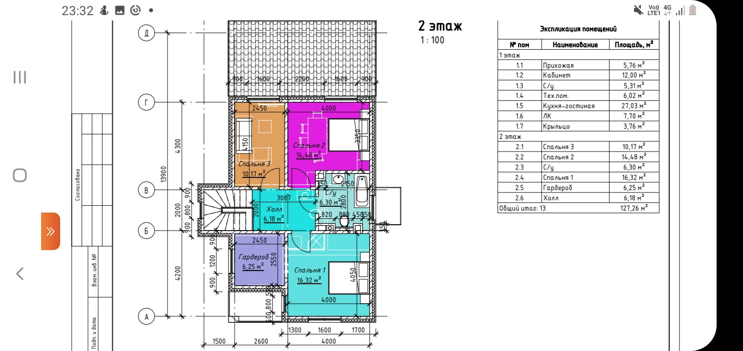 На первом этаже: прихожая 5,8 кв.м, комната - 12 кв.м, кухня-гостинная 27 кв.м, санузел 5,3 кв.м, техническое посещение со входом со стороны улицы, на втором этаже - 3 отдельные спальни: 16,3 кв.м с дополнительным помещением - гардеробной 6,3 кв.м, из этой же спальни - выход на балкон), 10,2 кв.м, 14,5 кв.м, санузел - 6,3 кв.м, холл - 6,3 кв.м. Из гардеробной сделан выход под крышу.