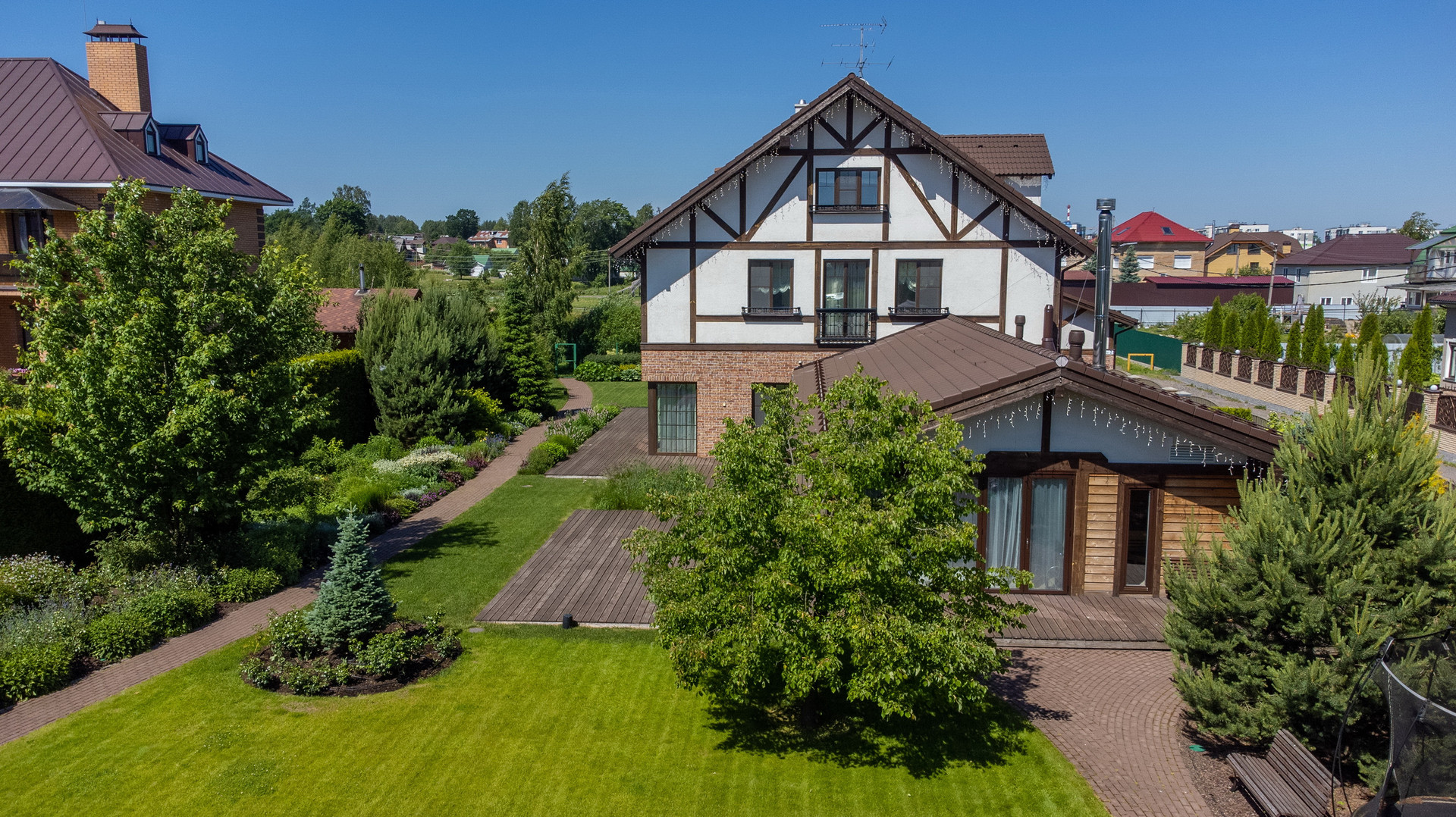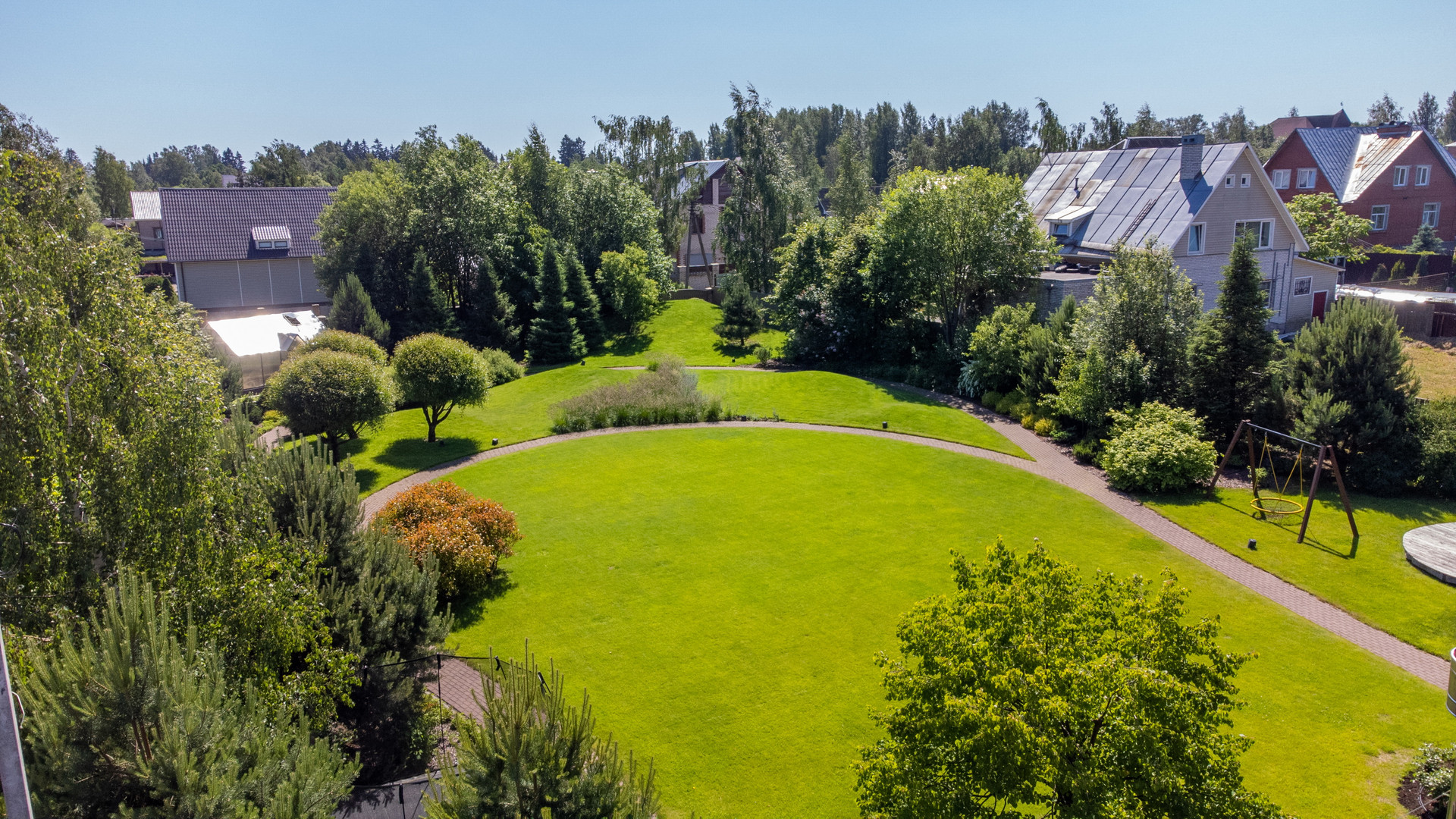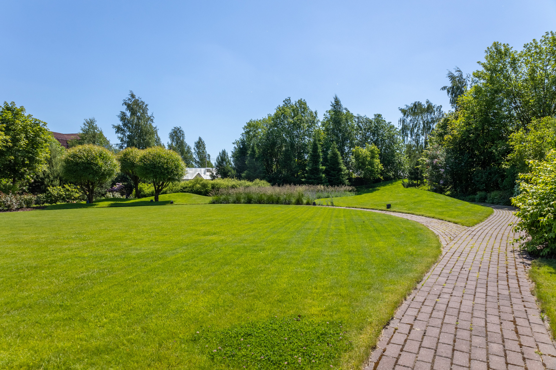 Авторский ландшафтный проект компании Аквилегия позволил реализовать гармоничный пейзажный сад-парк с геопластикой, американской системой автополива и богатой коллекцией декоративно-лиственных, хвойных растений, плодовыми деревьями, миксбордерами. Вы сможете украшать на новогодние праздники прекрасную пышную и высокую сербскую ель, высаженную напротив окон гостиной.
