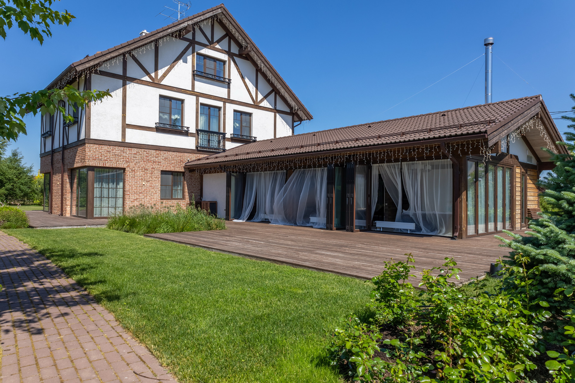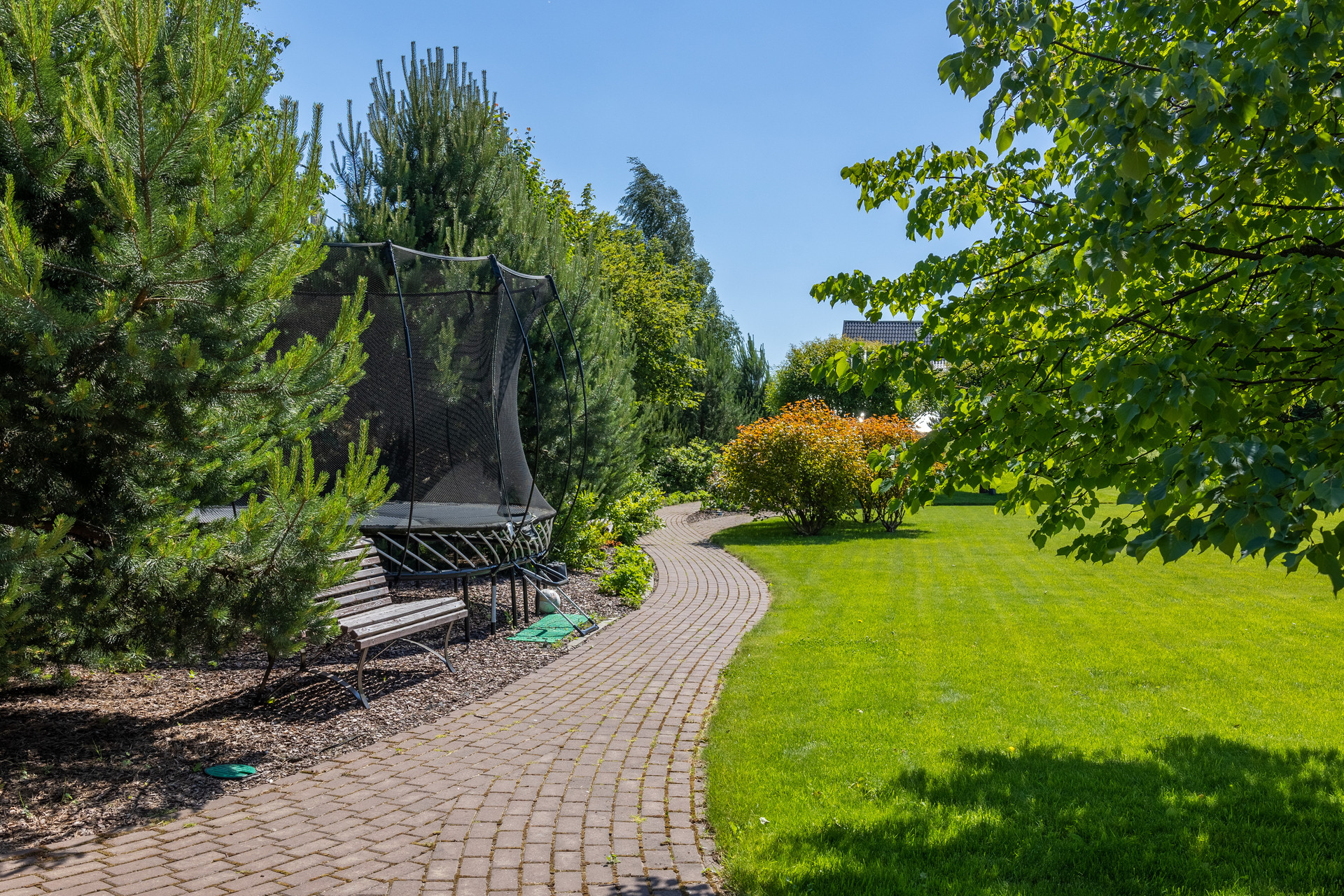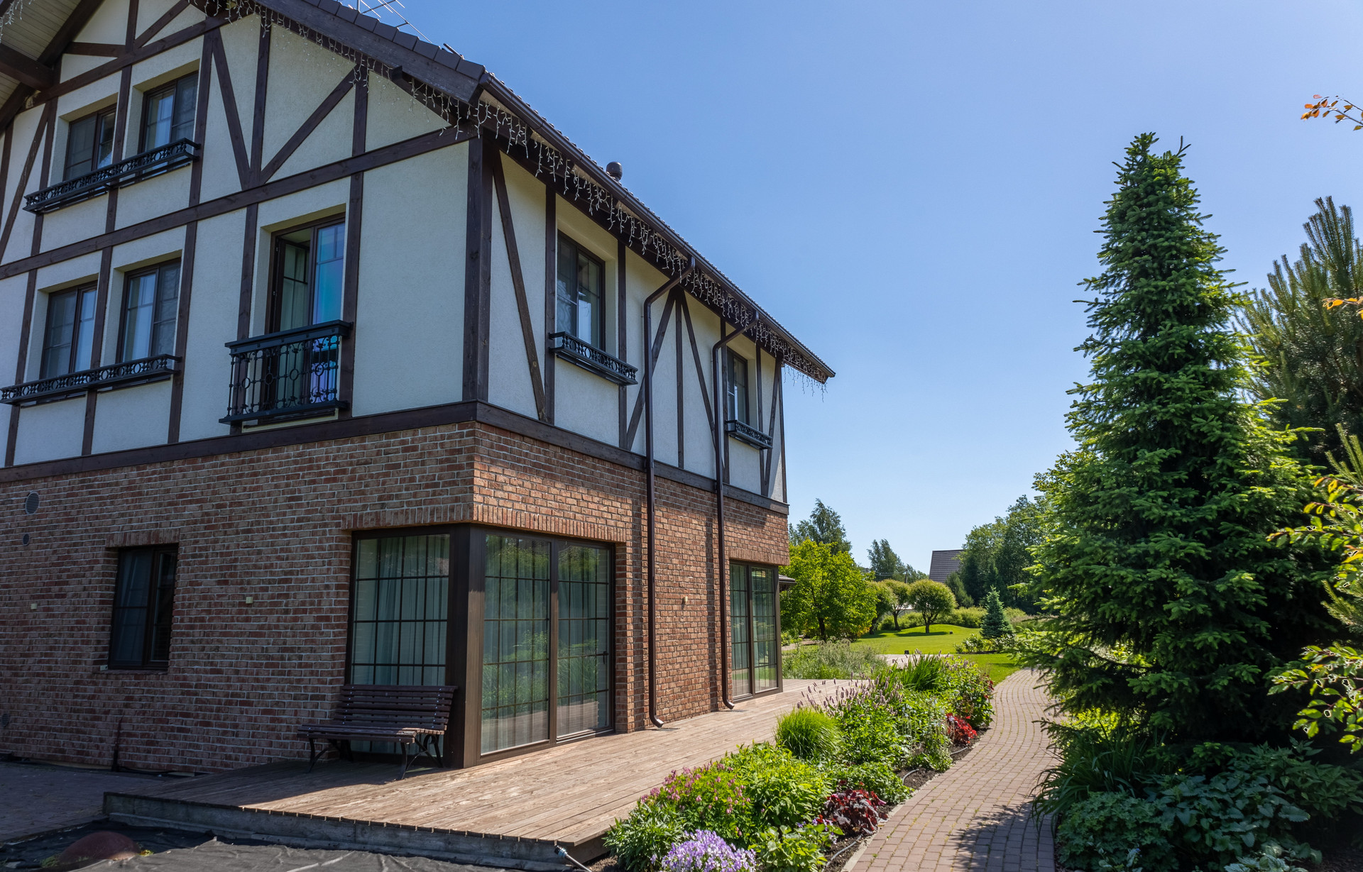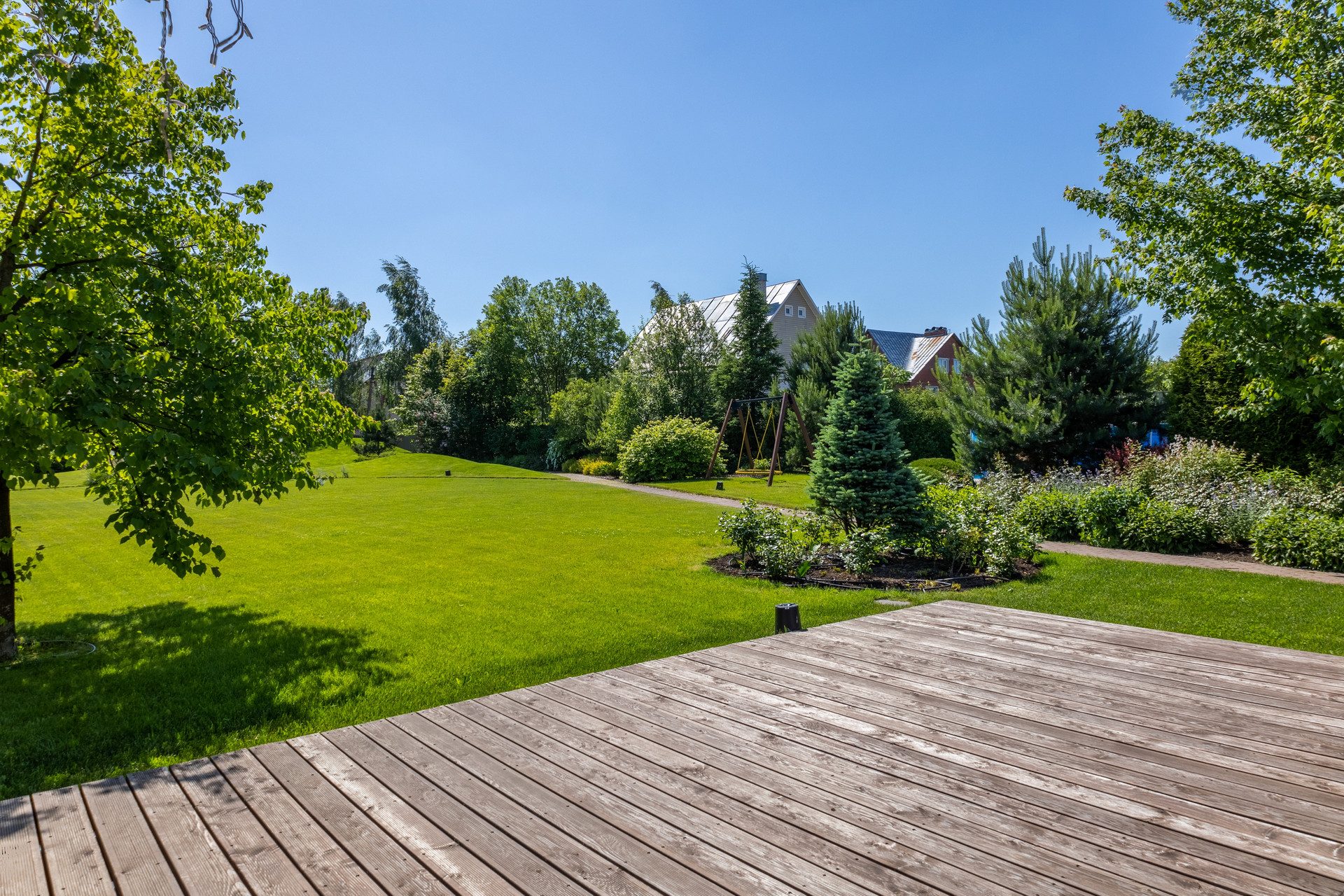 Авторский ландшафтный проект компании Аквилегия позволил реализовать гармоничный пейзажный сад-парк с геопластикой, американской системой автополива и богатой коллекцией декоративно-лиственных, хвойных растений, плодовыми деревьями, миксбордерами. Вы сможете украшать на новогодние праздники прекрасную пышную и высокую сербскую ель, высаженную напротив окон гостиной.