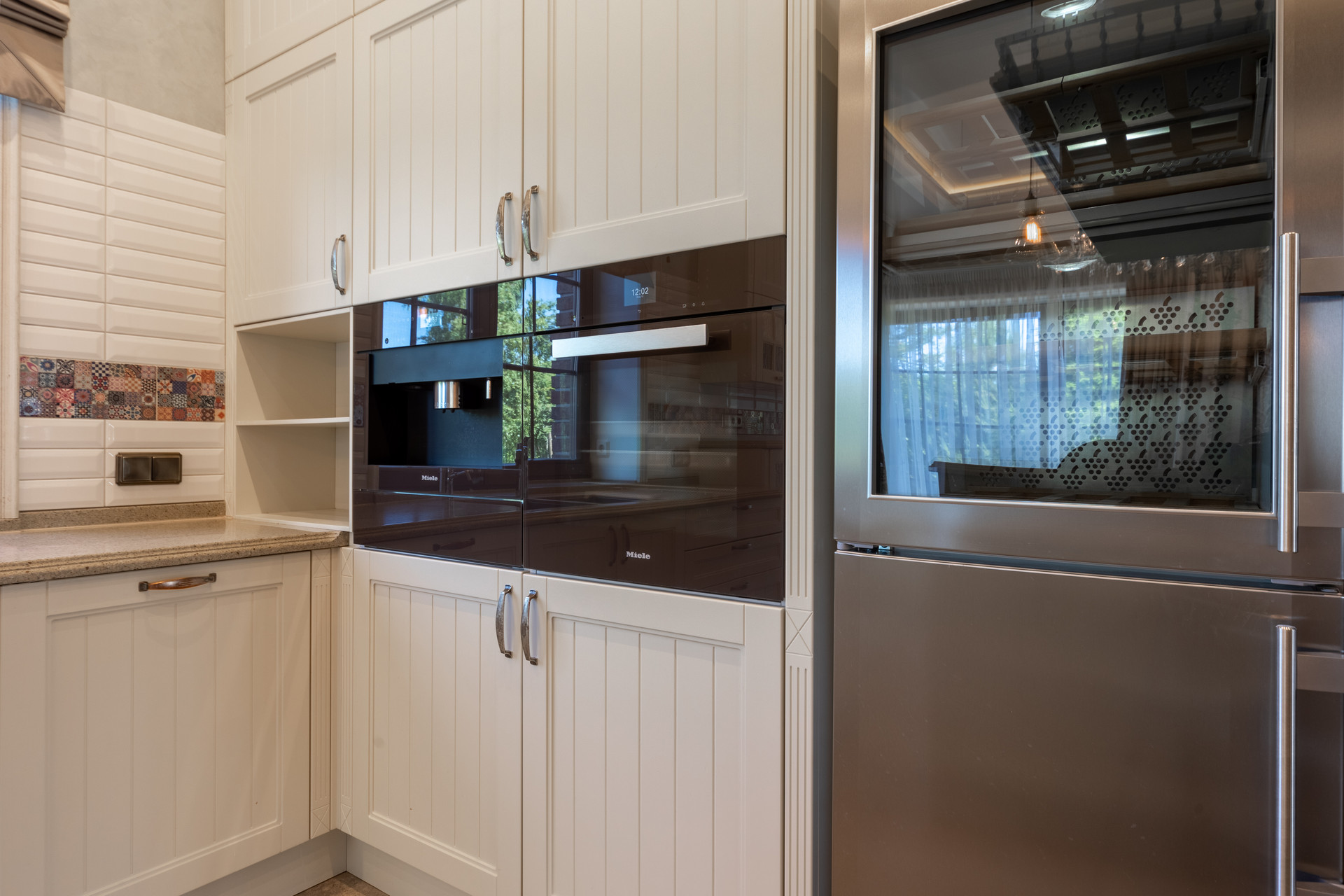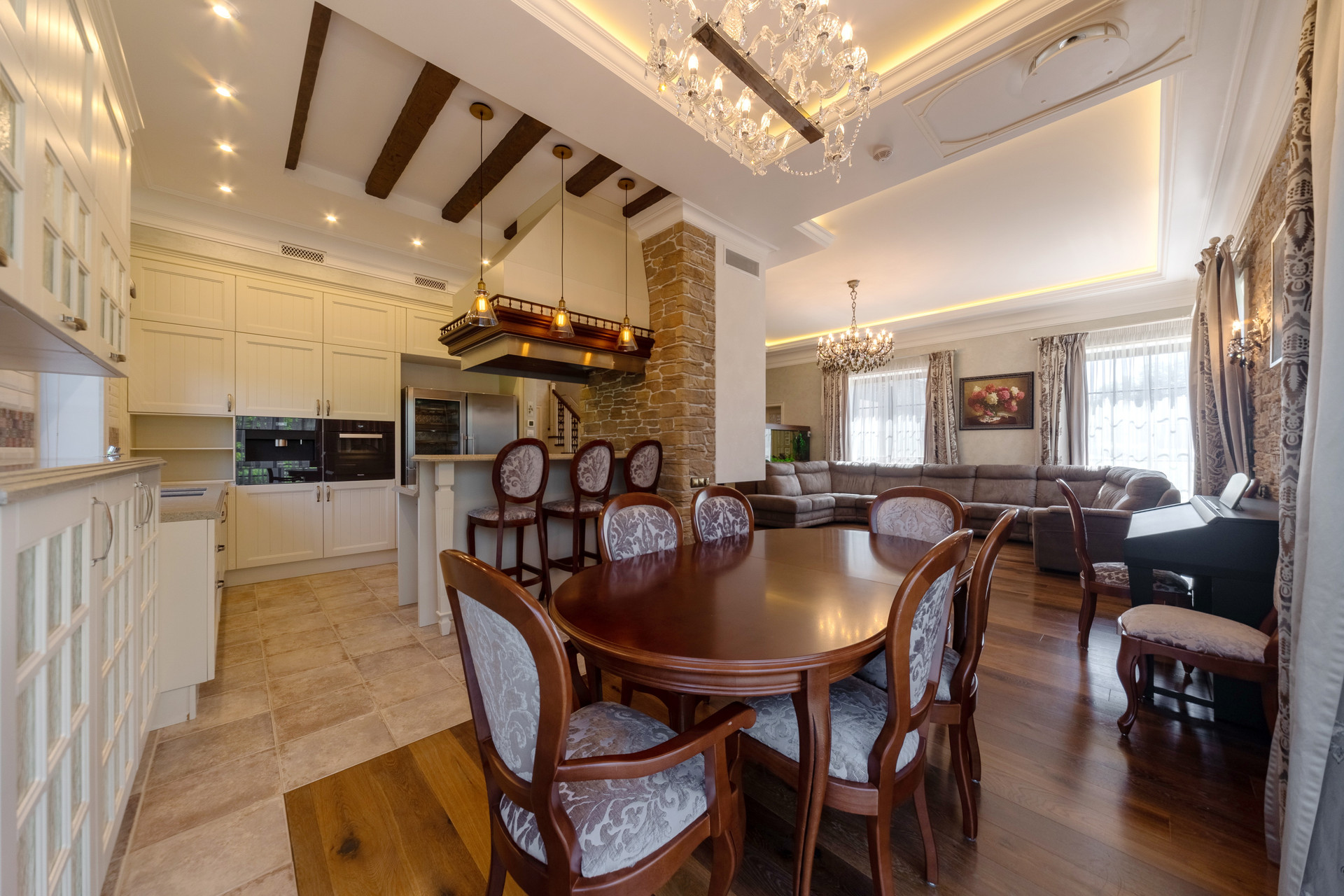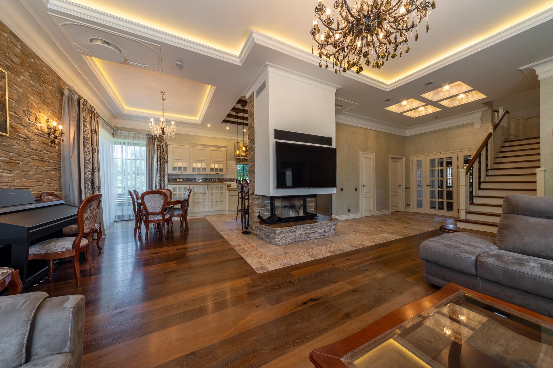 На первом этаже расположена просторная кухня-гостиная с большим диваном для всей семьи и гостей, дровяным камином и эксклюзивной авторской акустикой (звук 360), а также: кухонной мебелью производства Испании, оснащенной бытовой техникой Miele и Liebherr, установлен сенсорный ионизатор воды Tyent c регулировкой Ph, варочная панель домино с конфоркой wog и практически бесшумная профессиональная рестораннач вытяжка, сделанная на заказ.