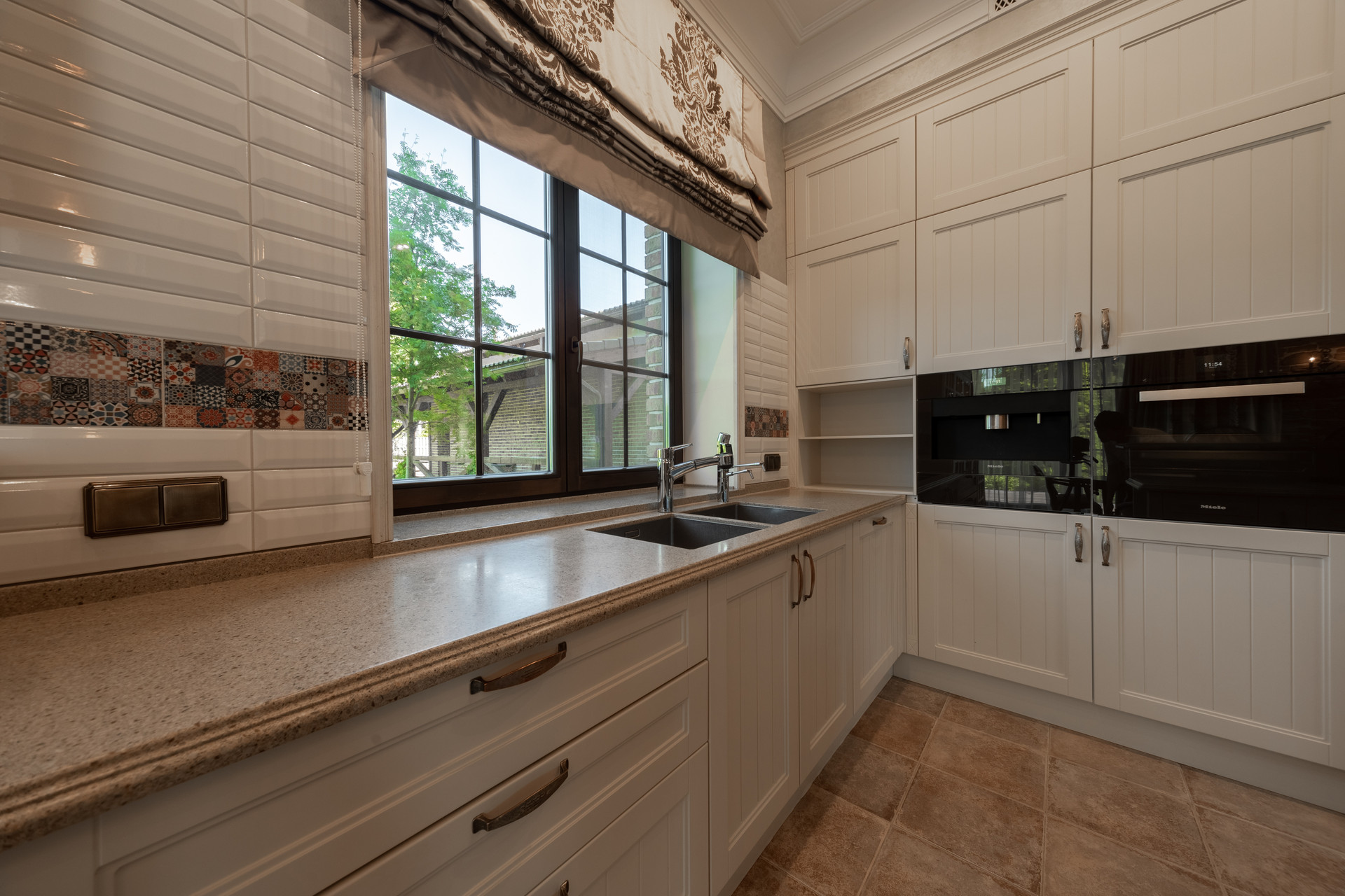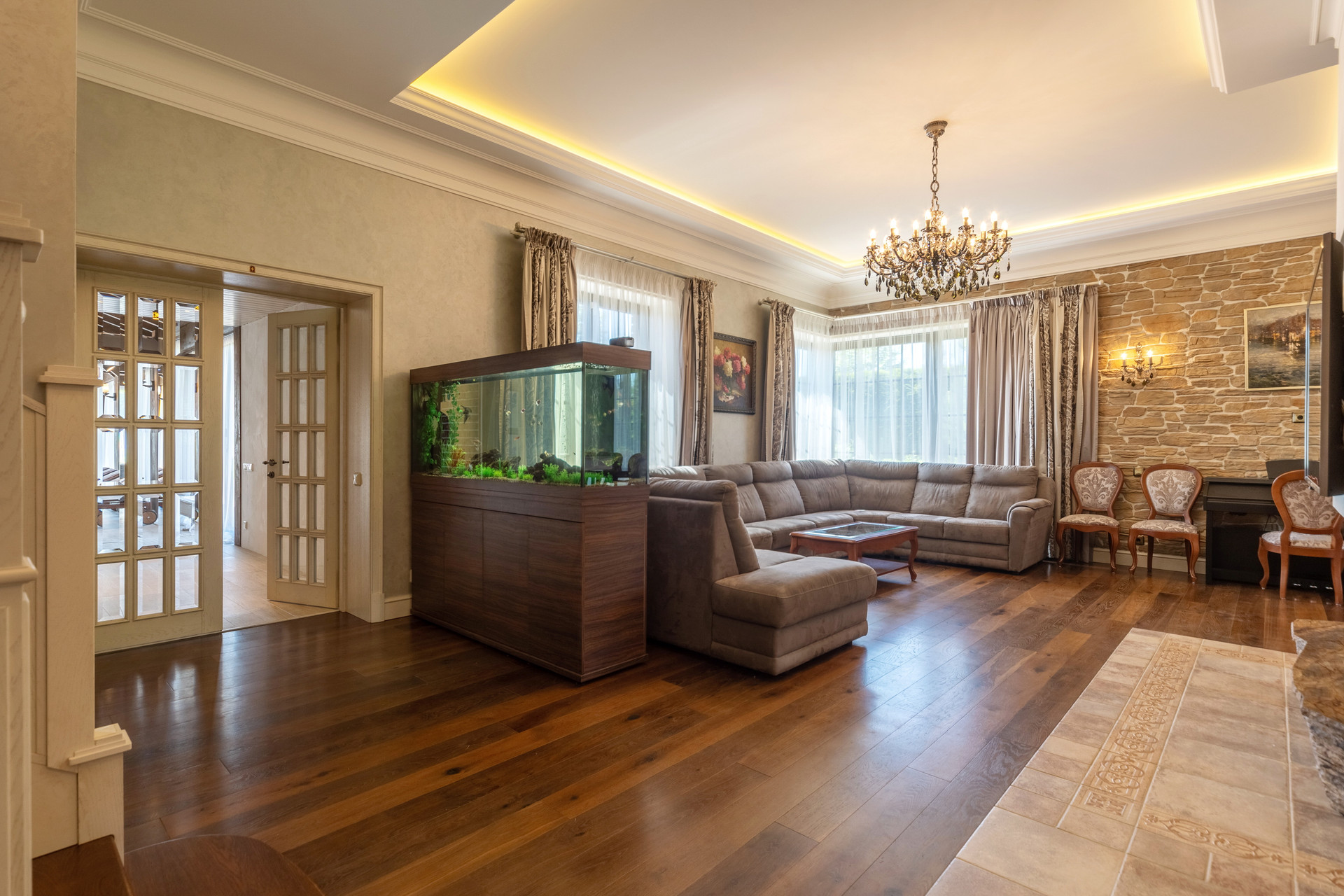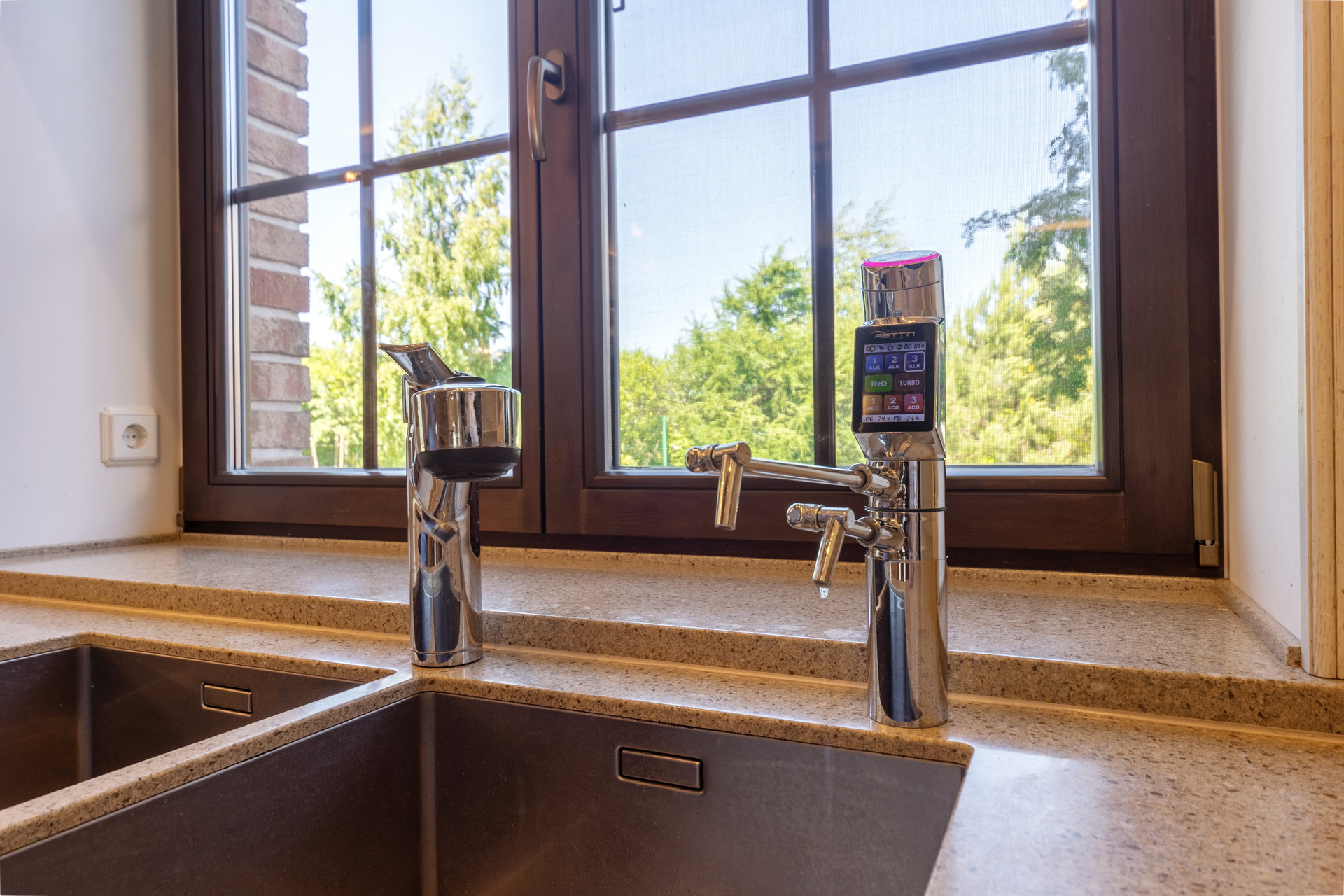 На первом этаже расположена просторная кухня-гостиная с большим диваном для всей семьи и гостей, дровяным камином и эксклюзивной авторской акустикой (звук 360), а также: кухонной мебелью производства Испании, оснащенной бытовой техникой Miele и Liebherr, установлен сенсорный ионизатор воды Tyent c регулировкой Ph, варочная панель домино с конфоркой wog и практически бесшумная профессиональная рестораннач вытяжка, сделанная на заказ.