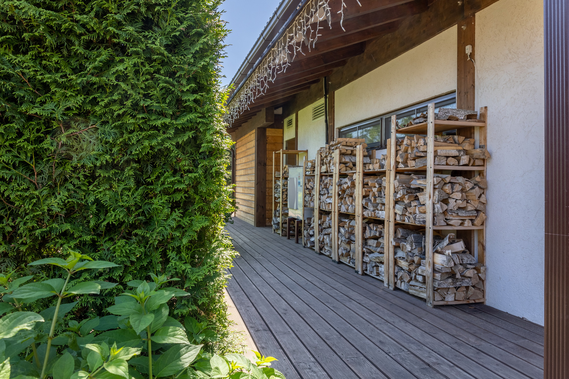 На территории участка находится отапливаемый гараж на 2 машины с автоматическими воротами Hormann и вторым этажом 45 м2 свободной планировки, который Вы можете использовать по своему назначению (например для организации зоны отдыха или проживания персонала / охраны).