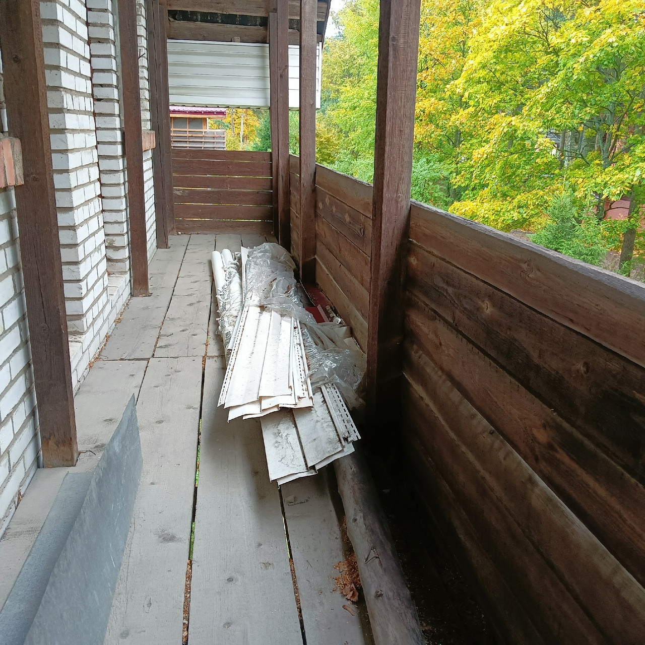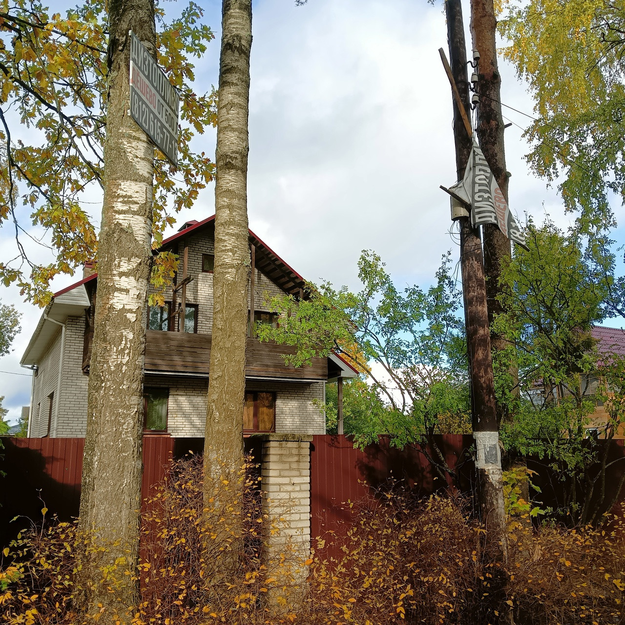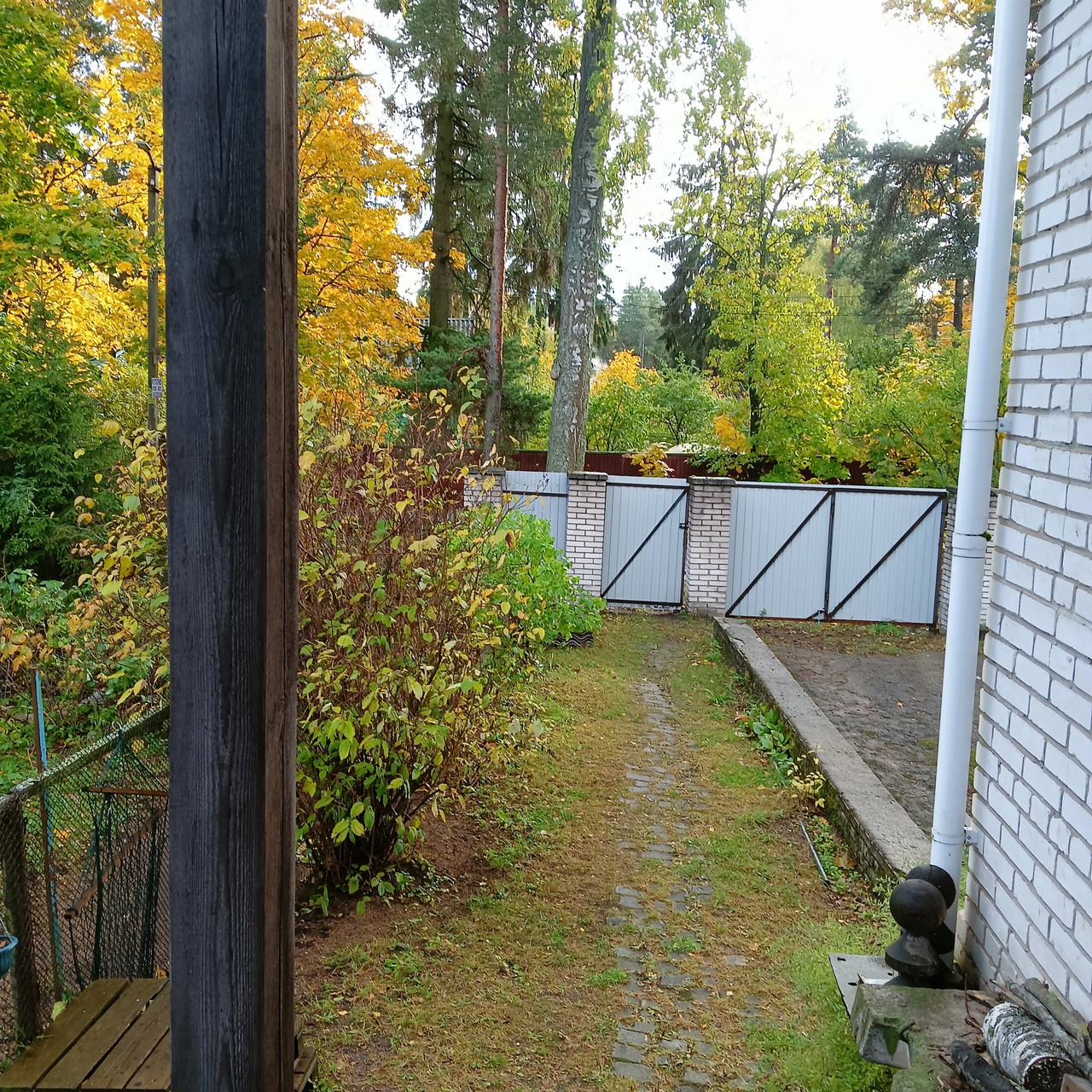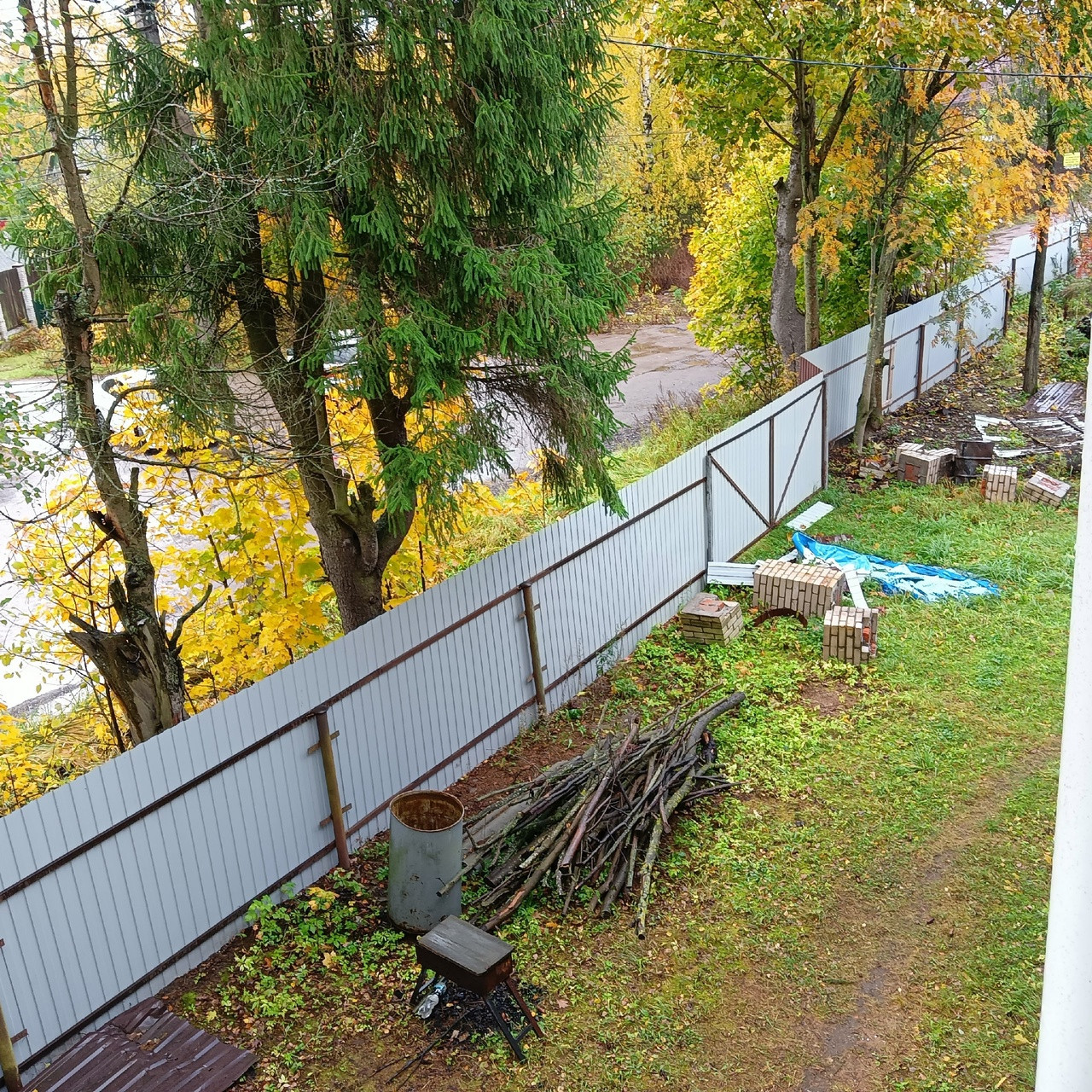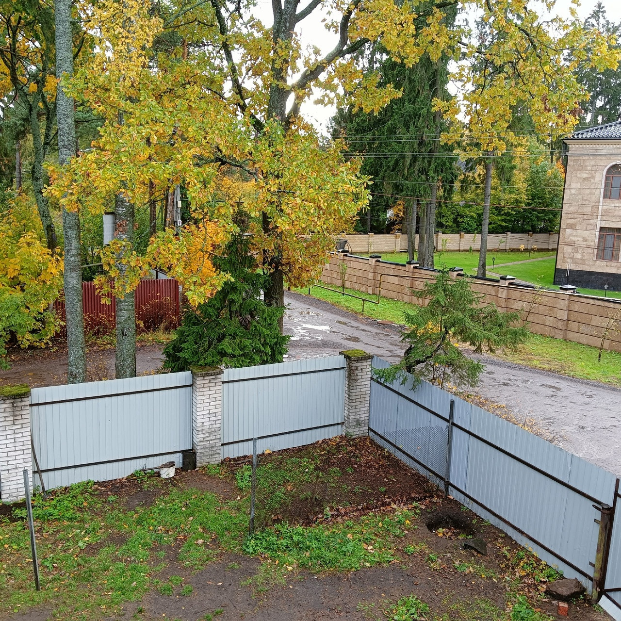 В конце участка недострой с большим гаражем и отдельным въездом из бетонных блоков около 80 кв м