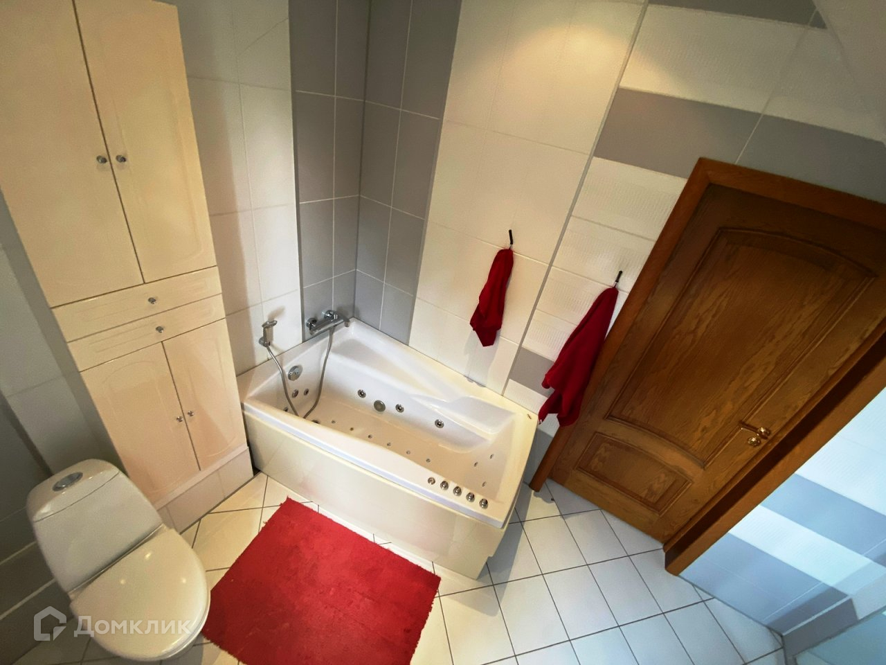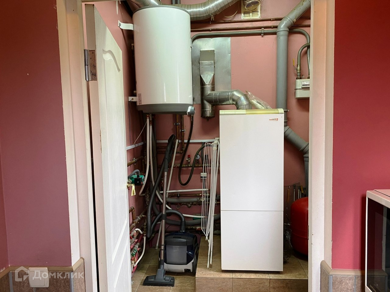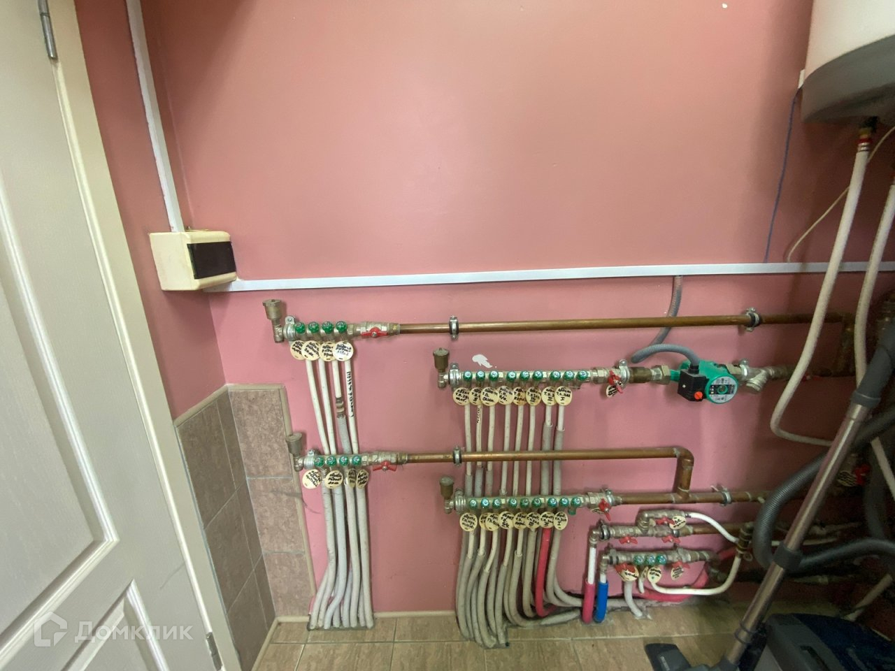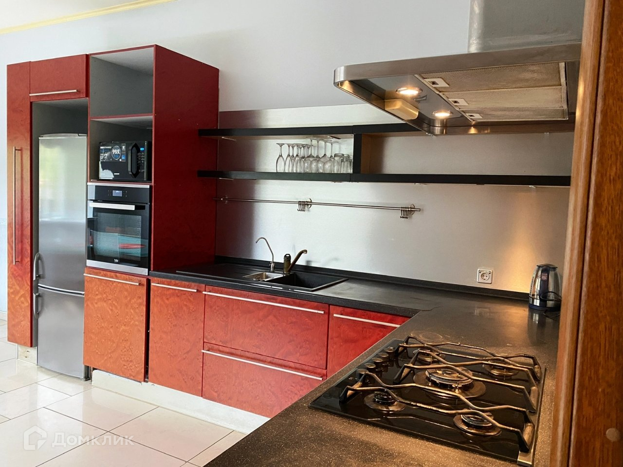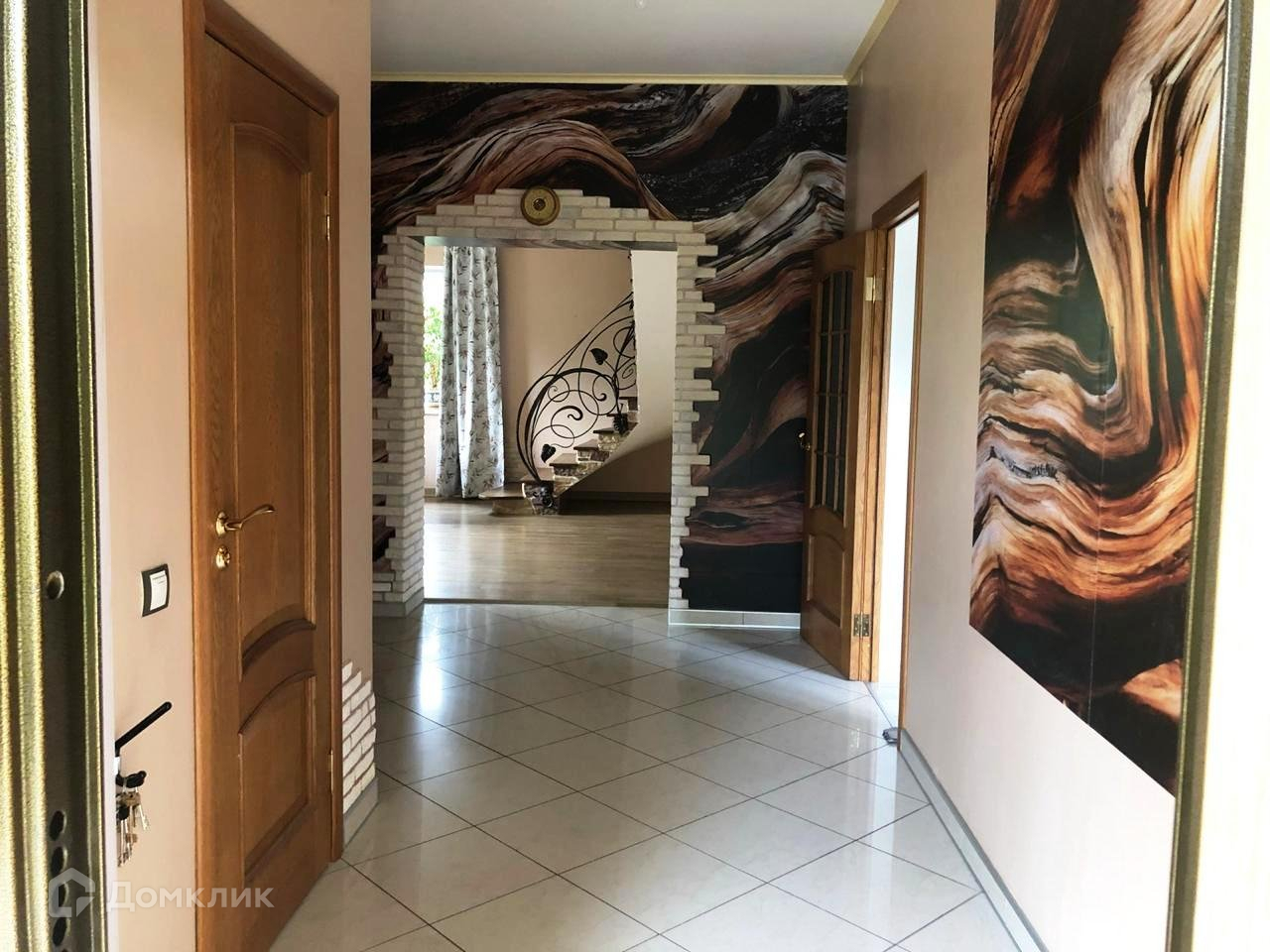 На первом этаже имеется спальня для гостей, кухня, котельная, СУ, большой хол и гостиная комната. Очень удачная планировка, на первом этаже высота потолков 3 м. В помещениях с плиткой, полы с подогревом. В остальных дубовый паркет или теплое пробковое покрытие. В тон полам все двери из массива дуба, и ступеньки на ажурной лестнице тоже дубовые, перила на лестнице - ручная ковка. Из большой кухни вход в отдельную прачечную и котельную. Там расположен газовый котел, узел разводки труб, фильтры и накопители ц.водопровода.