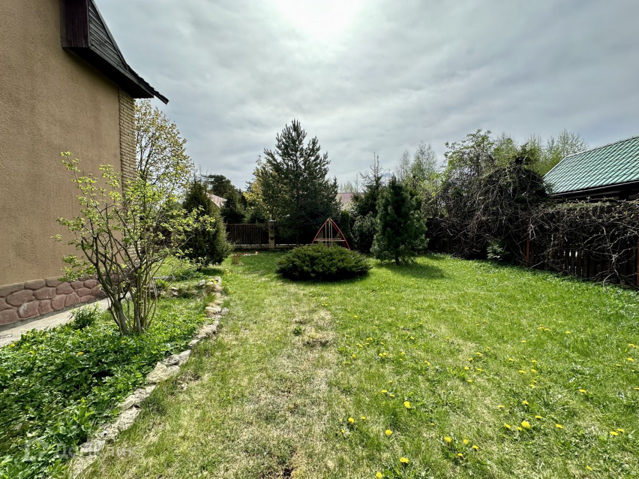 Участок 900 кв.м. Светлый со всех сторон, с элементами ландшафтного дизайна, декоративными растениями, альпийской горкой, рукотворным прудом и ручейком из него. Двор и подъезд к гаражу выложен тротуарной плиткой.