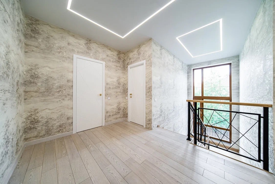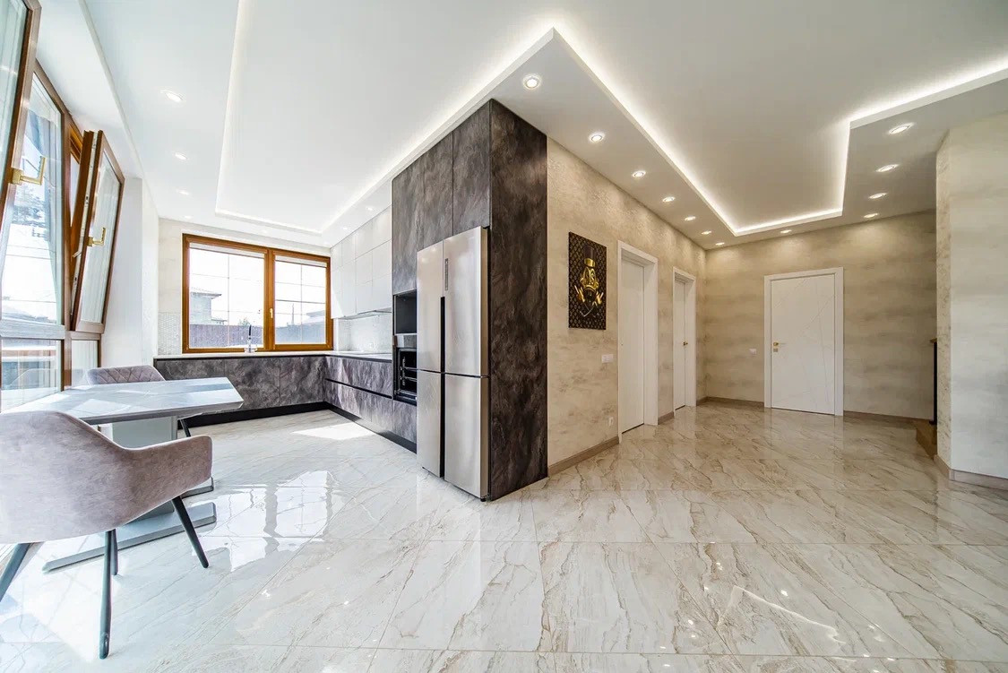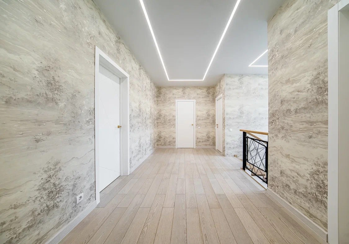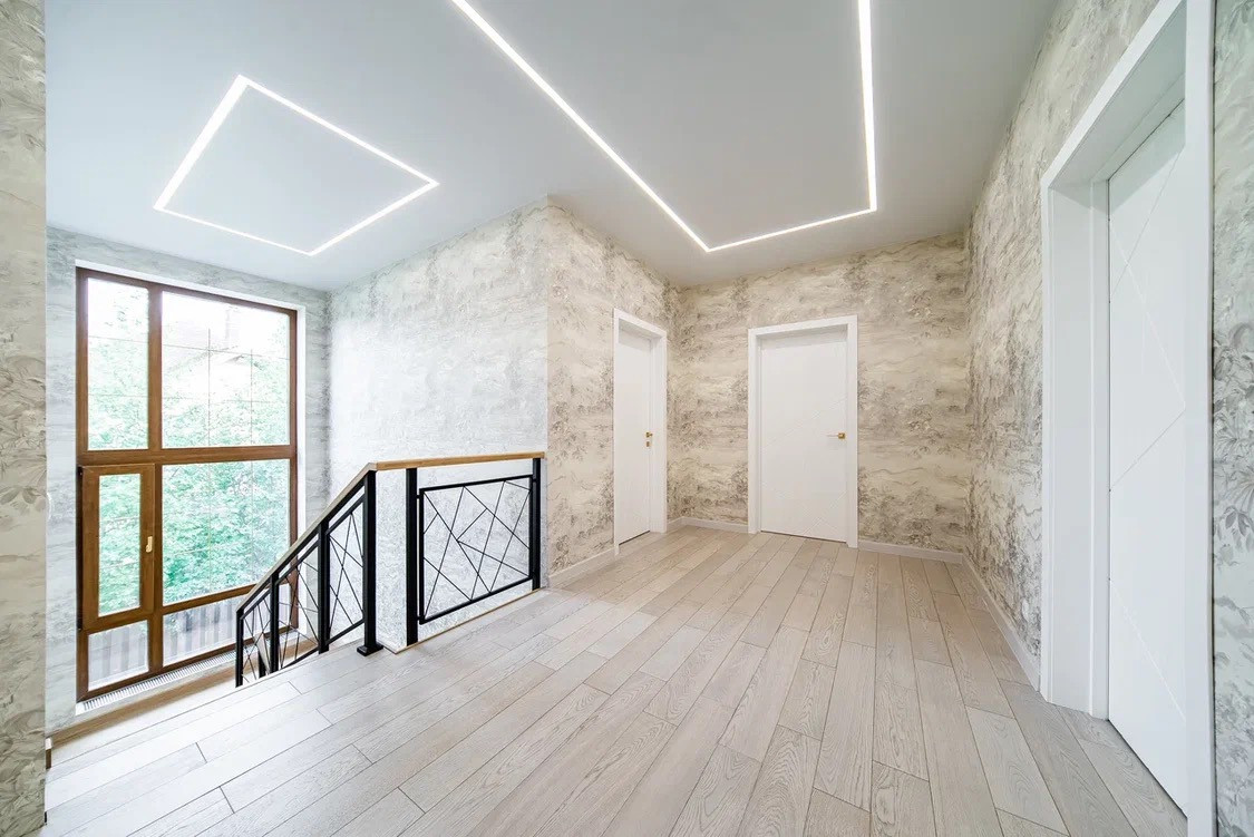 -Светодиодные ленты в холле, в комнатах гипрочные потолки с диодами и люстрами