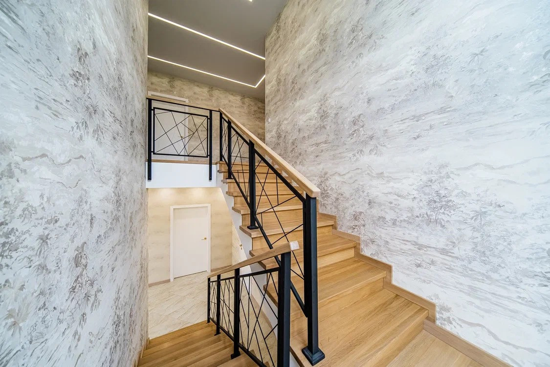 -Монолитная лестница отделанная дубом с кованными перилами.