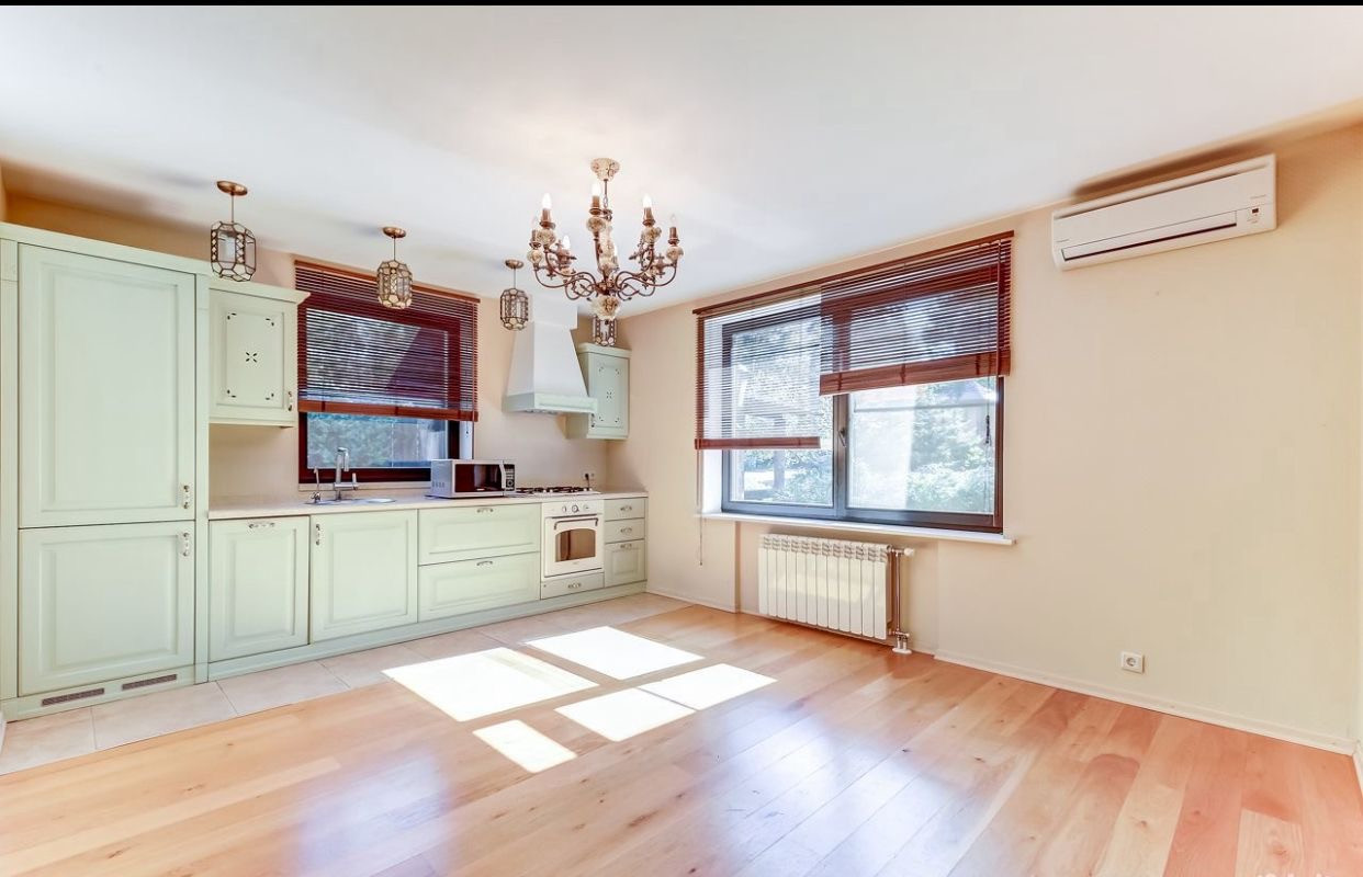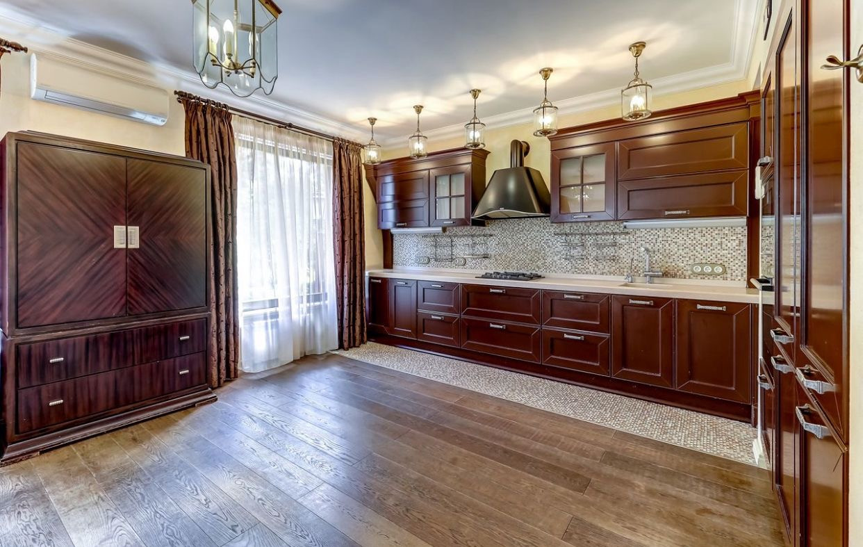 Огромная кухня-столовая 80 метров со всей необходимой встроенной техникой (два холодильника с морозильными камерами, духовка, микроволновая печь, посудомоечная машина, газовая плита).