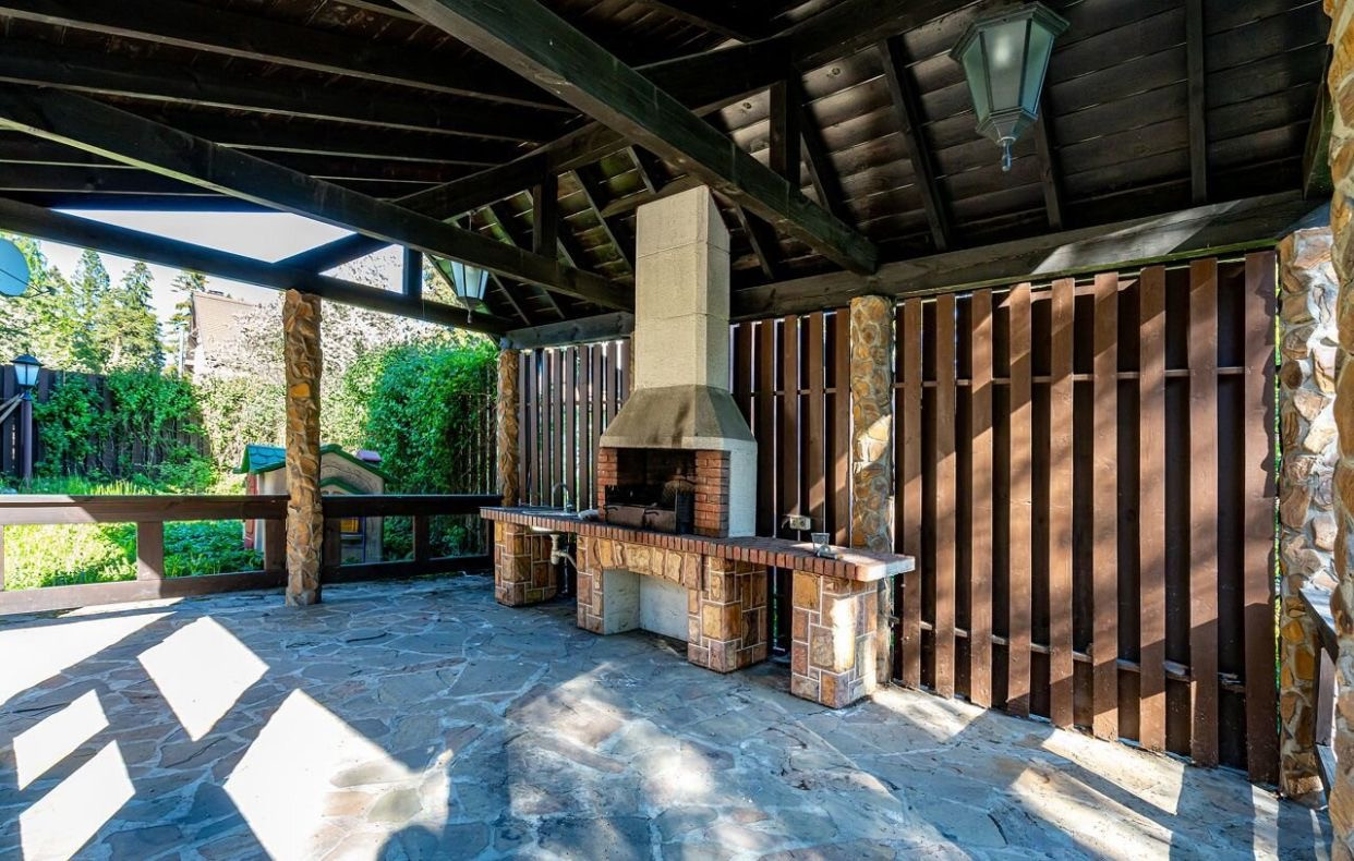 На участке расположена крытая оборудованная зона мангала, рассчитанная на 10 человек. К ней подведена вода, установлена раковина, стационарный мангал с трубой из огнеупорного кирпича.