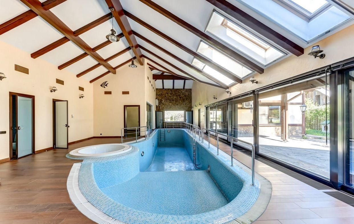 Бассейн 15 метров, около 110 кубов. Высота потолков в бассейне около 6 метров. Помещение бассейна имеет стеклянную раздвижную стену, обеспечивающую выход к зоне отдыха и мангала.