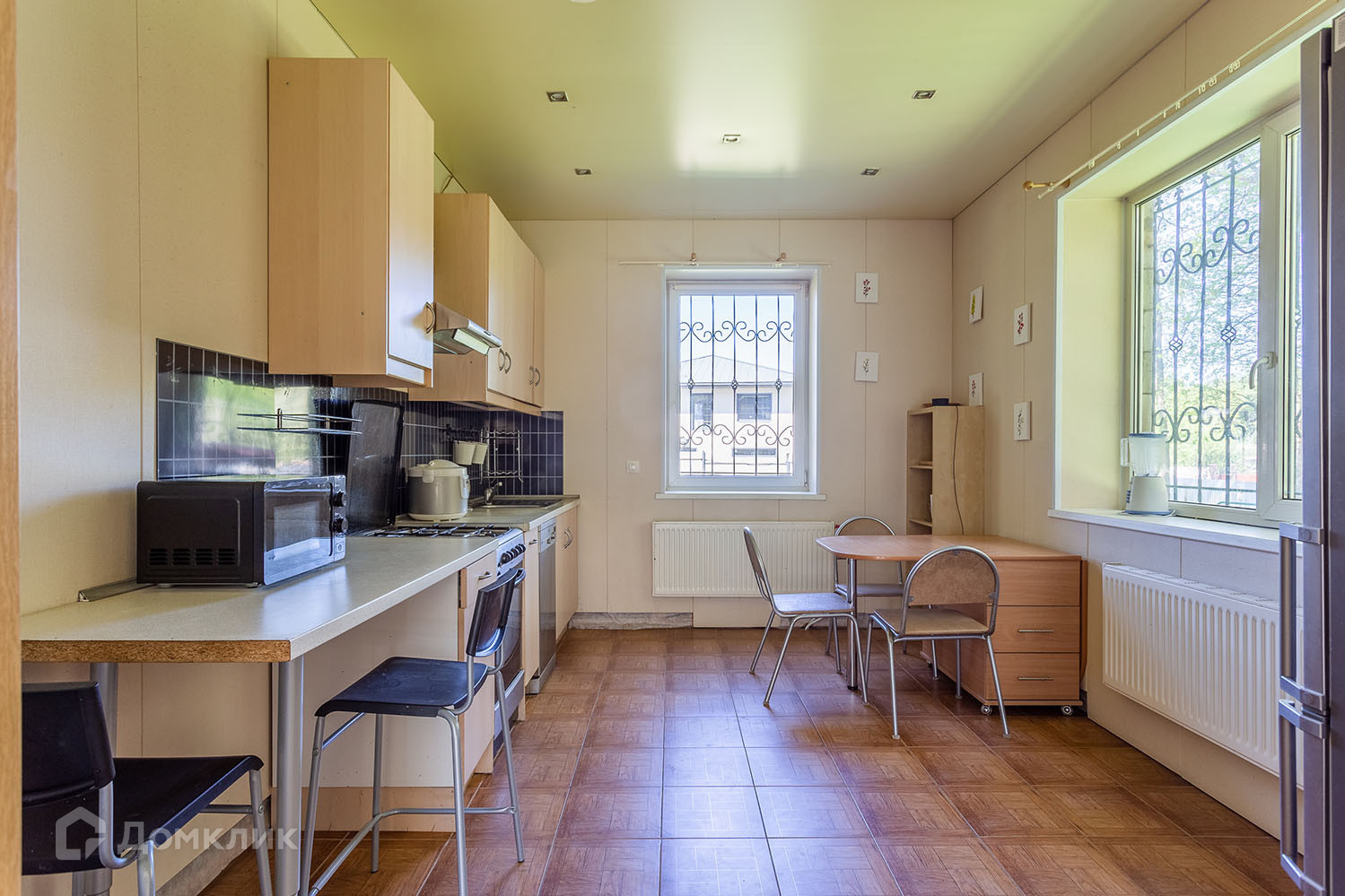 На первом этаже нам открывается просторная гостиная, которая совмещена с хорошо оснащенной кухней. Также здесь находится спальня и санузел с душевой кабиной. Особенное внимание заслуживает система подогрева полов, добавляющая комфорт в холодные дни.