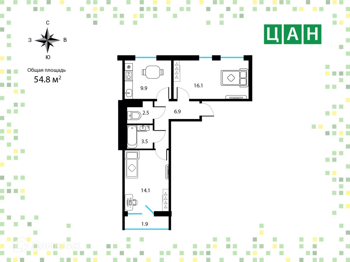Общая площадь 54.8 м2