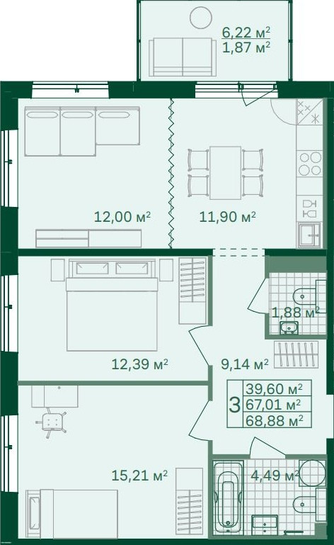Общая площадь 69.9 м2