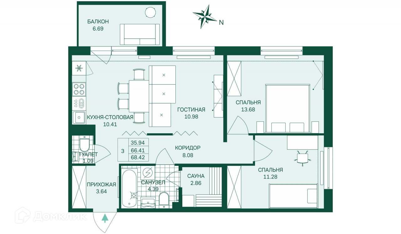 Эффективная планировка позволяет использовать каждый метр по назначению. Четкое разделение на приватную, гостевую и СПА-зону:   две ниши для хранения, сауна, два санузла, большая площадь кухни-гостиной и две спальни 13,68 и 11,28 кв м. Вам повезло, ведь Вы сможете наблюдать путь солнечных лучей на протяжении всего дня, а два широких окна в гостиной делают ее по-настоящему лучезарной.