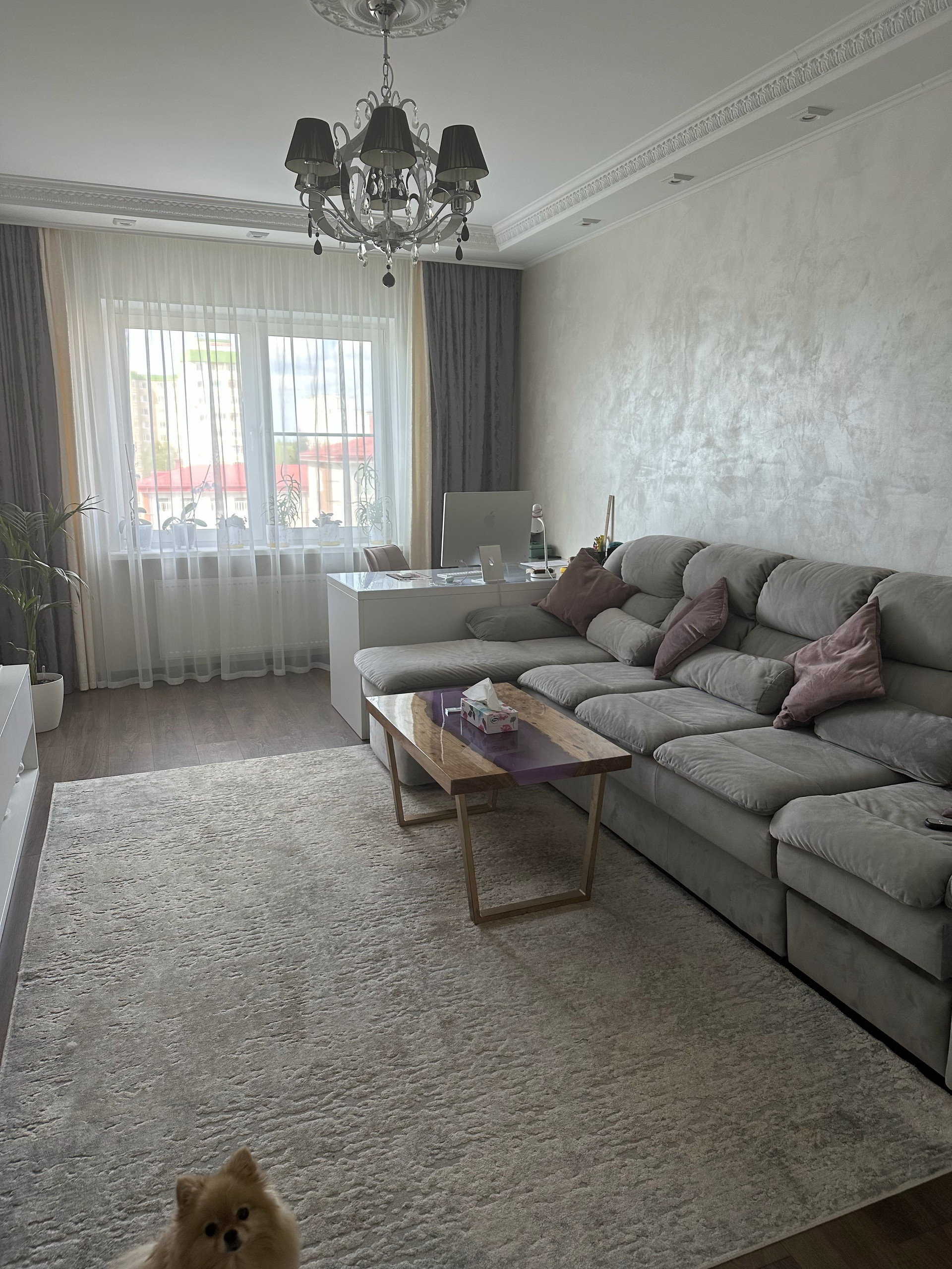 Гостиная - забираем рабочий стол и технику, диван и тумба под выполнены на заказ, диван только перетянут. Стол из слэба с эпоксидной смолой.