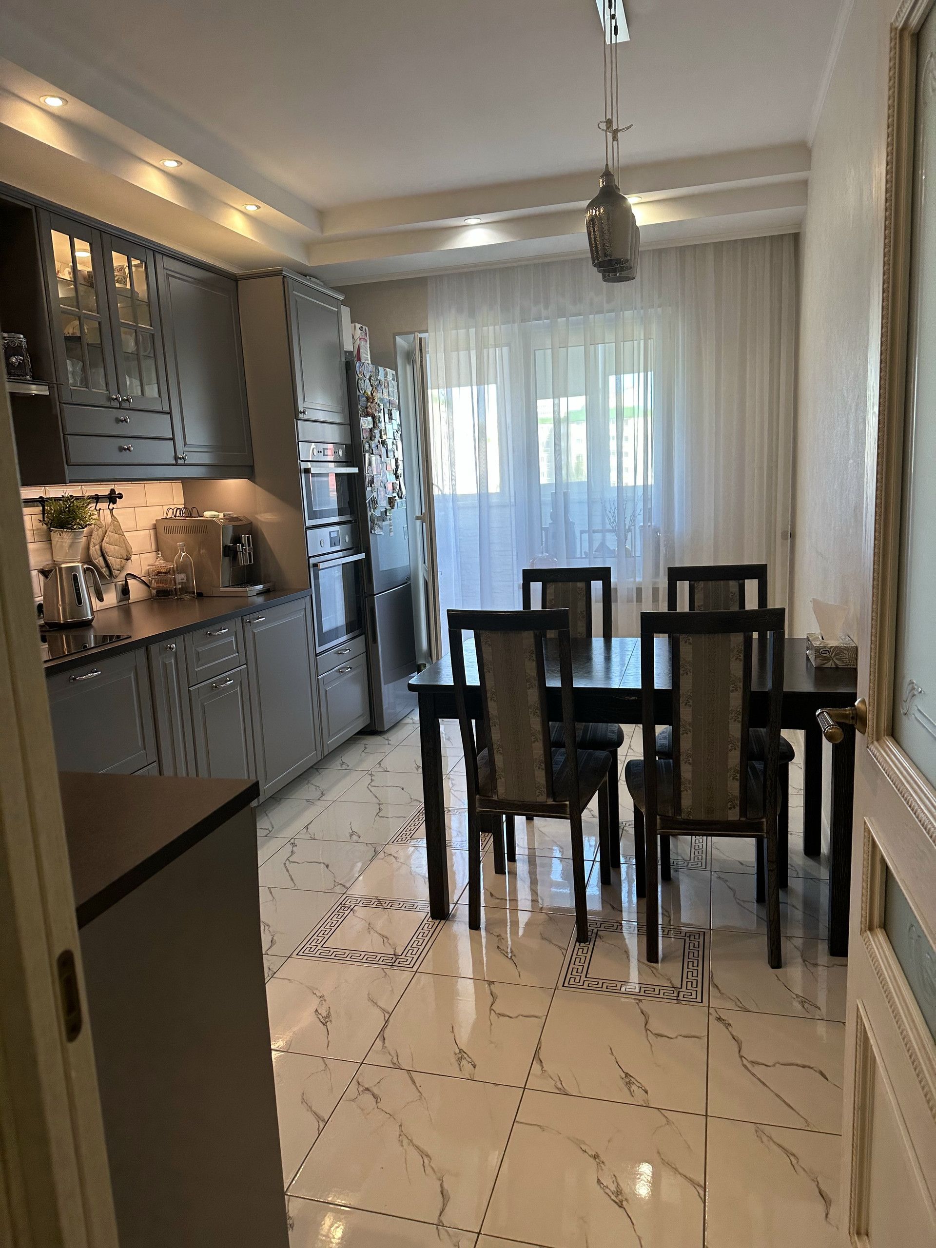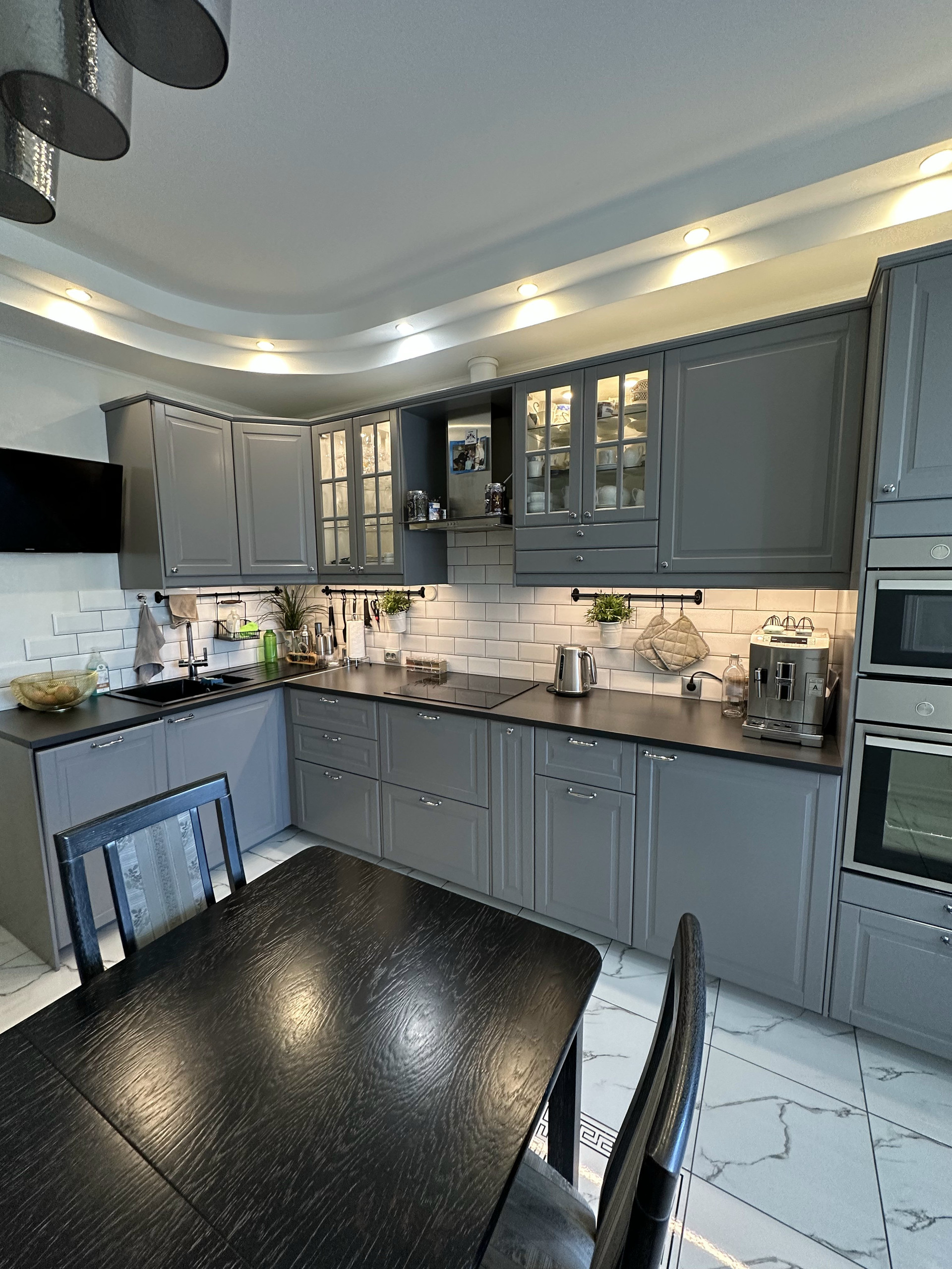 Кухня Икея, очень эргономичная и удобная. Грамотно продумана, все под рукой. Техника на кухне остаётся: холодильник, посудомойка, духовка, свч встроенная, телевизор.