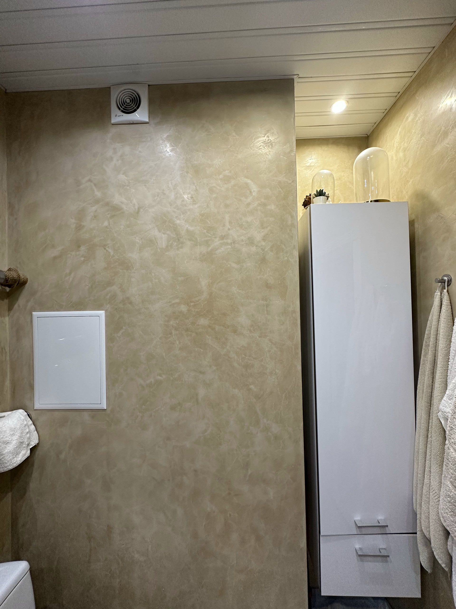 В квартире нет обоев, все стены покрыты венецианской штукатуркой. Выглядит очень дорого. Практичный вариант в использовании - грязь смывается губкой, без деформации покрытия.