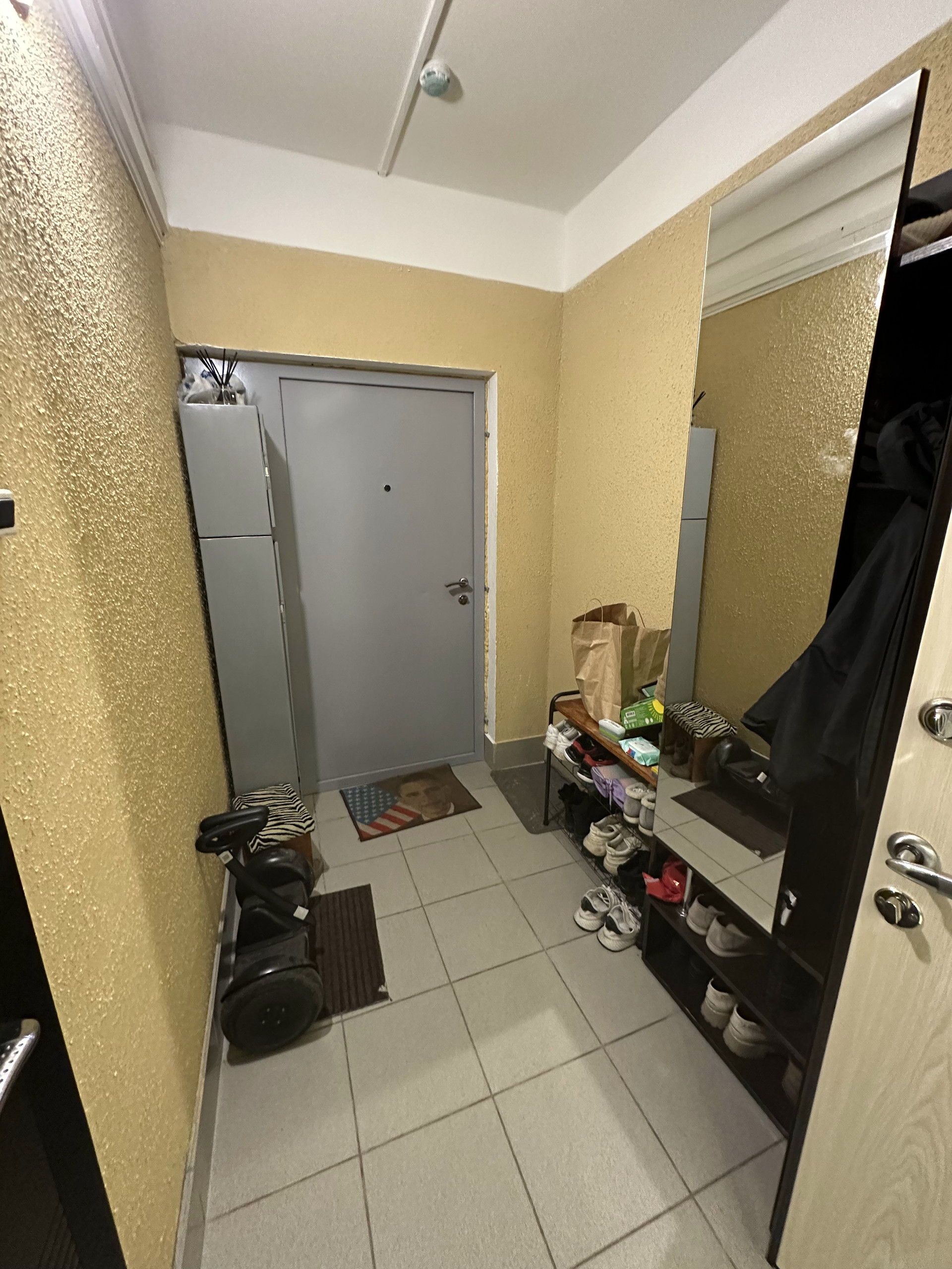 В подъезде отделен дверью коридор. На 2 квартиры с соседями, вся обувь и верхняя одежда остается там. Прихожая в квартире чистая без песка.