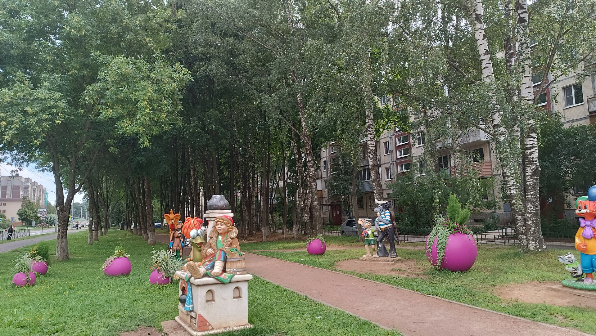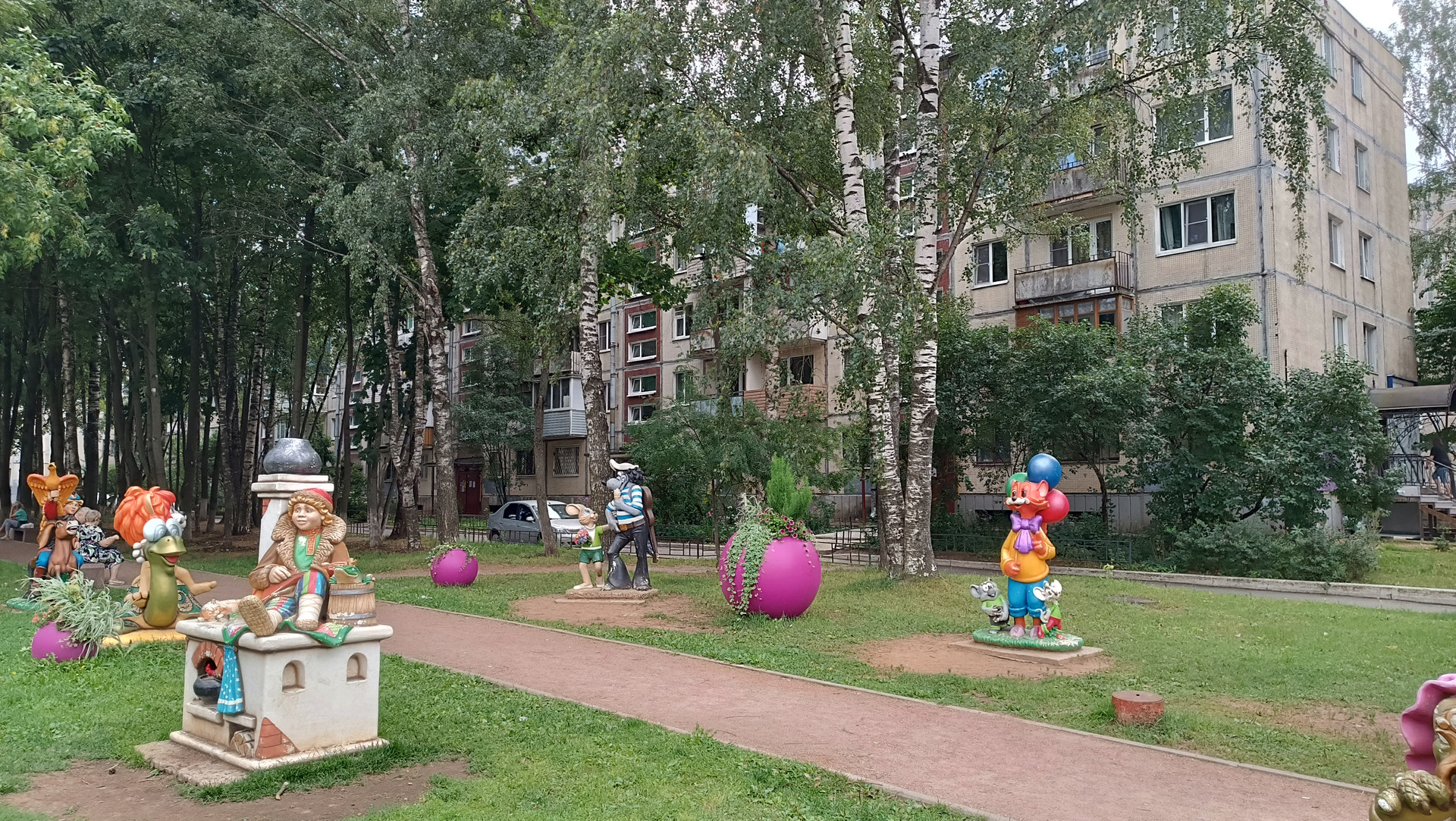Дом расположен рядом с небольшим сквером, украшенным цветочными композициями и скульптурами персонажей советских мультфильмов. Двор тихий, зеленый, имеются детская и спортивная площадки. У дома всегда есть парковочные места.
