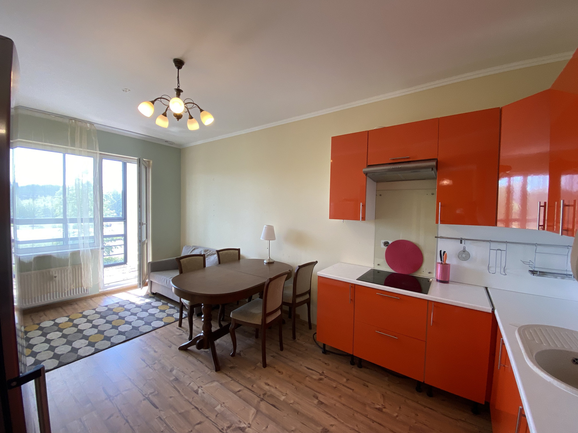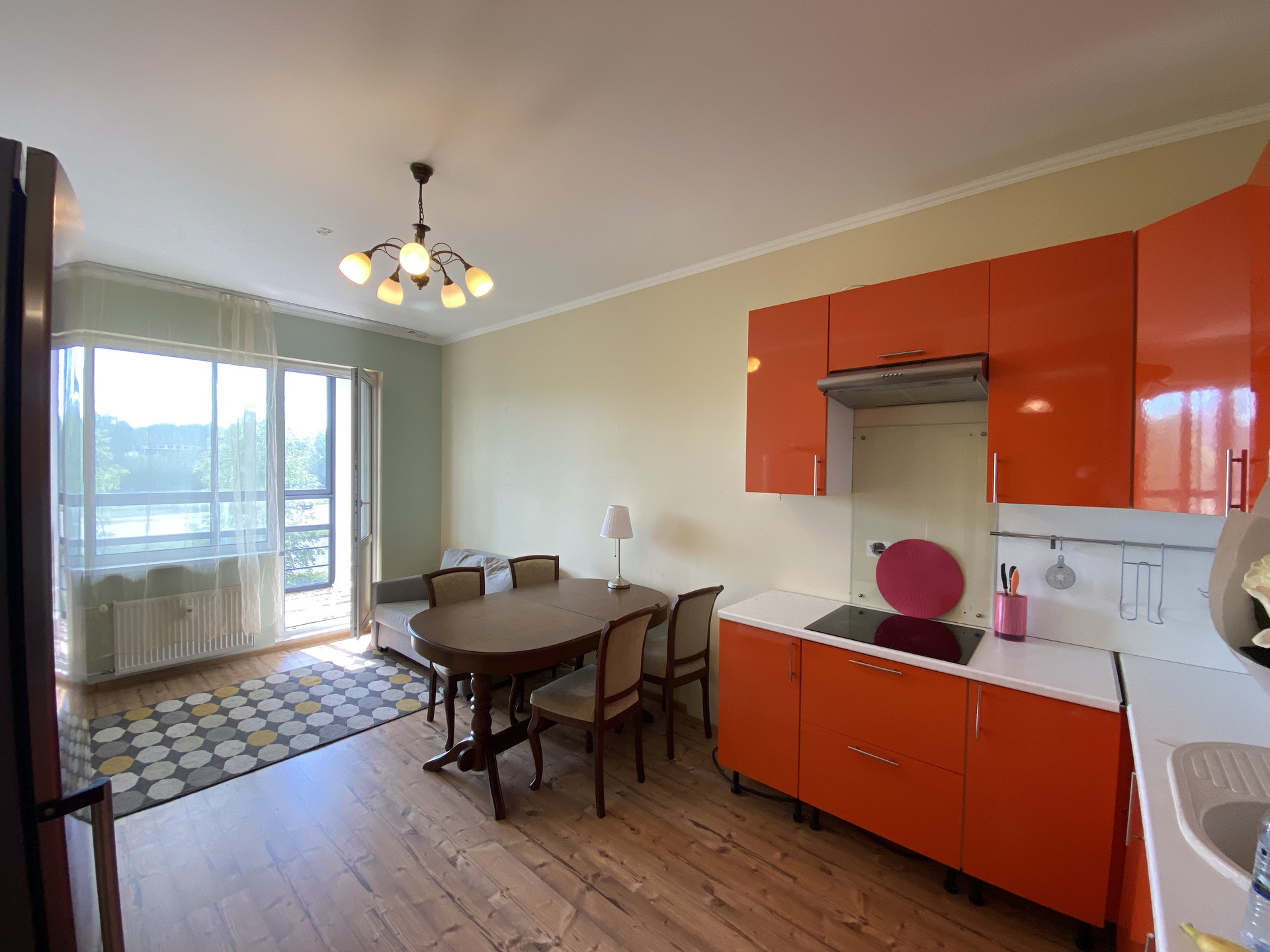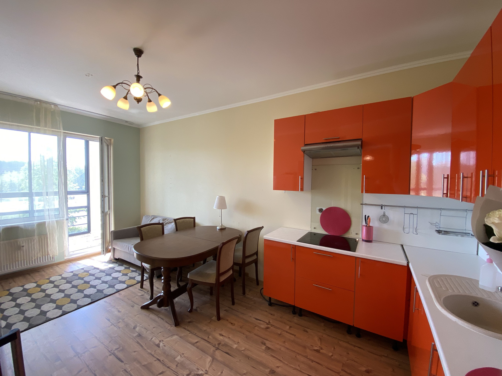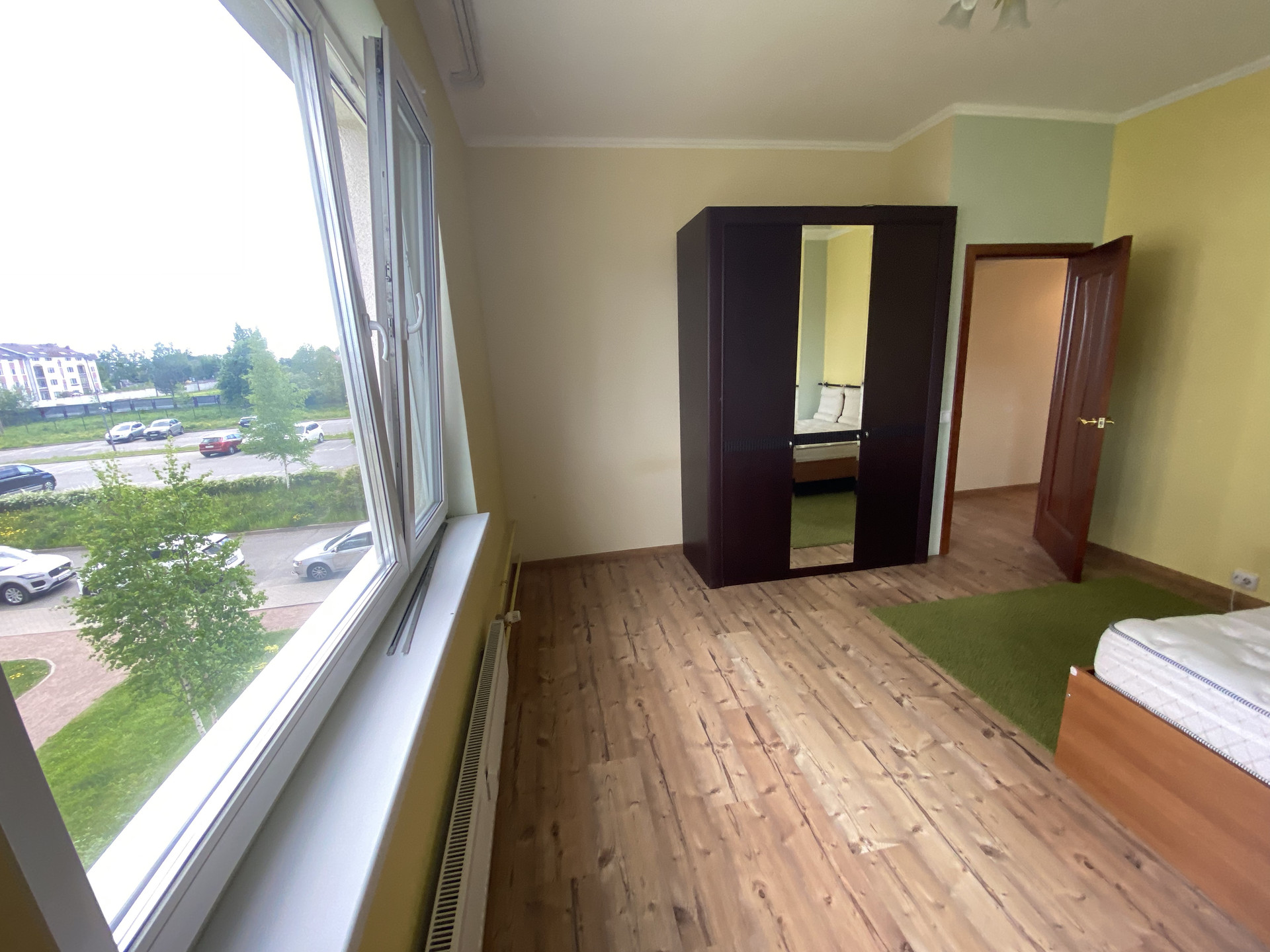 Второй этаж, три комнаты + кухня-гостиная (20 кв. м.) с выходом на балкон (панорамное остекление).