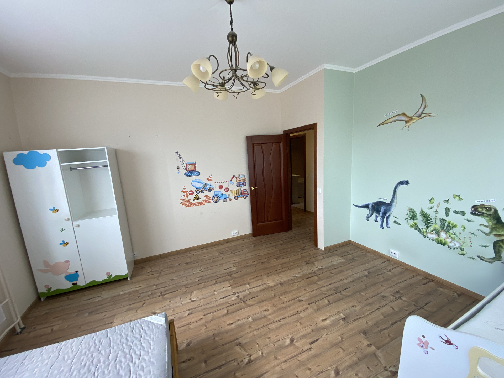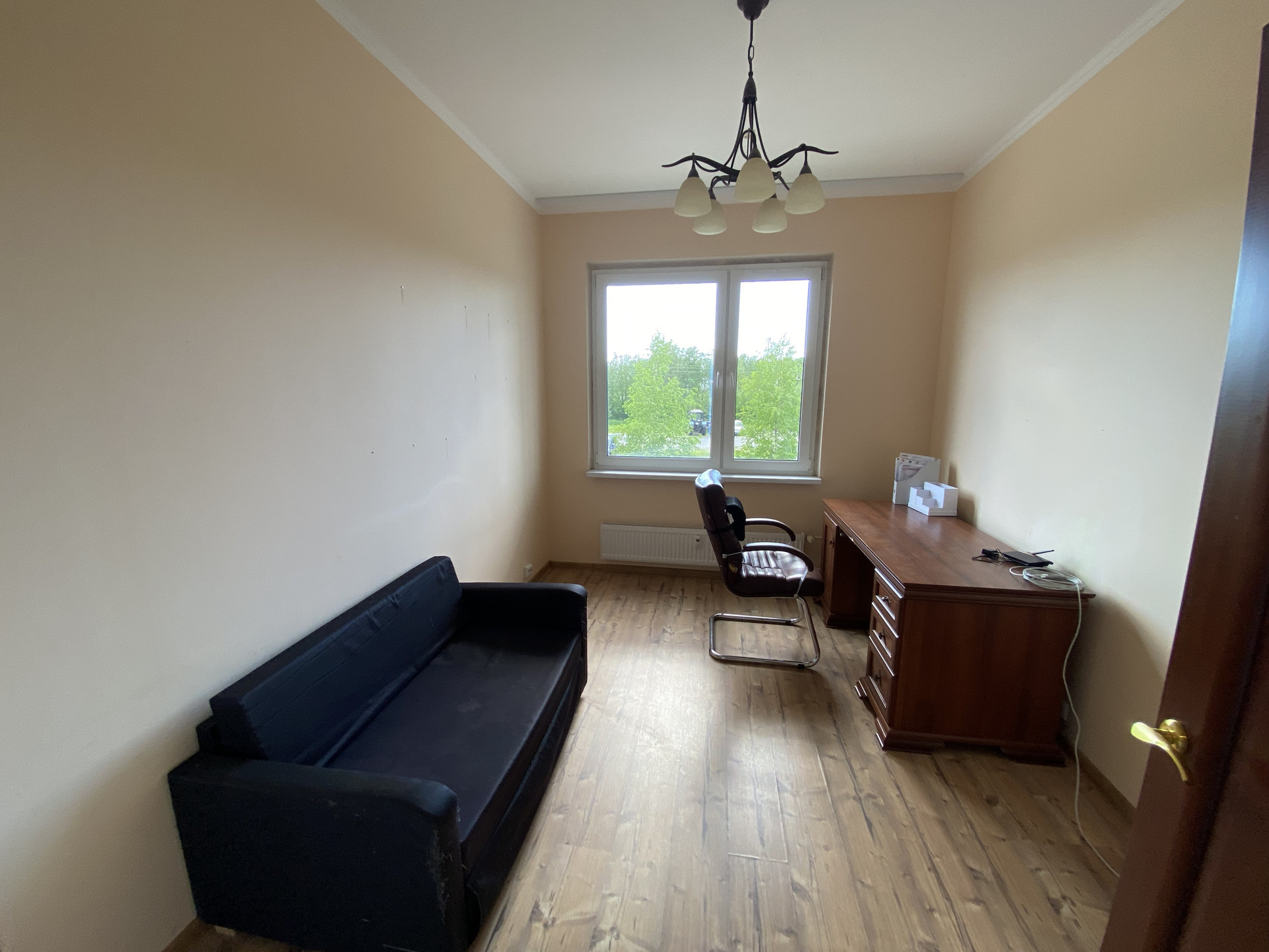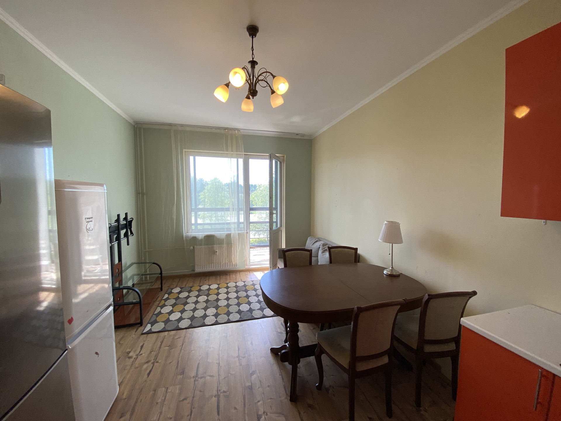 Второй этаж, три комнаты + кухня-гостиная (20 кв. м.) с выходом на балкон (панорамное остекление).