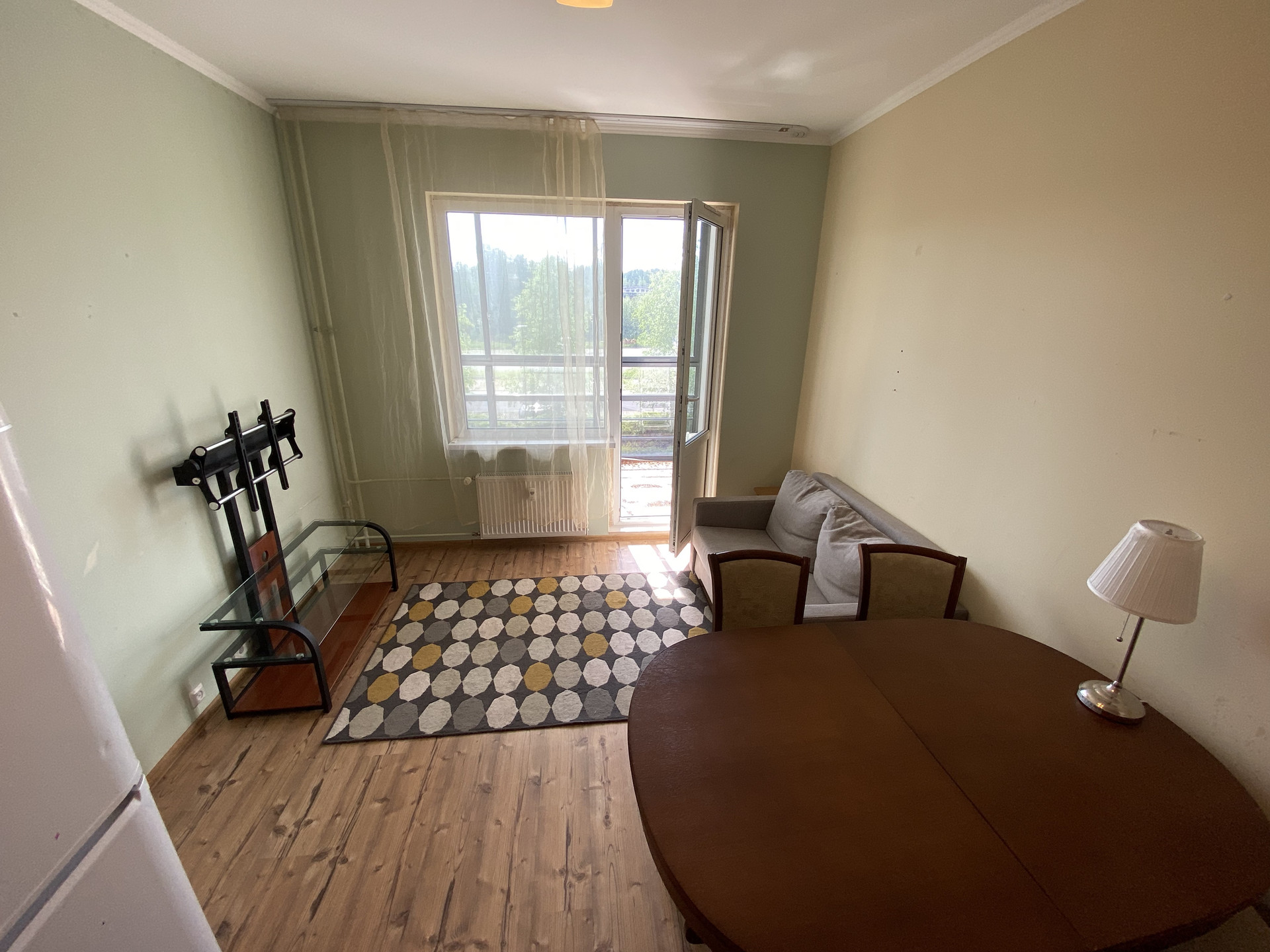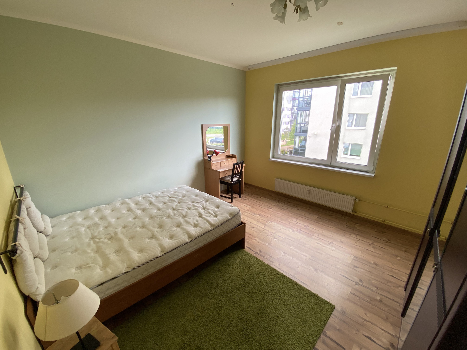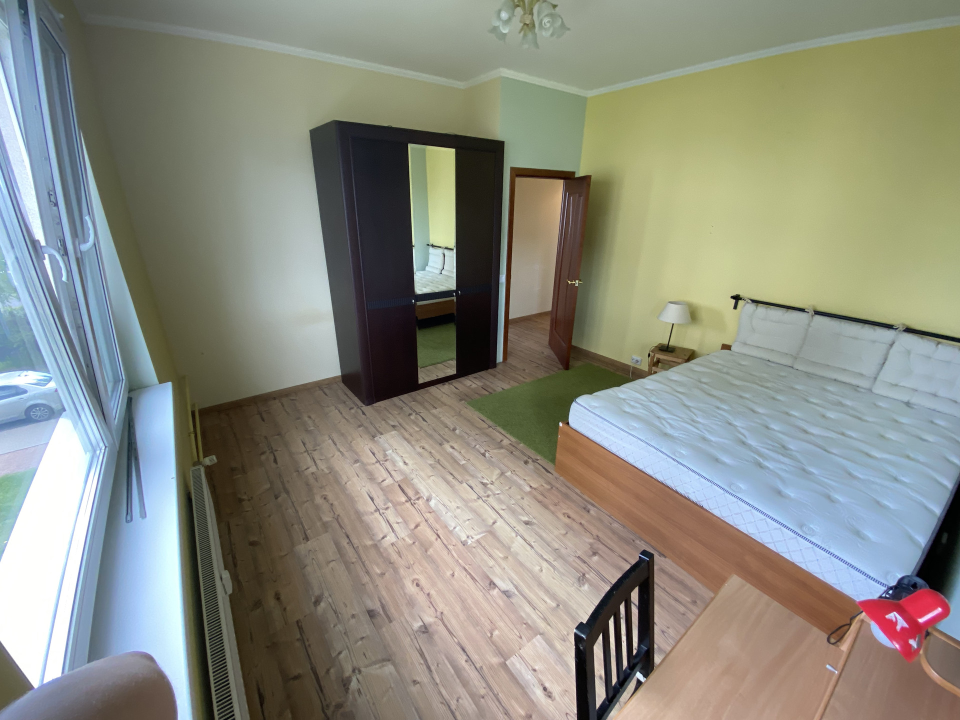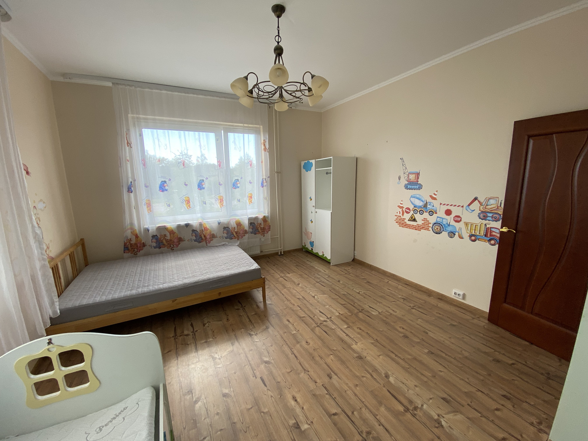 Второй этаж, три комнаты + кухня-гостиная (20 кв. м.) с выходом на балкон (панорамное остекление).