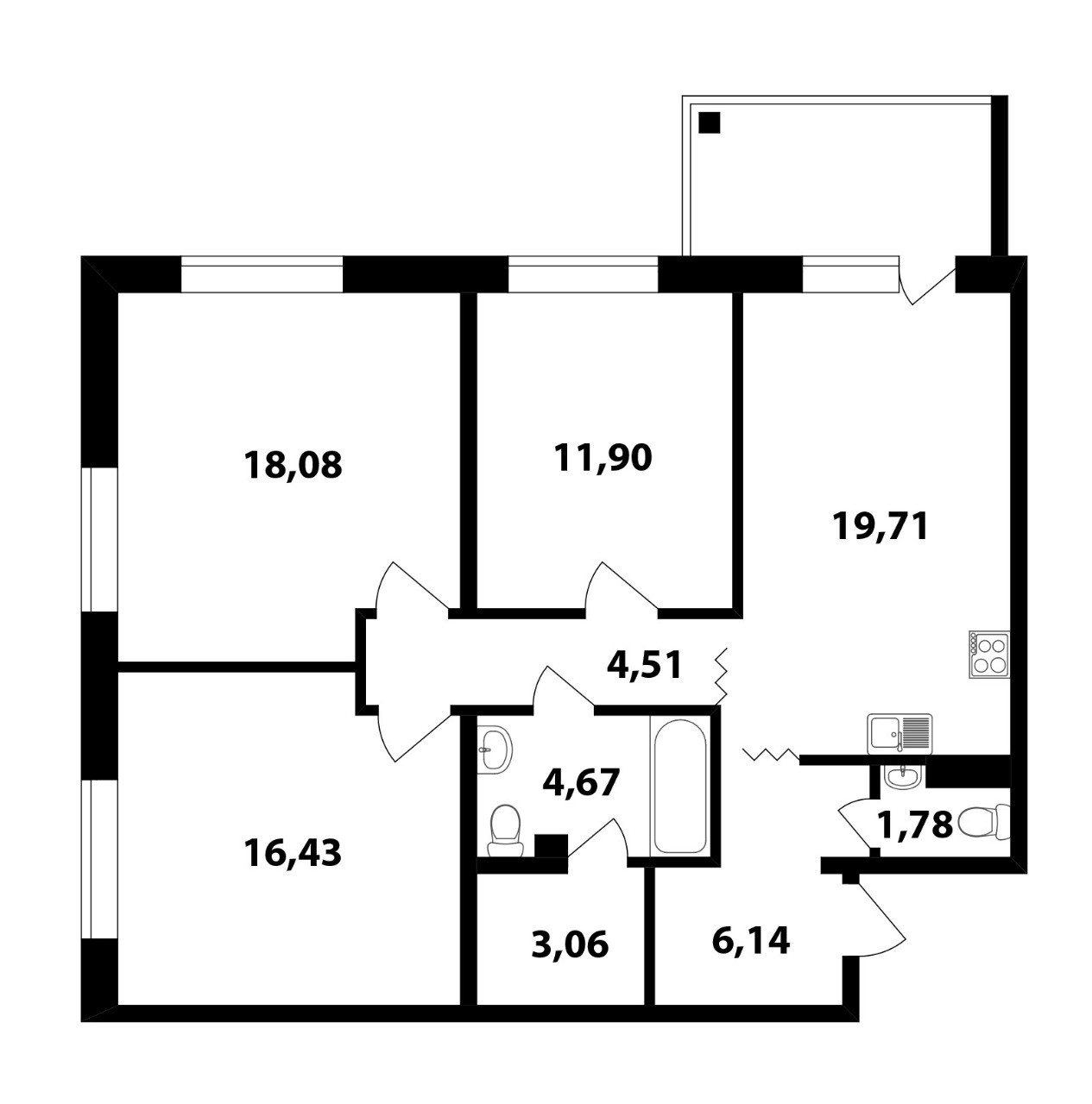 Изолированные комнаты: 18,08 + 11,9 + 16,43 кв.м.