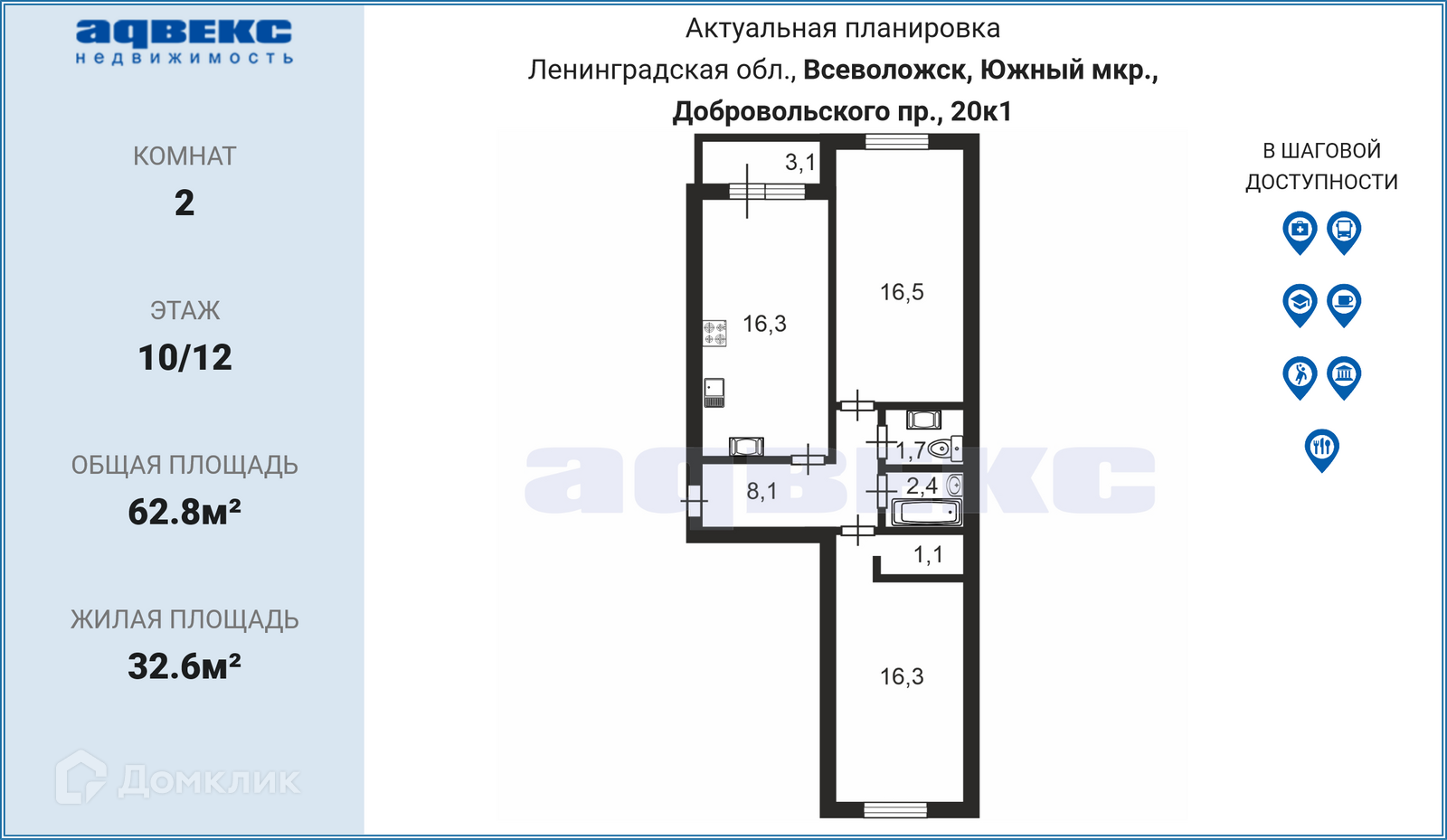 2-комнатная квартира, 62.8 м2, этаж 10 / 12, на продажу во Всеволожске, проспект Добровольского, 20к1