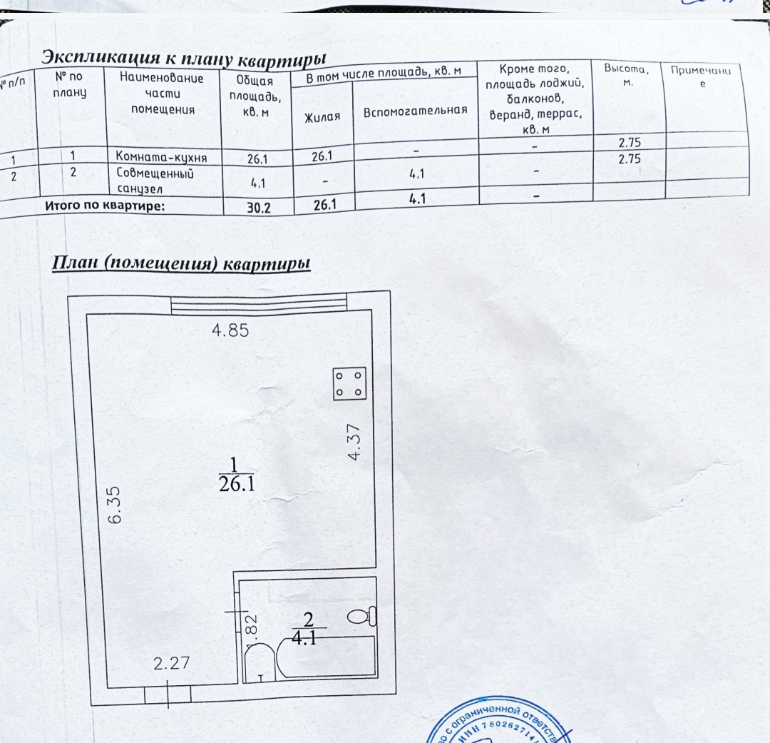 Общая площадь 30.2 м2