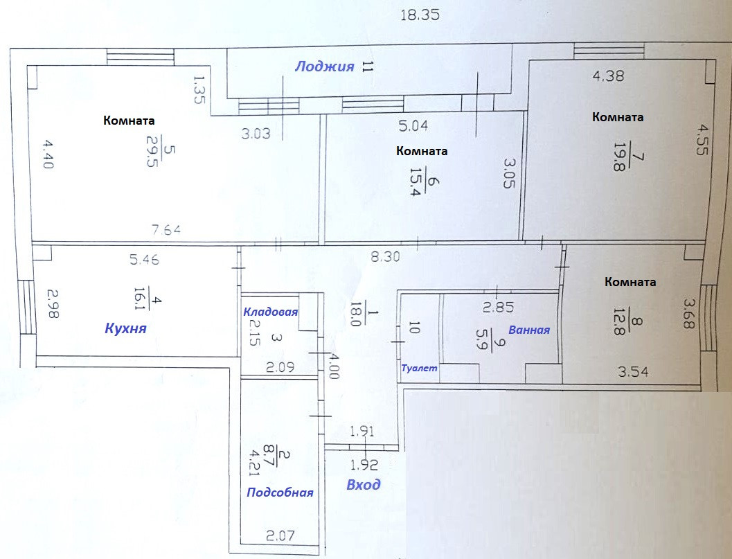- удобная планировка включает: светлую кухню 16,1кв.м., изолированные правильной формы комнаты: 29.5кв.м., 19.8кв.м., 15.4кв.м., 12.8кв.м.; раздельный сан.узел. Высокие потолки 2,8 м. Квартира грамотно зонирована. Есть место для гардеробной, с местами для хранения одежды, вещей; кладовая;