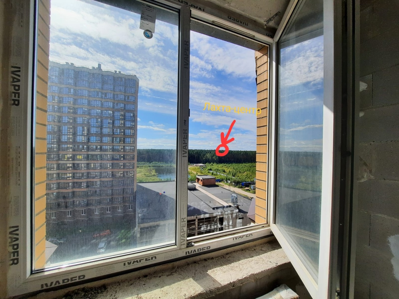 Из окон квартиры открывается великолепный панорамный вид на лес и город, вдалеке видна башня Лахта-Центр.