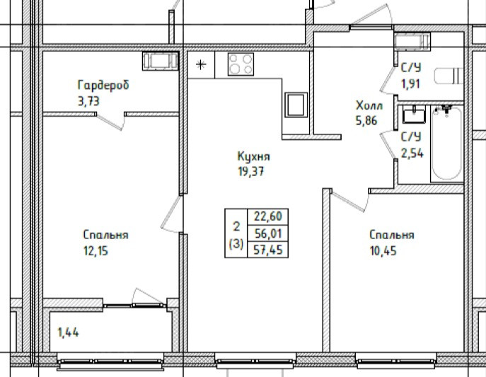 Общая площадь 58 м2