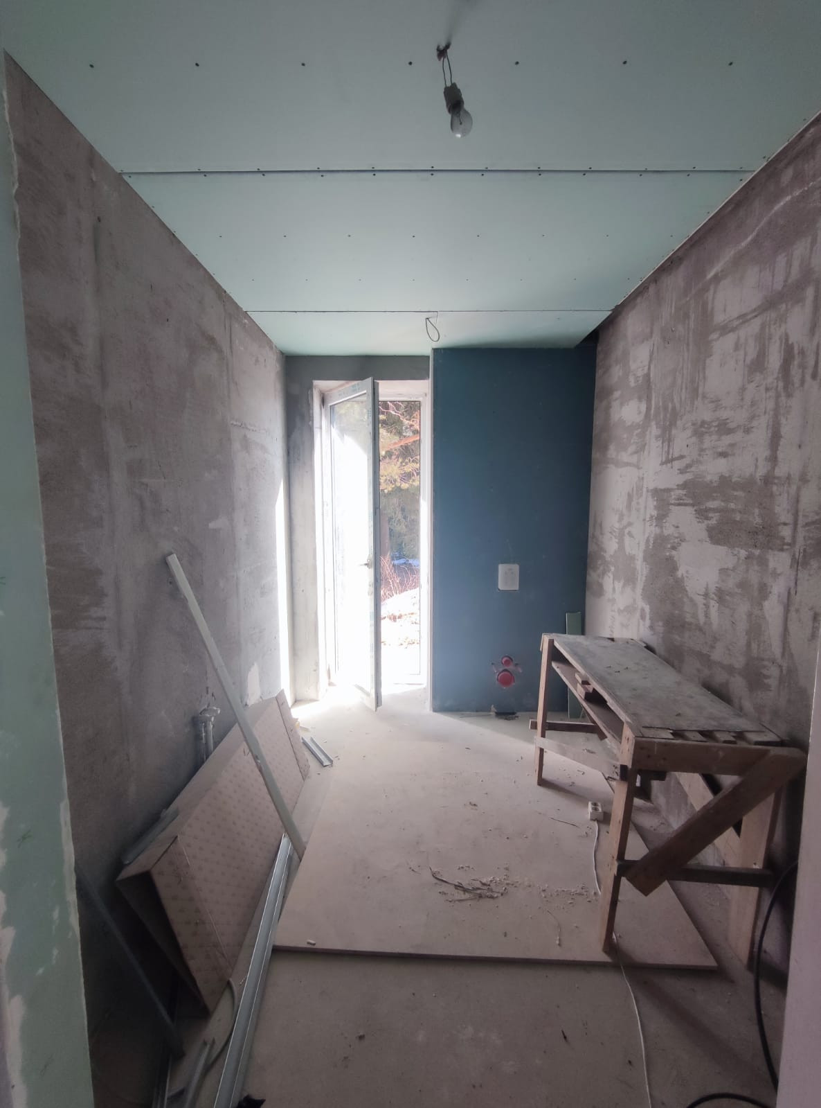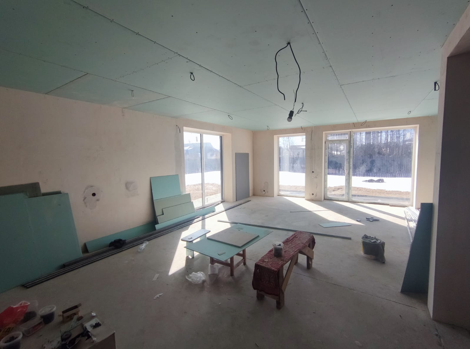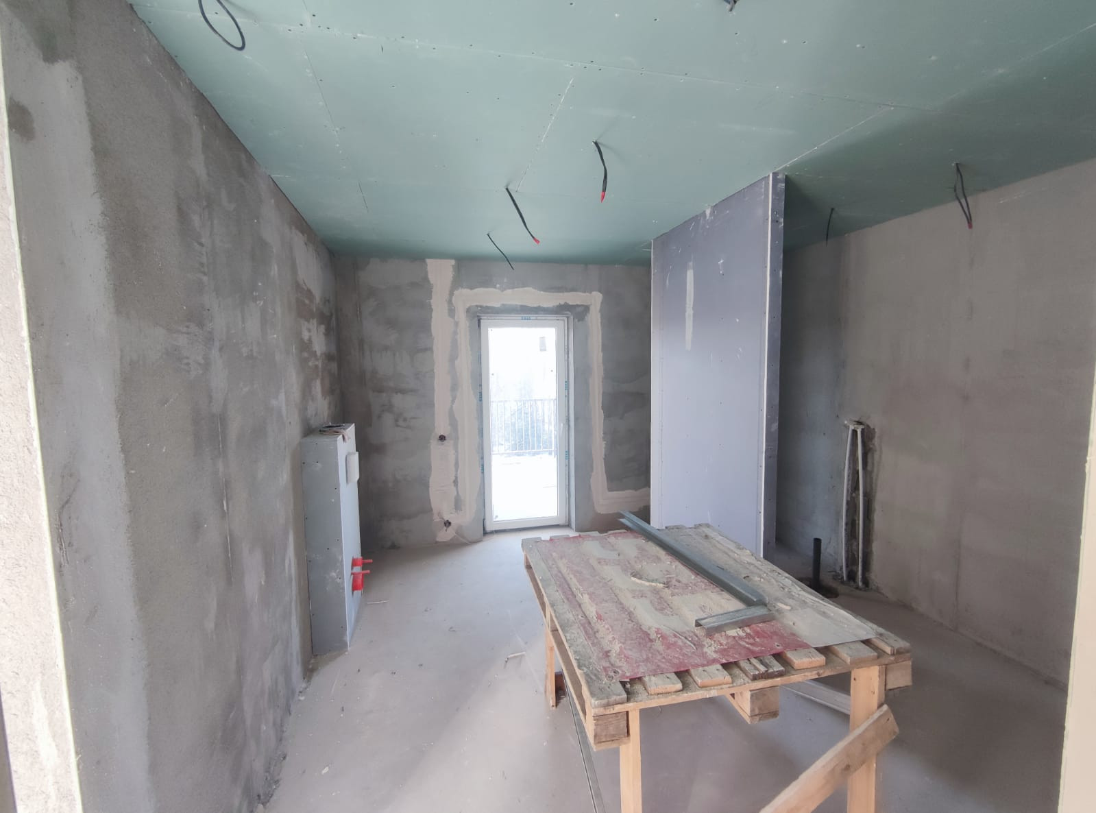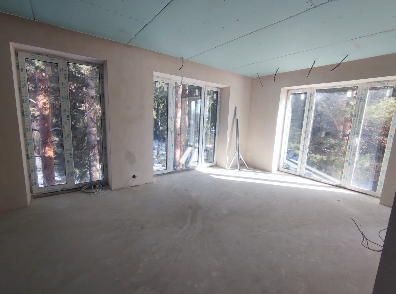 сделана подготовка под чистовую отделку, разводка электрики, отопление, теплые полы залиты, стены отштукатурены, сделана вентиляция , местами стоит сантехника, сделана чистовая стяжка.