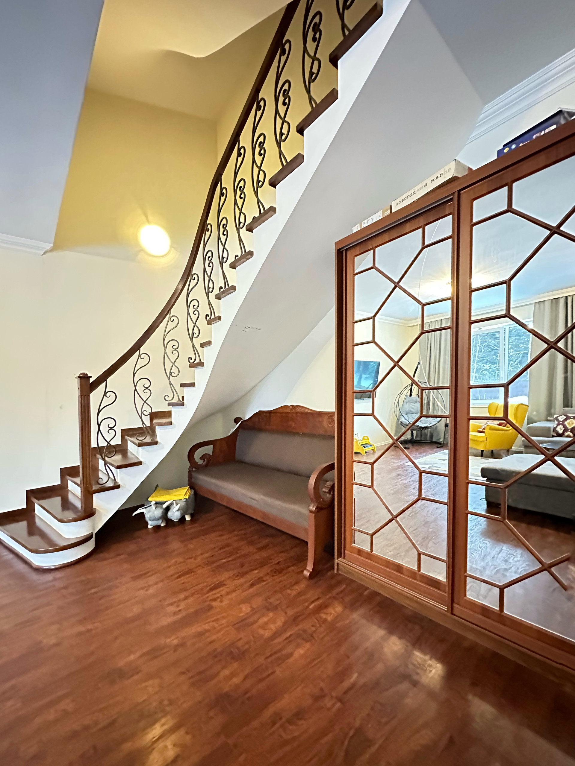 В подарок будущему собственнику остается вся техника (на кухне, с/у, тех.комнате) и мебель (за исключением двух кресел с круглым столом, дивана (на фото под лестницей), и двух книжных стеллажей).