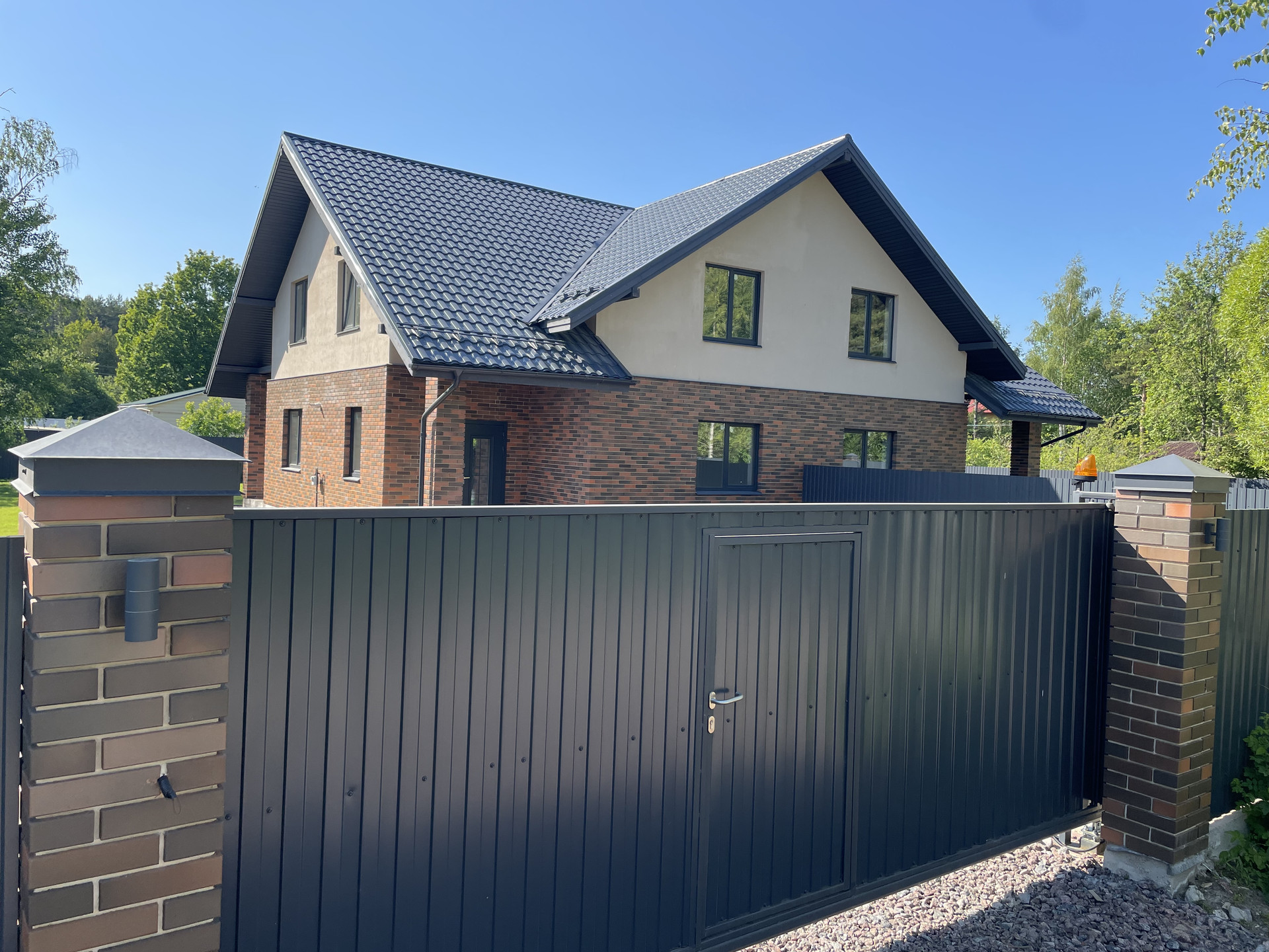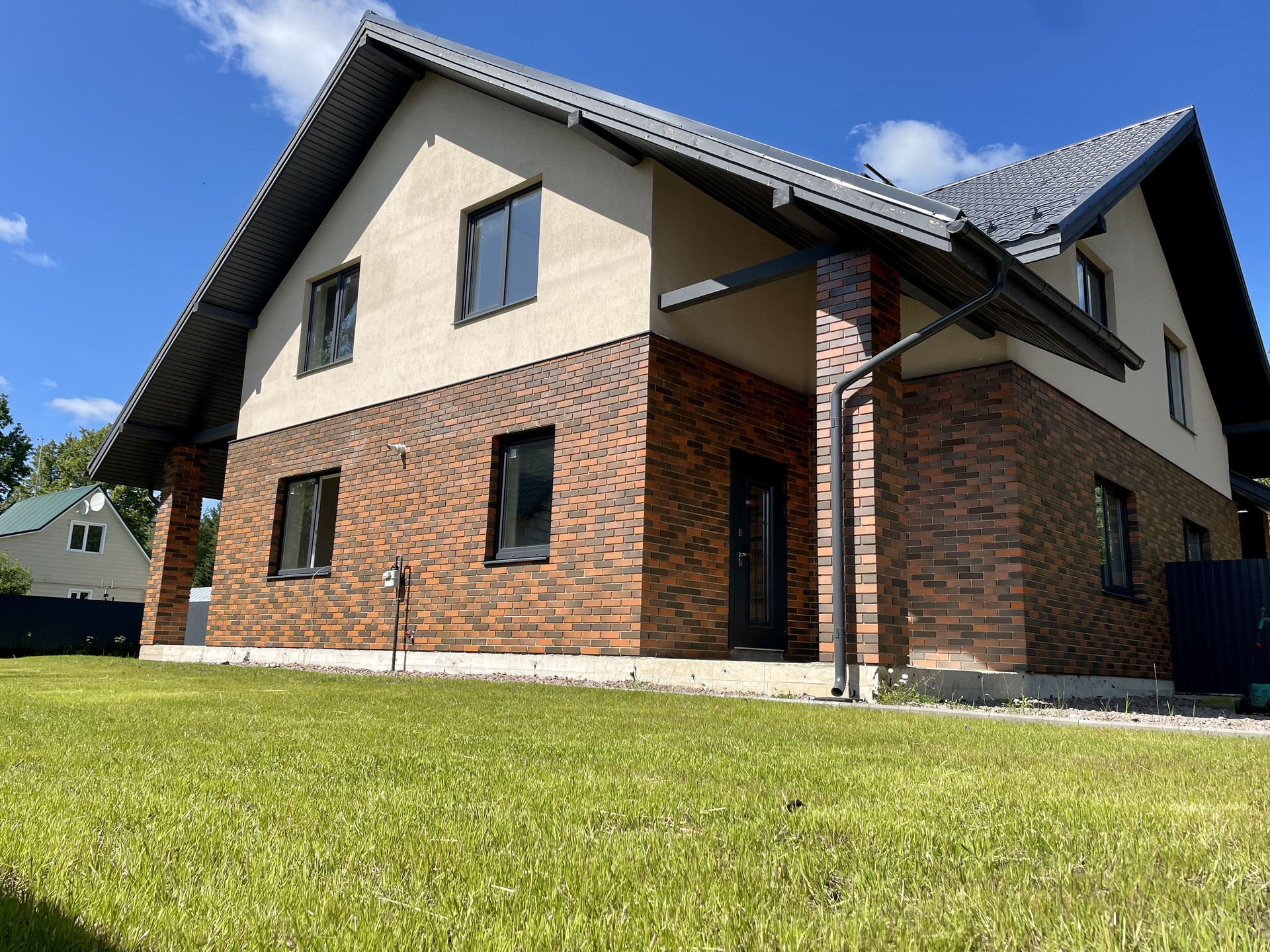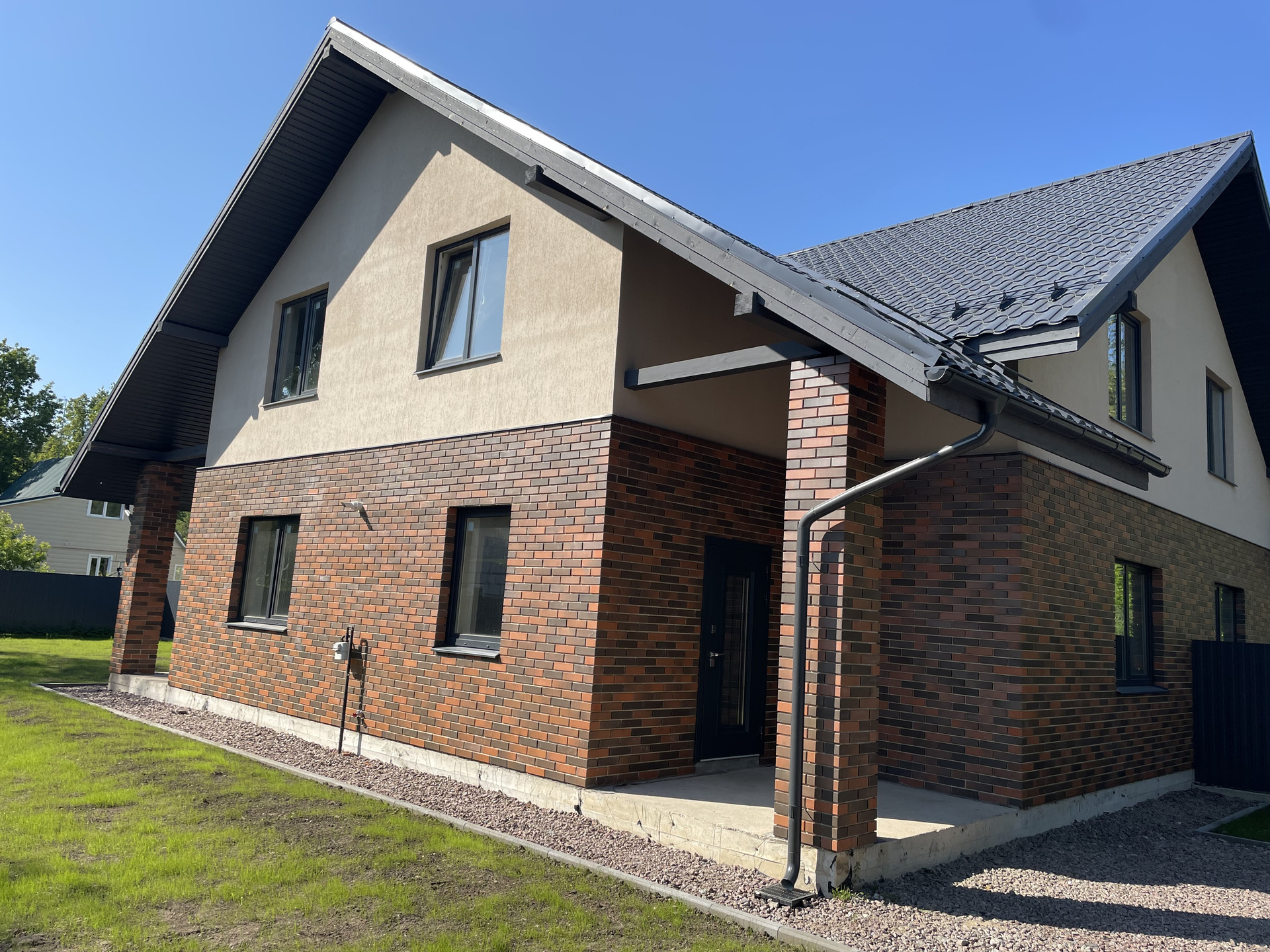 Площадь 160м2 на участке в 7,5 соток. Построен на монолитной плите из теплого керамического блока ЛСР с утеплением и облицован кирпичом в стиле «баварская кладка».