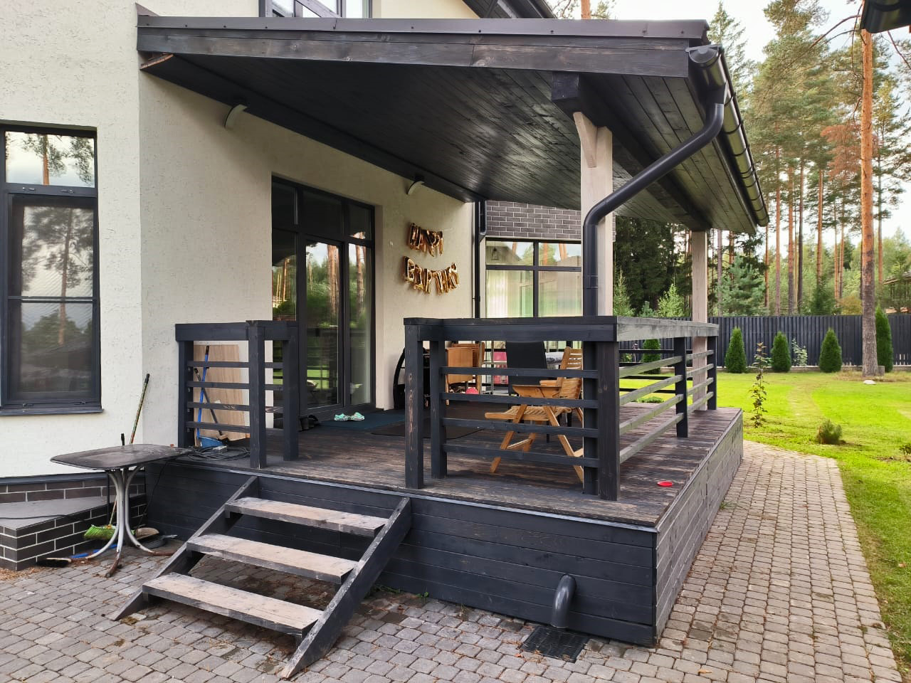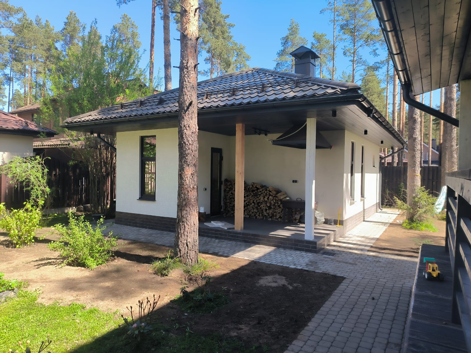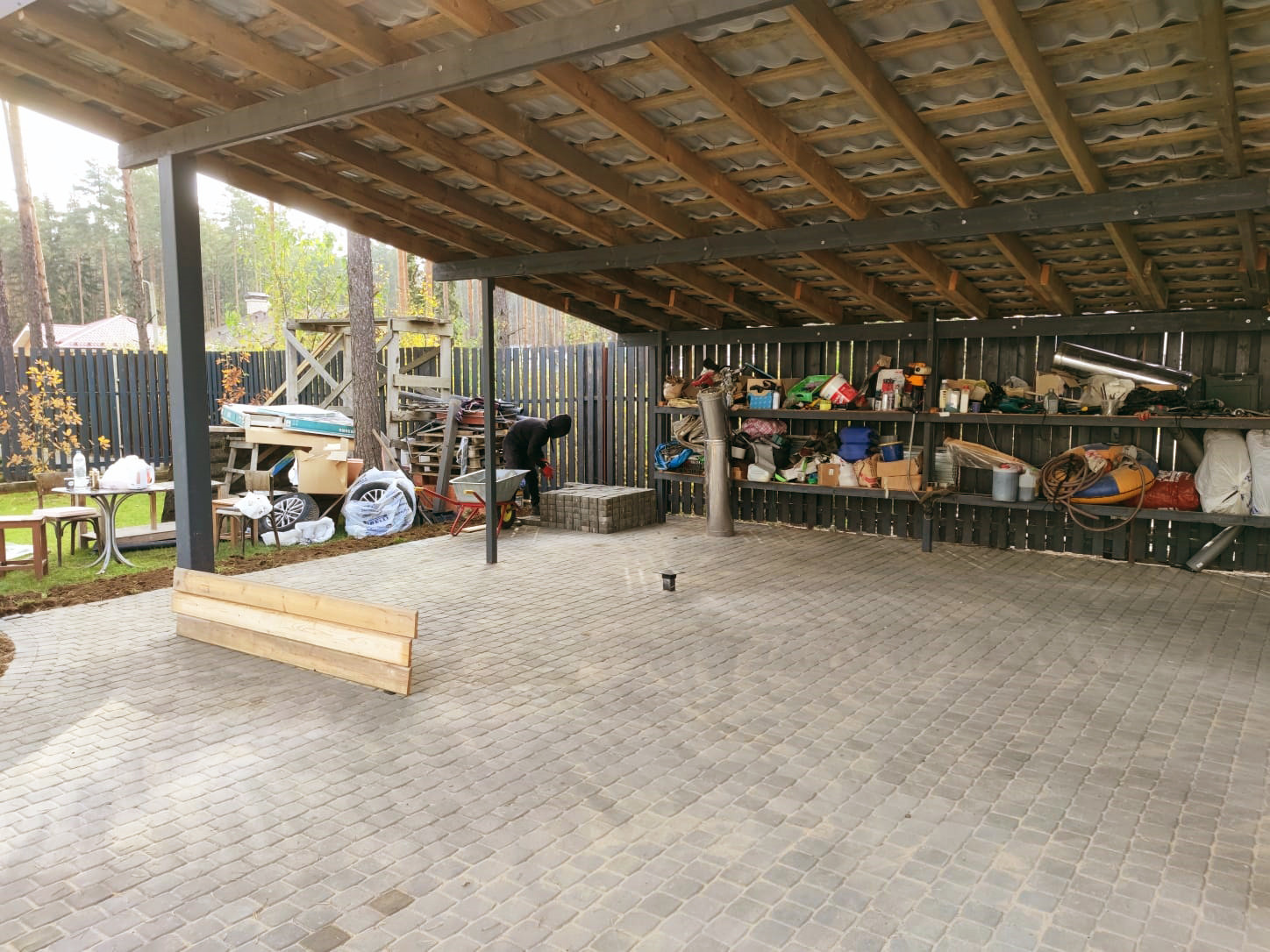 Участок замощен, имеется большой навес на три машины 7х14м