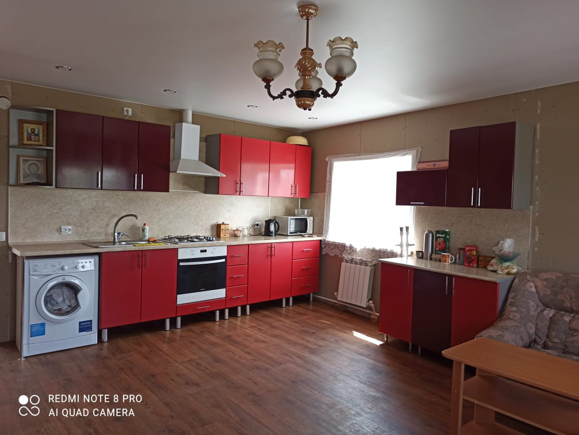 Второй этаж из бревна, утеплен площадью 112 м. кв., с основным входом со стороны улицы Ленина. Снаружи обшит пеноплэксом в два слоя на обрешетку с тепловым зазором 3 см. Внутри пред чистовая отделка, окна пластиковые, потолки натяжные. На этаже расположены просторная кухня-столовая, гостиная, 3 комнаты и совмещенные санузел и душевая кабина.