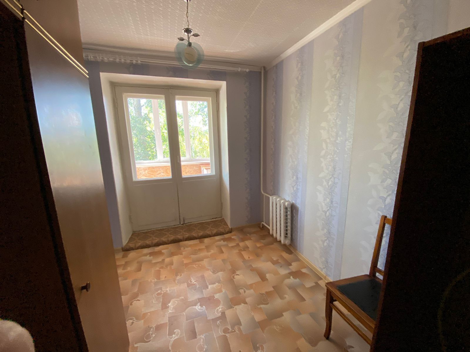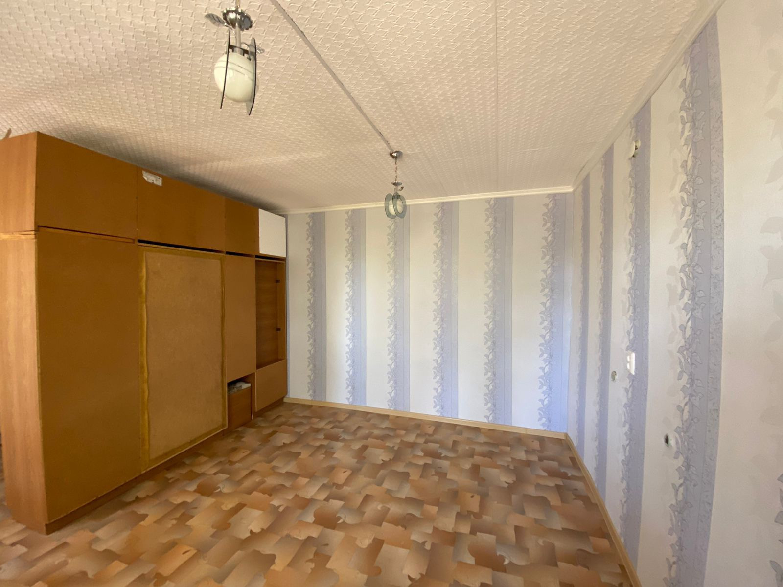Комната стоит пустая, готовая к заселению новых владельцев. Из мебели остается 2 шкафа при входе в комнату, показанных на фото.