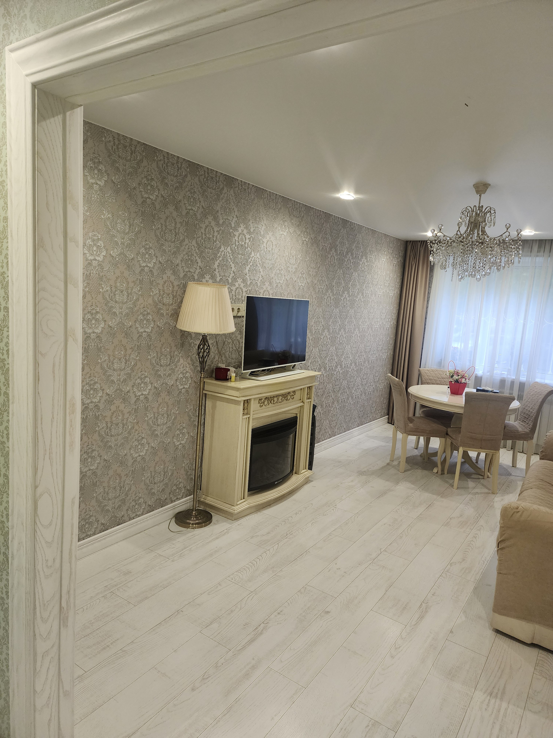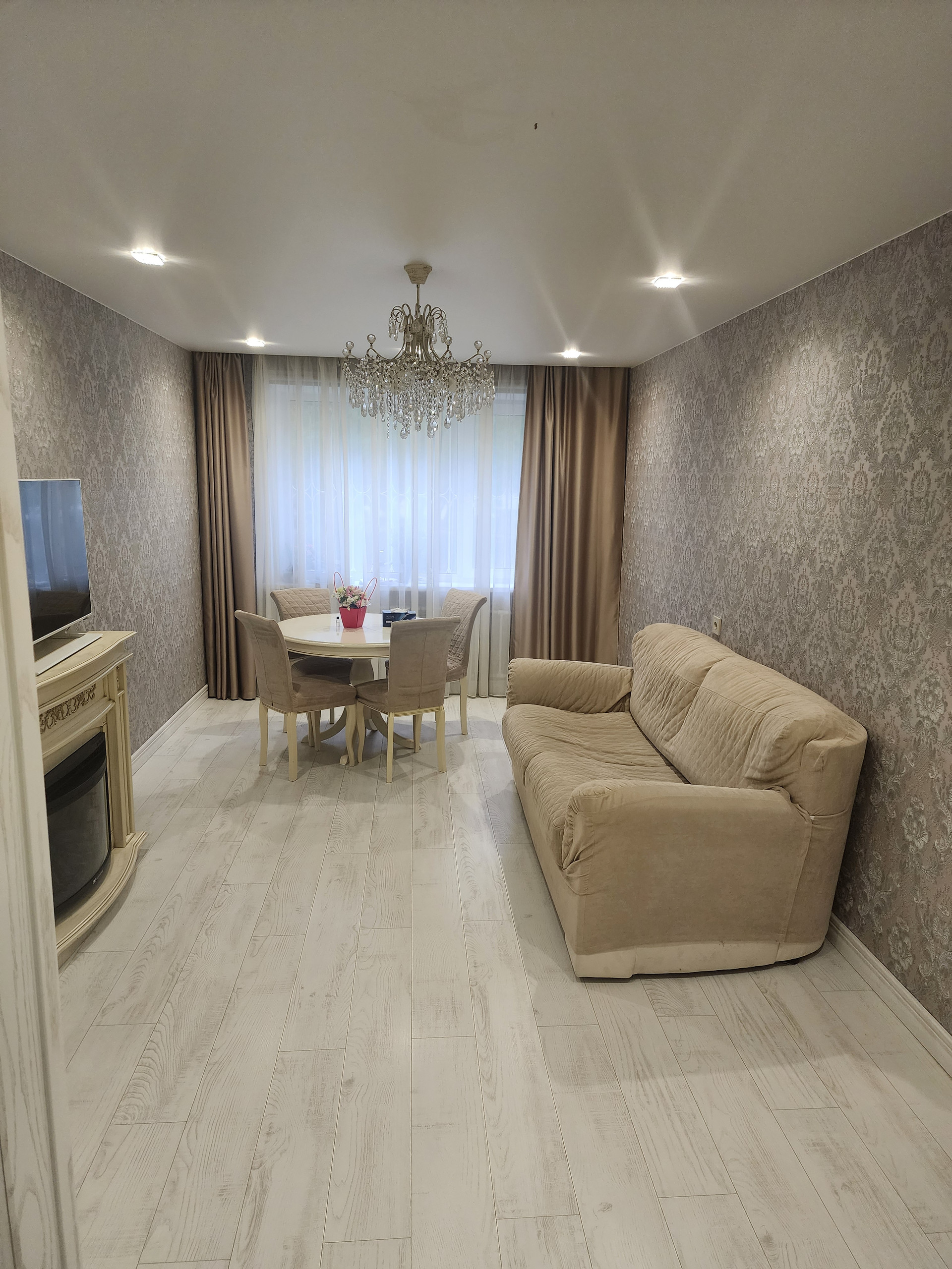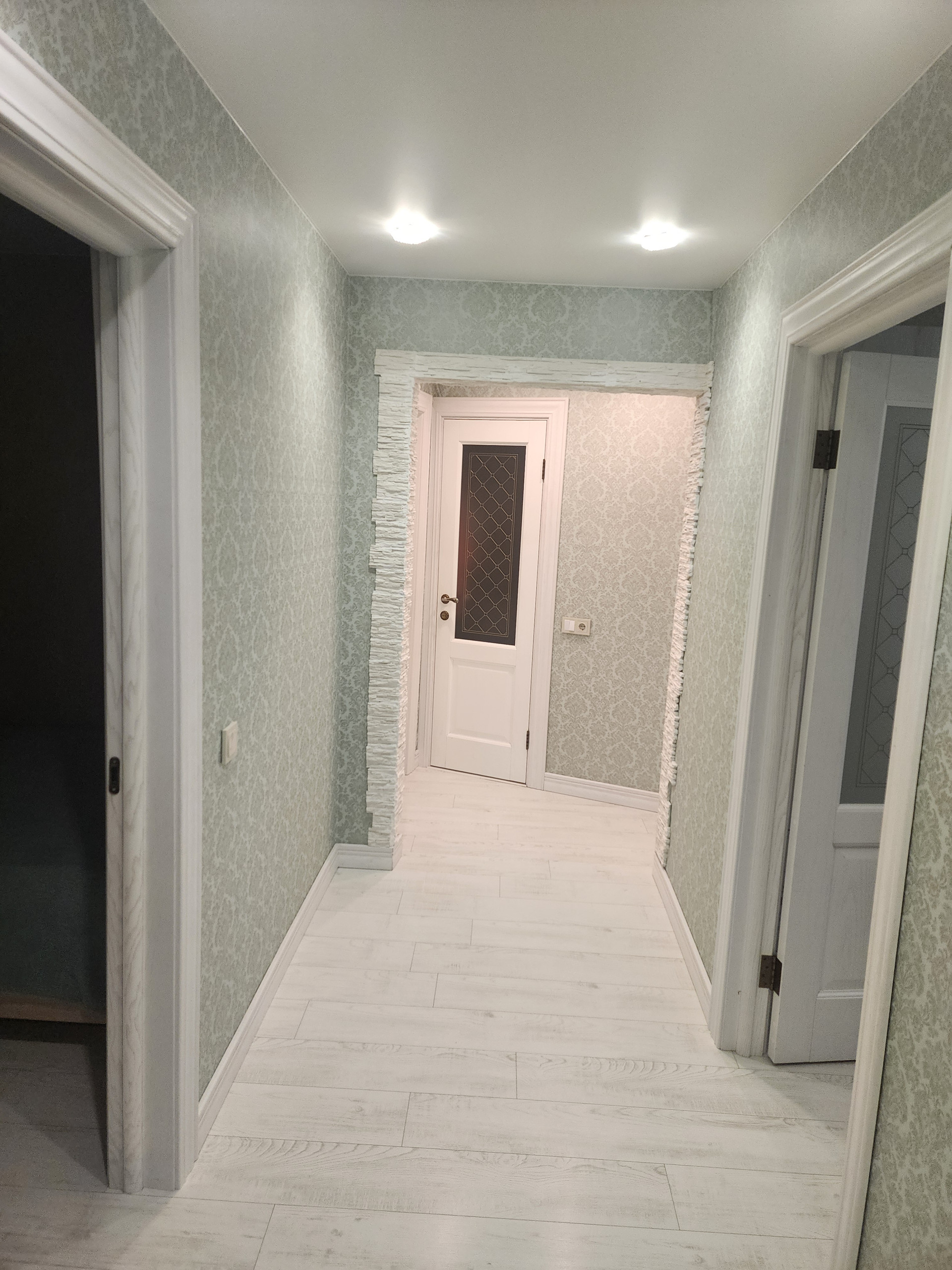 Выполнен ремонт: натяжные потолки, пол выровнен сухой стяжкой, пол идеально ровный, ламинат, двери и плинтус из массива, всё в светлых тонах. Комнаты очень просторные.
