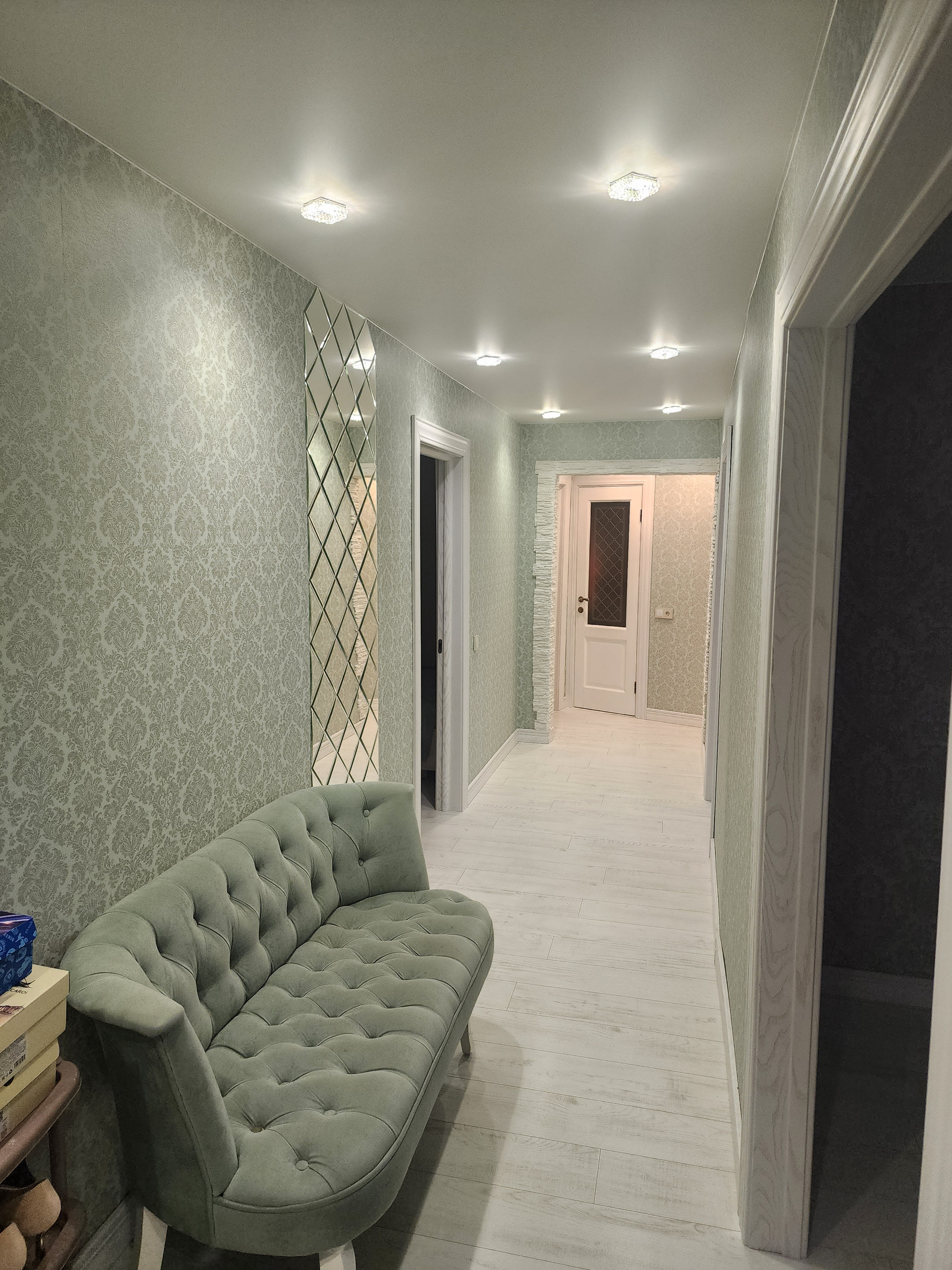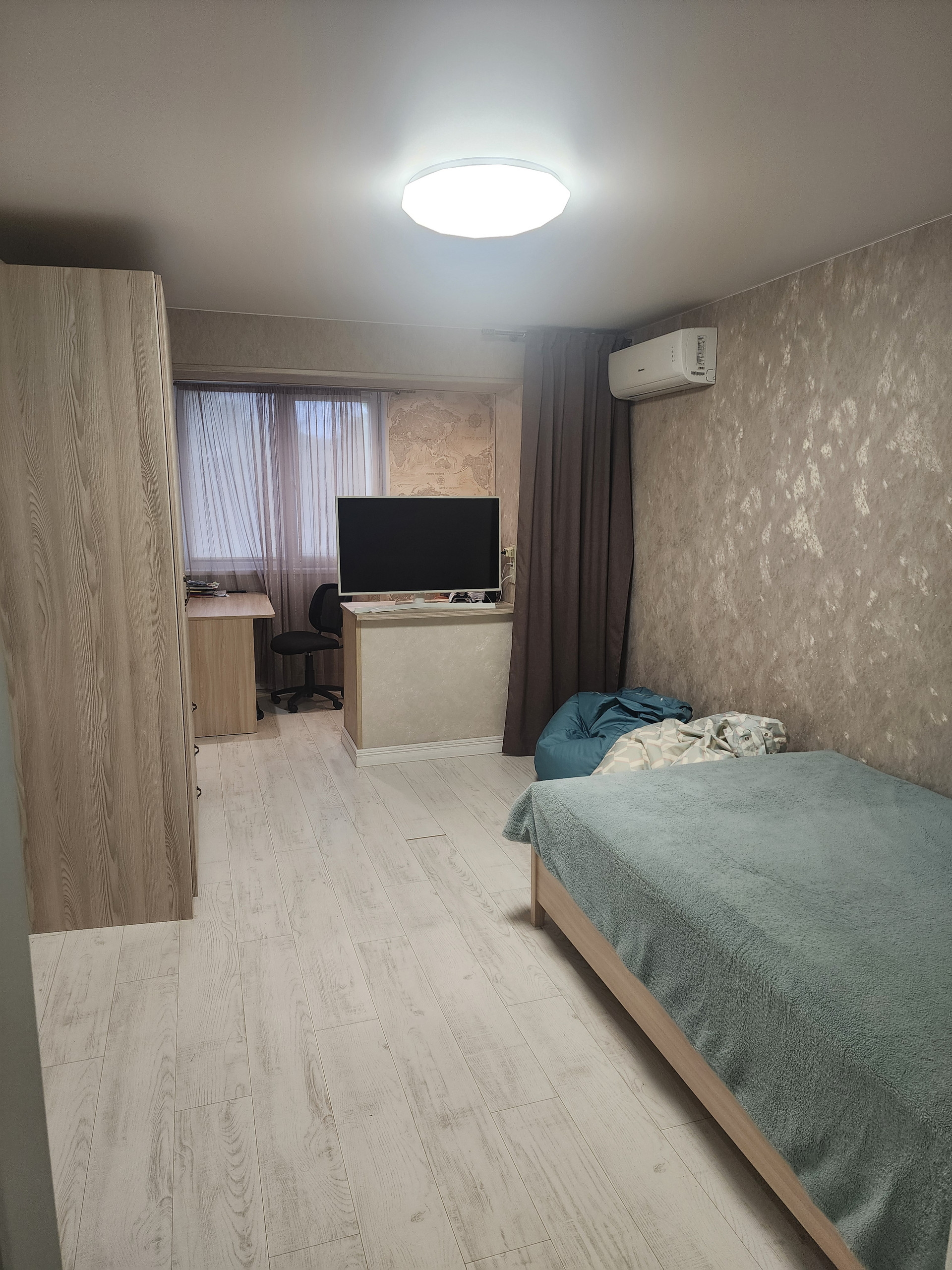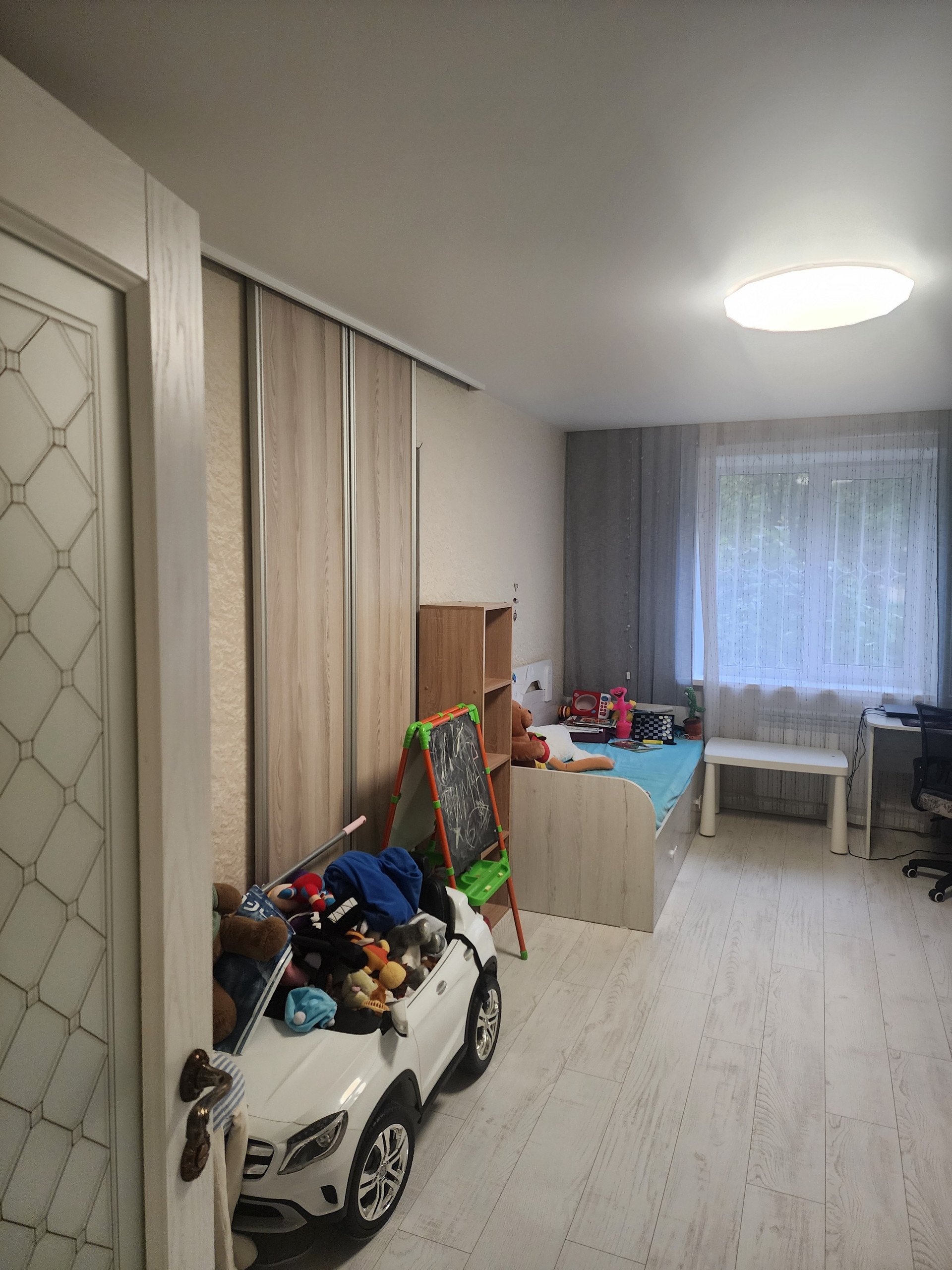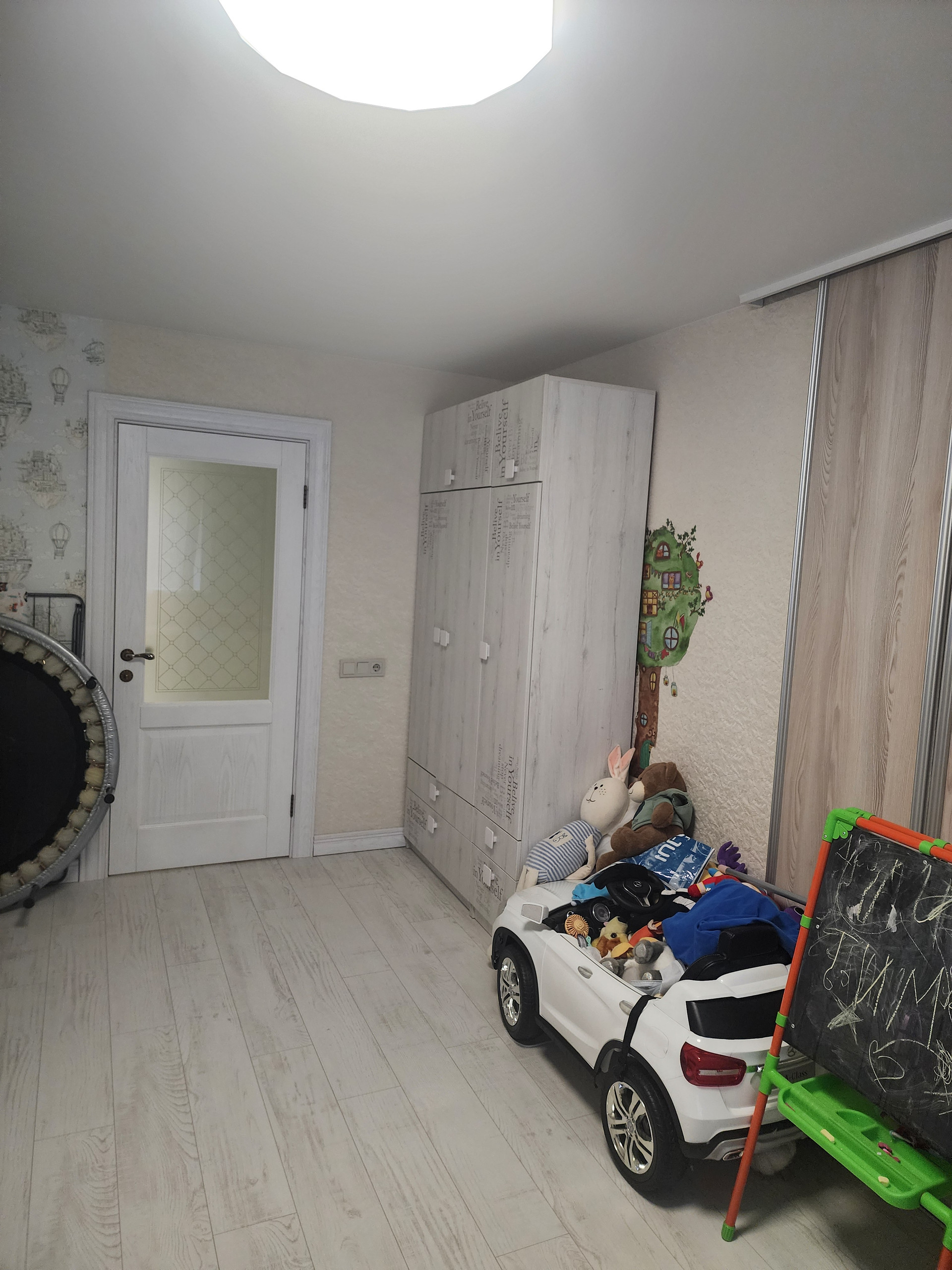 Выполнен ремонт: натяжные потолки, пол выровнен сухой стяжкой, пол идеально ровный, ламинат, двери и плинтус из массива, всё в светлых тонах. Комнаты очень просторные.