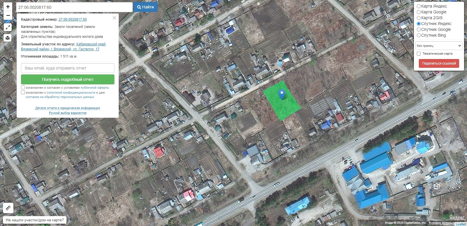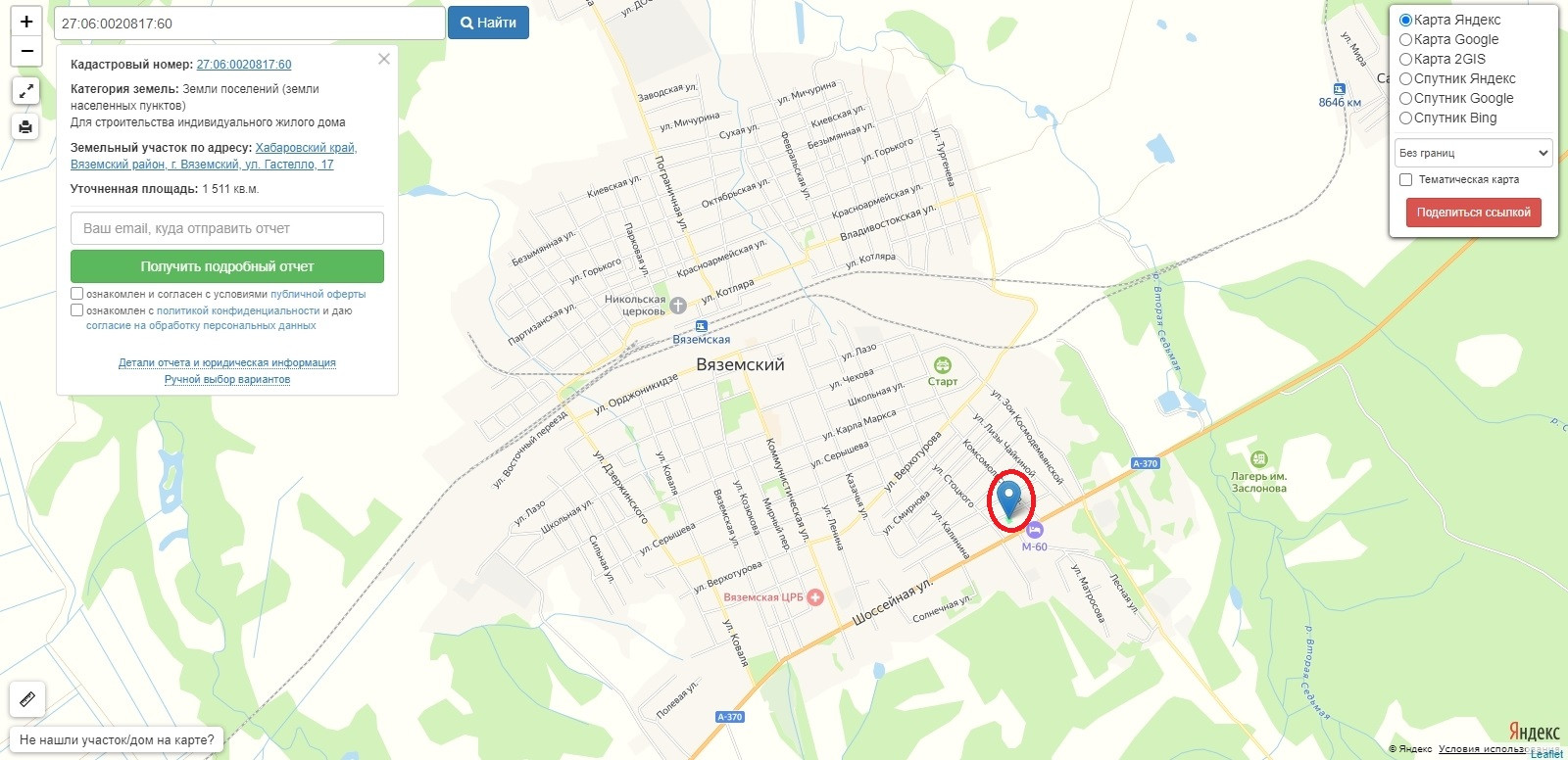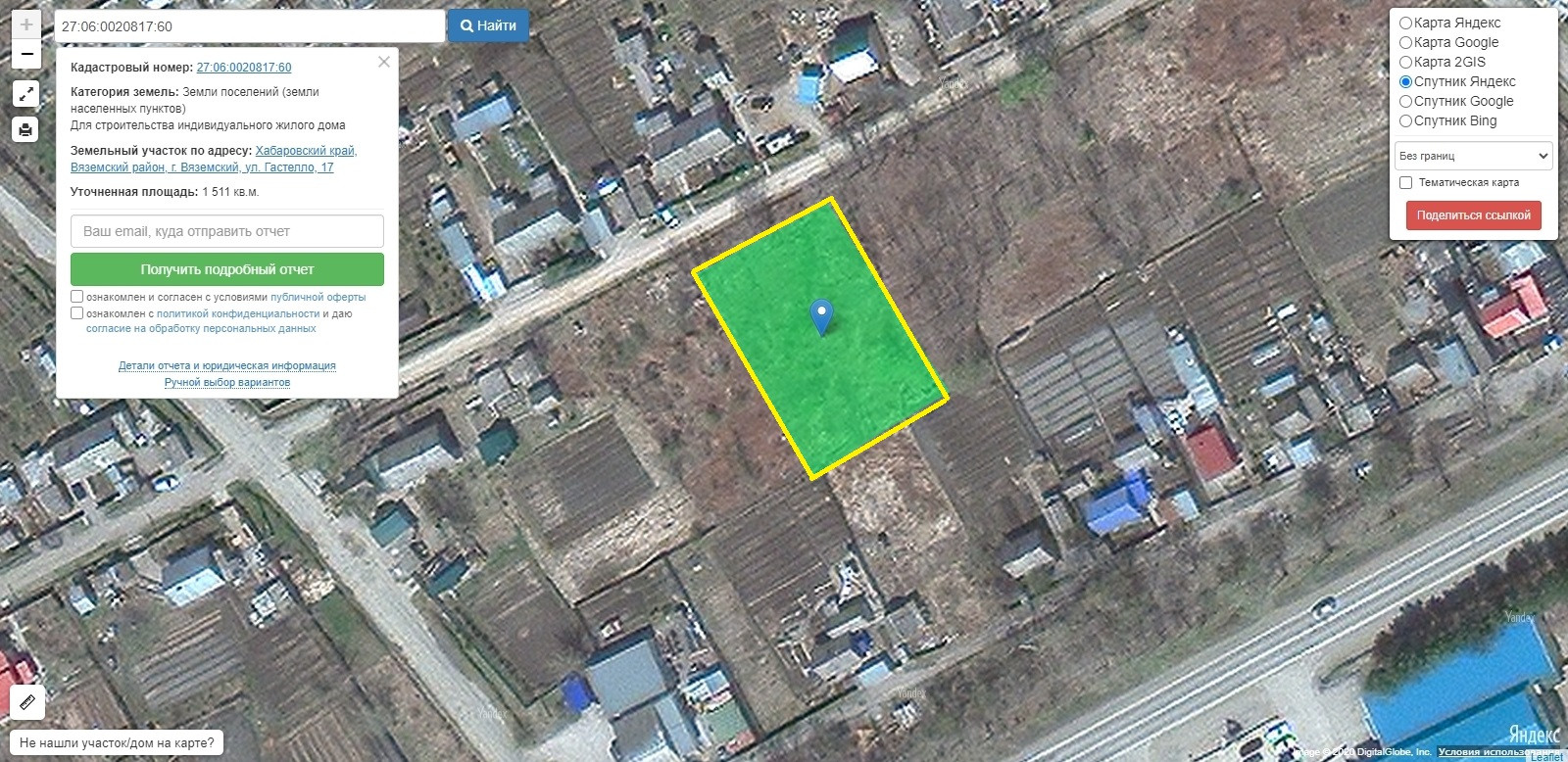 От собственника продаётся земельный участок площадью 1511 кв.м. Адрес: Хабаровский край, г. Вяземский, ул. Гастелло, 17.  КН  27:06:0020817:60  Земли ИЖС. Координаты участка на Яндекс карте/навигаторе  47.526368, 134.777011  Метка на карте здесь соответствует действительности, участок виден на ПКК и на космоснимках, просьба осмотр провести самостоятельно. Без обременений. Торг, ипотека возможны.