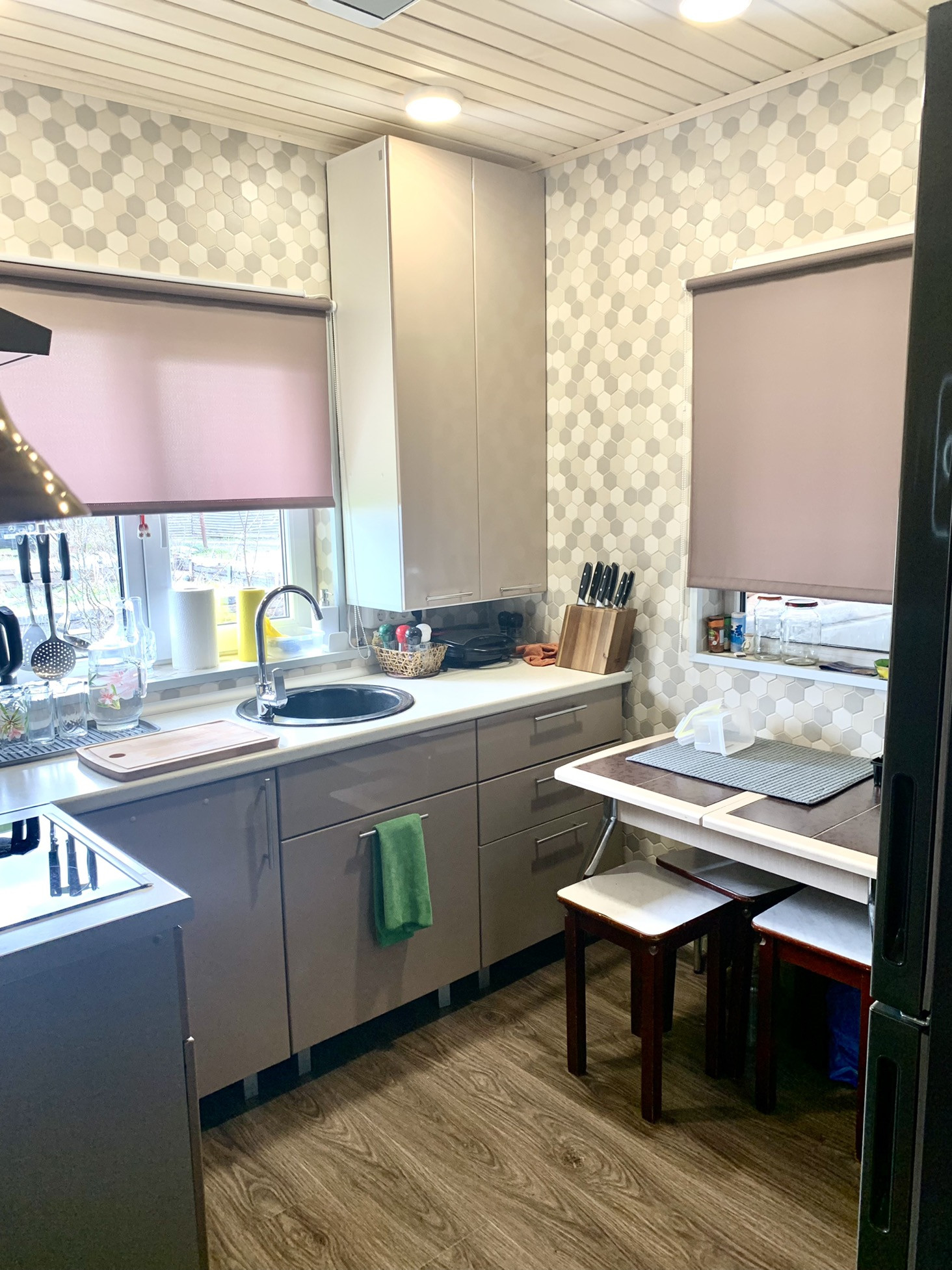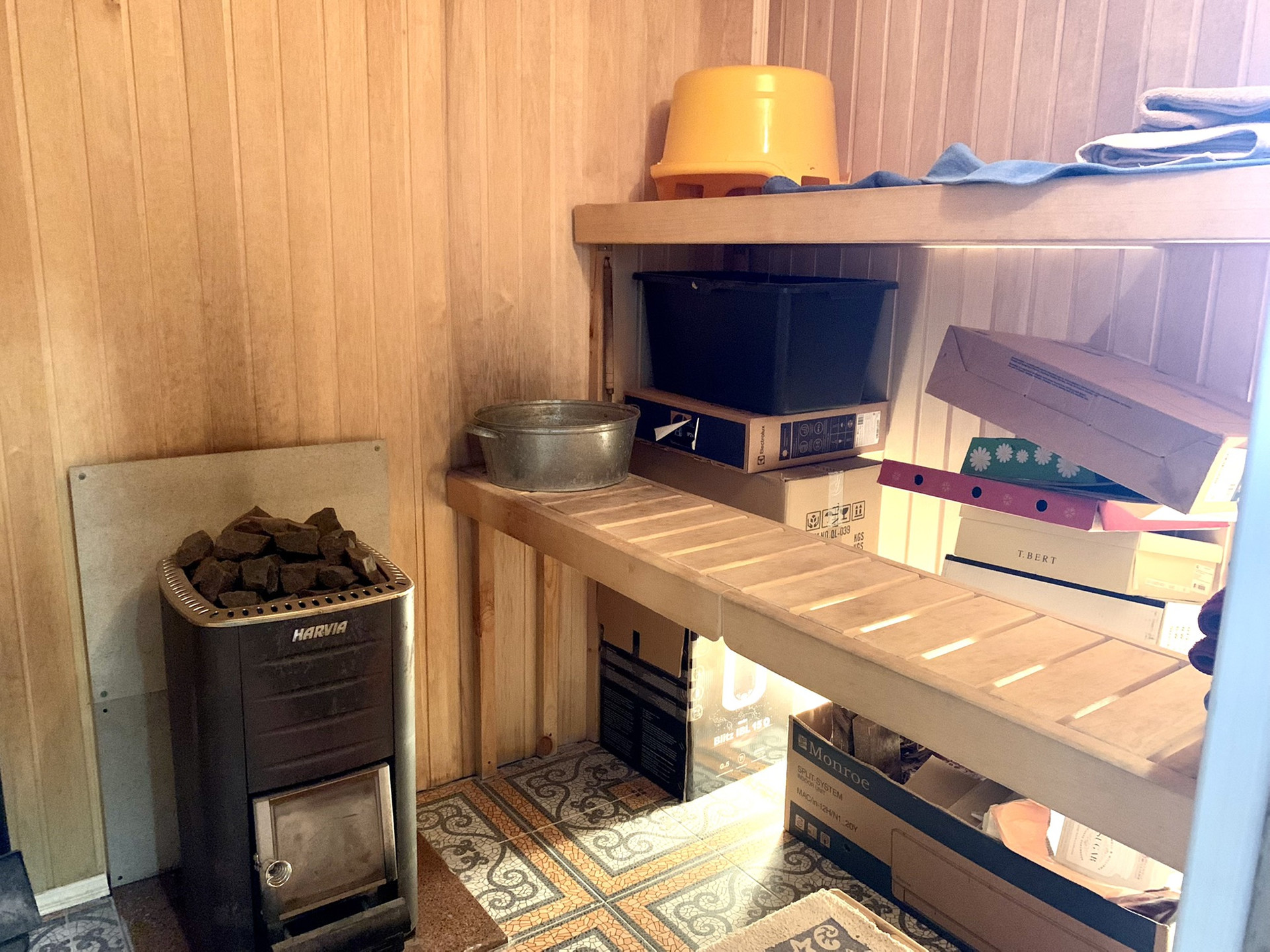 Первый этаж : стены комнаты первого этажа - гипрок и обои. Сауна - вагонка из осины на стенах и потолке. Пол в сауне и душевой - керамогранит. Стены в душевой - кафель. Стены на кухне - керамомозаика. Потолки во всех помещениях первого этажа - вагонка из осины.